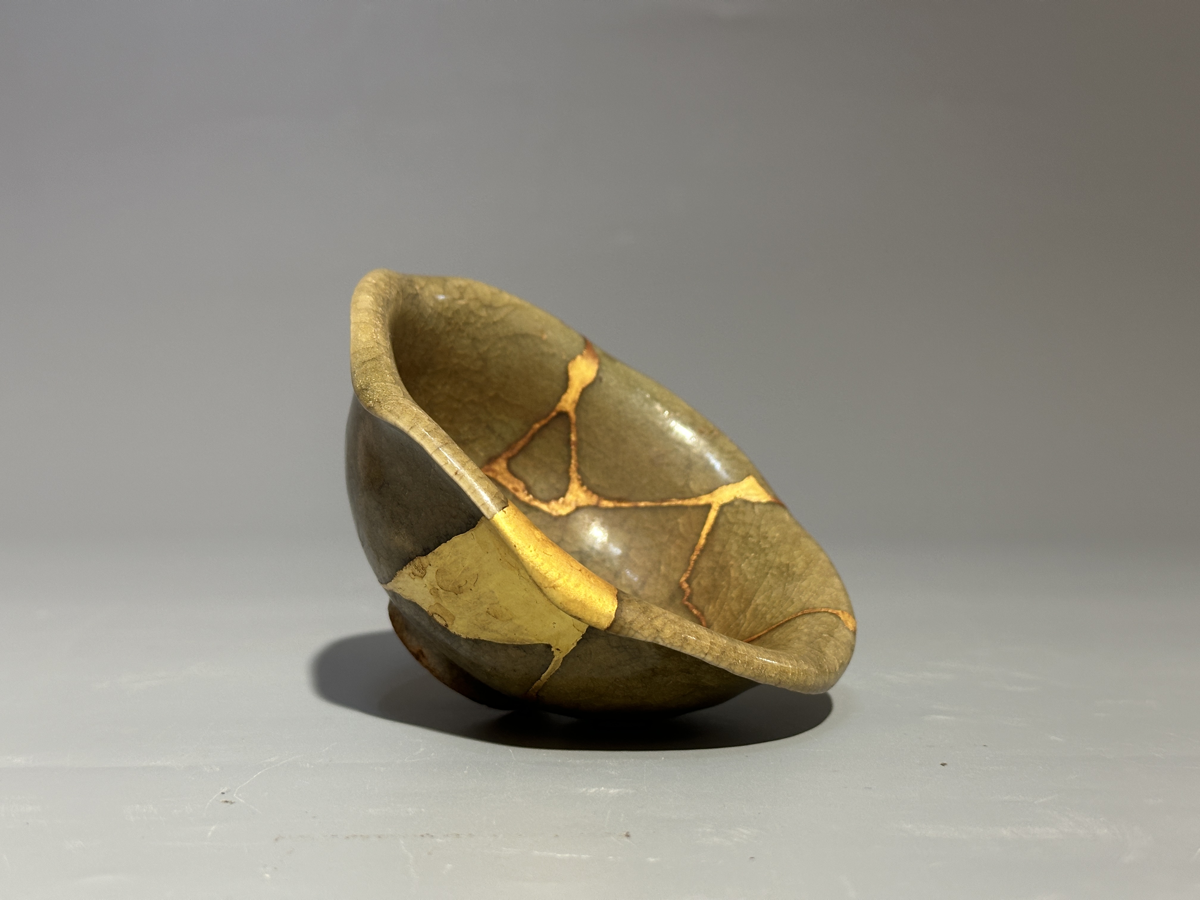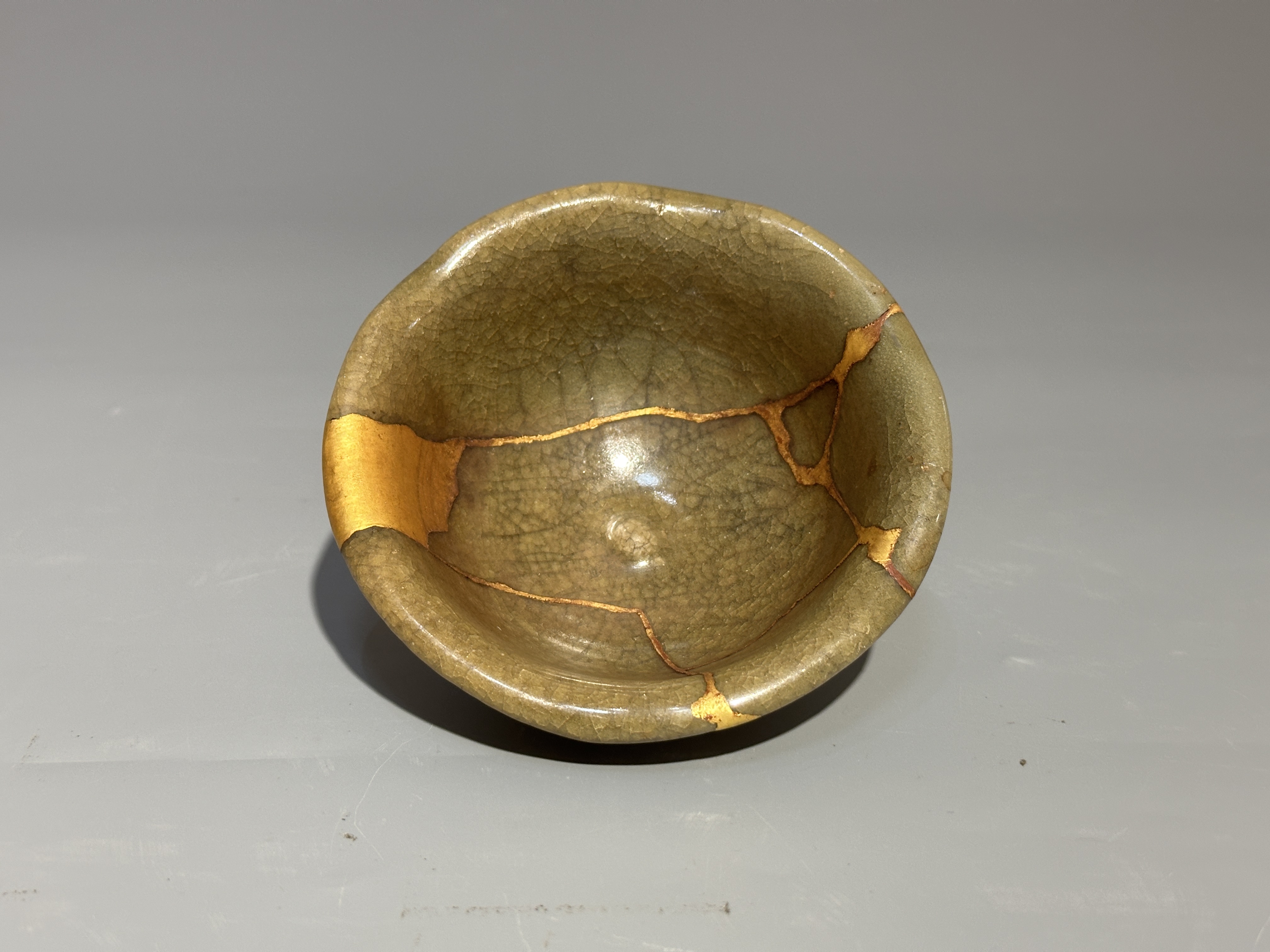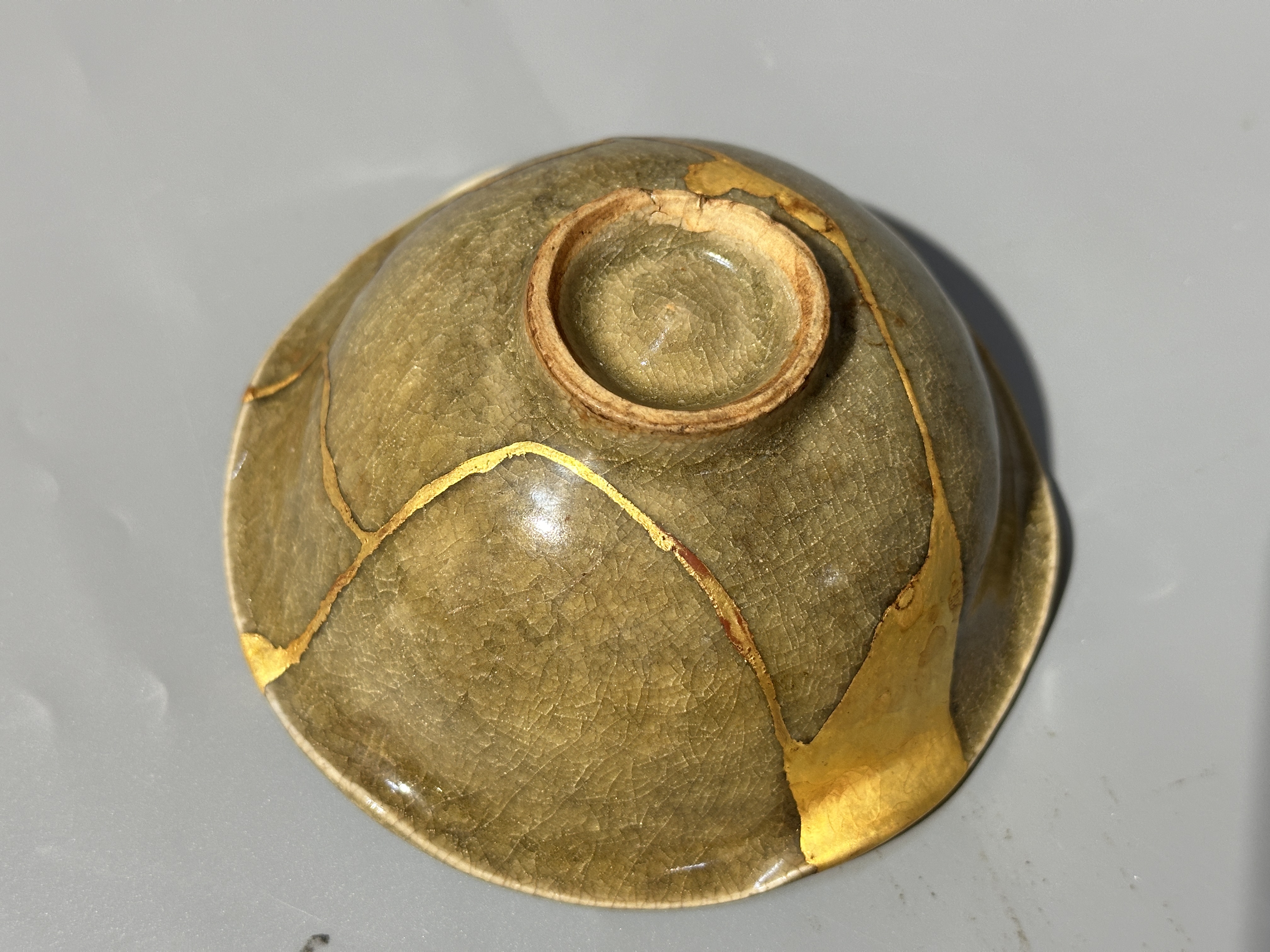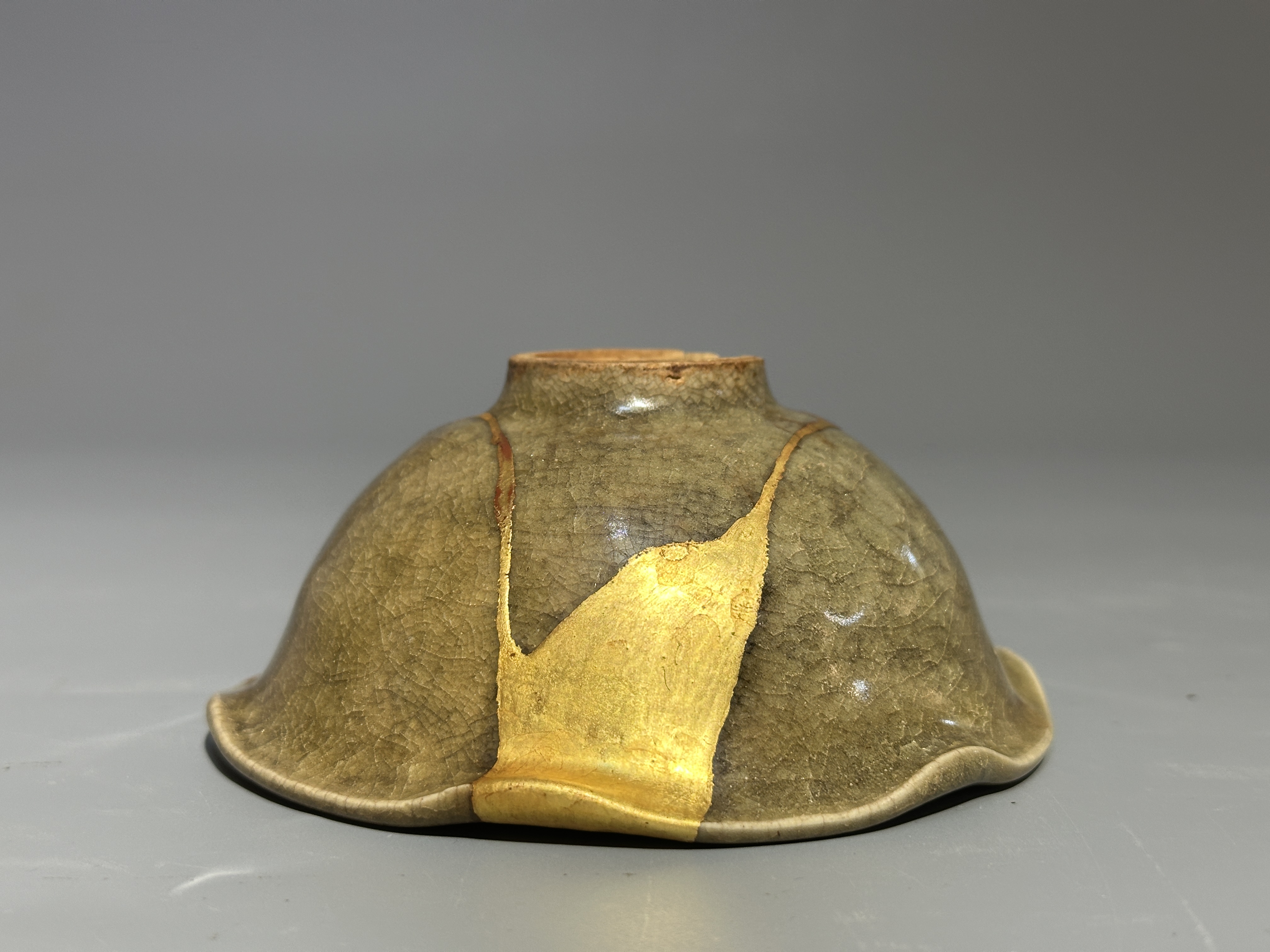 此盞造型古樸典雅,斂口,弧腹飽滿,口沿作別致的波浪起伏狀,宛如一朵綻放的秋菊,線條靈動而富有韻律。通體施深色醬釉或鐵鏽釉,釉色沉靜,光澤溫潤內斂。最為珍貴之處,在於盞身歷經歲月,已由古老的“金繕”技藝精心修復。
