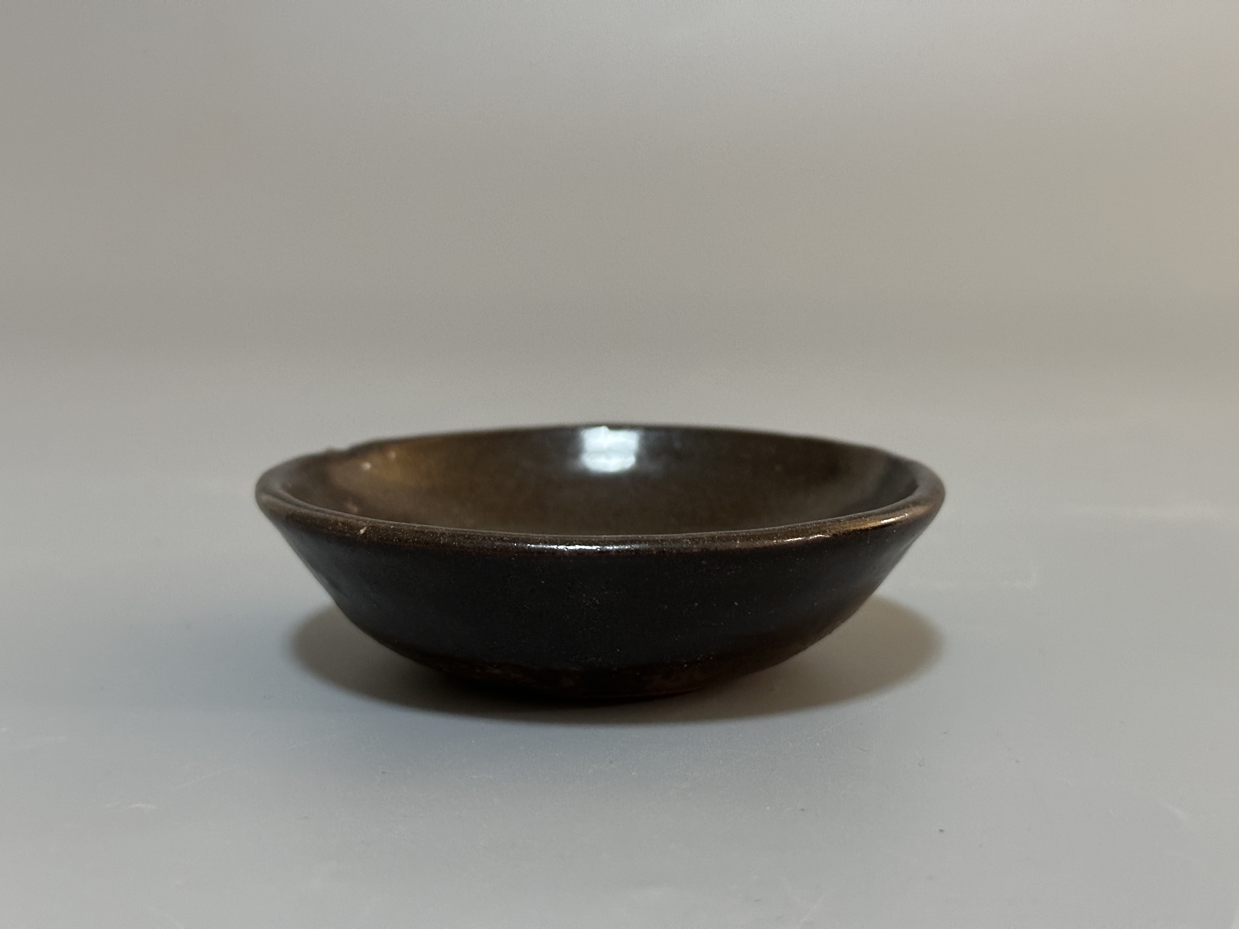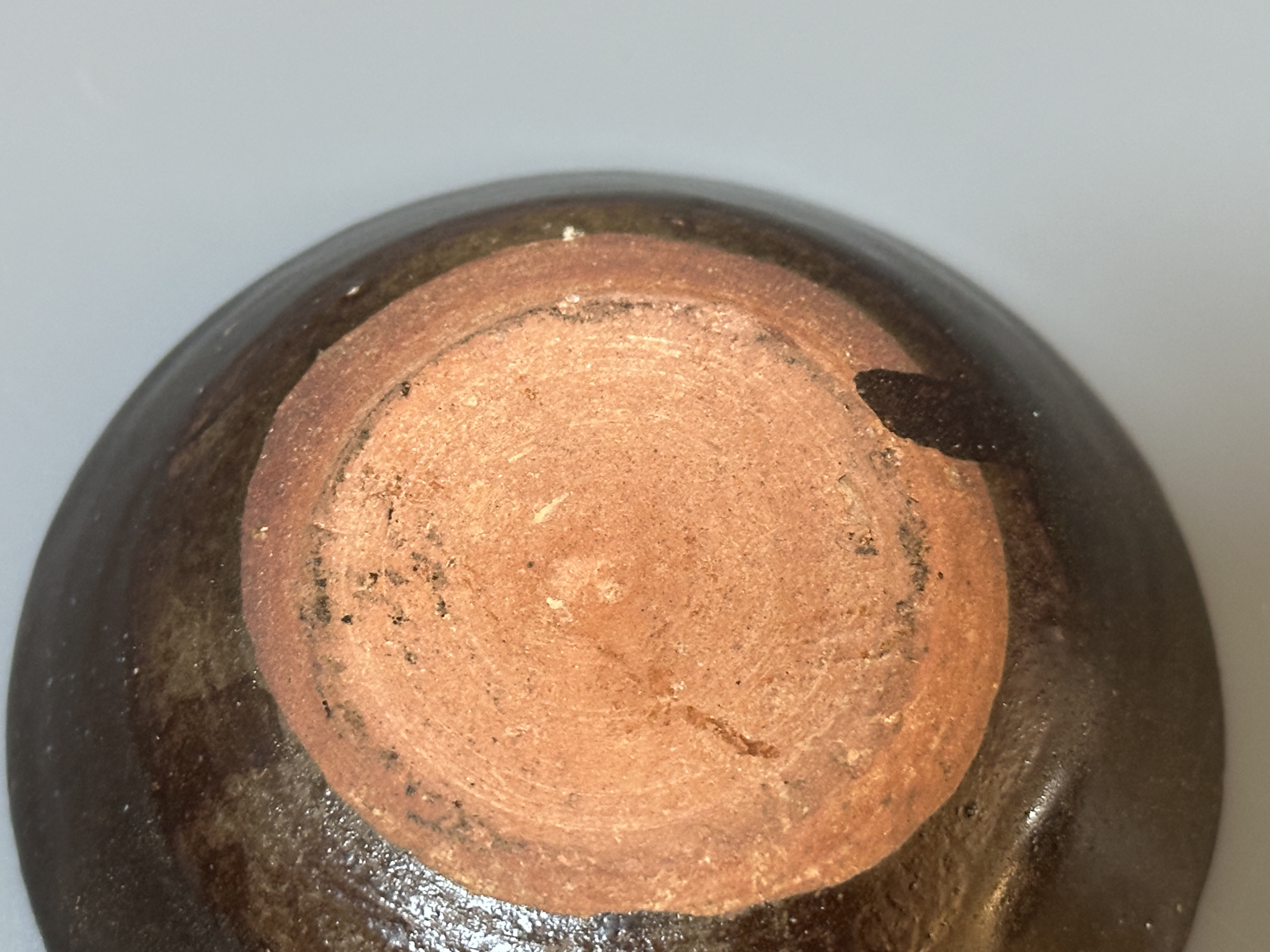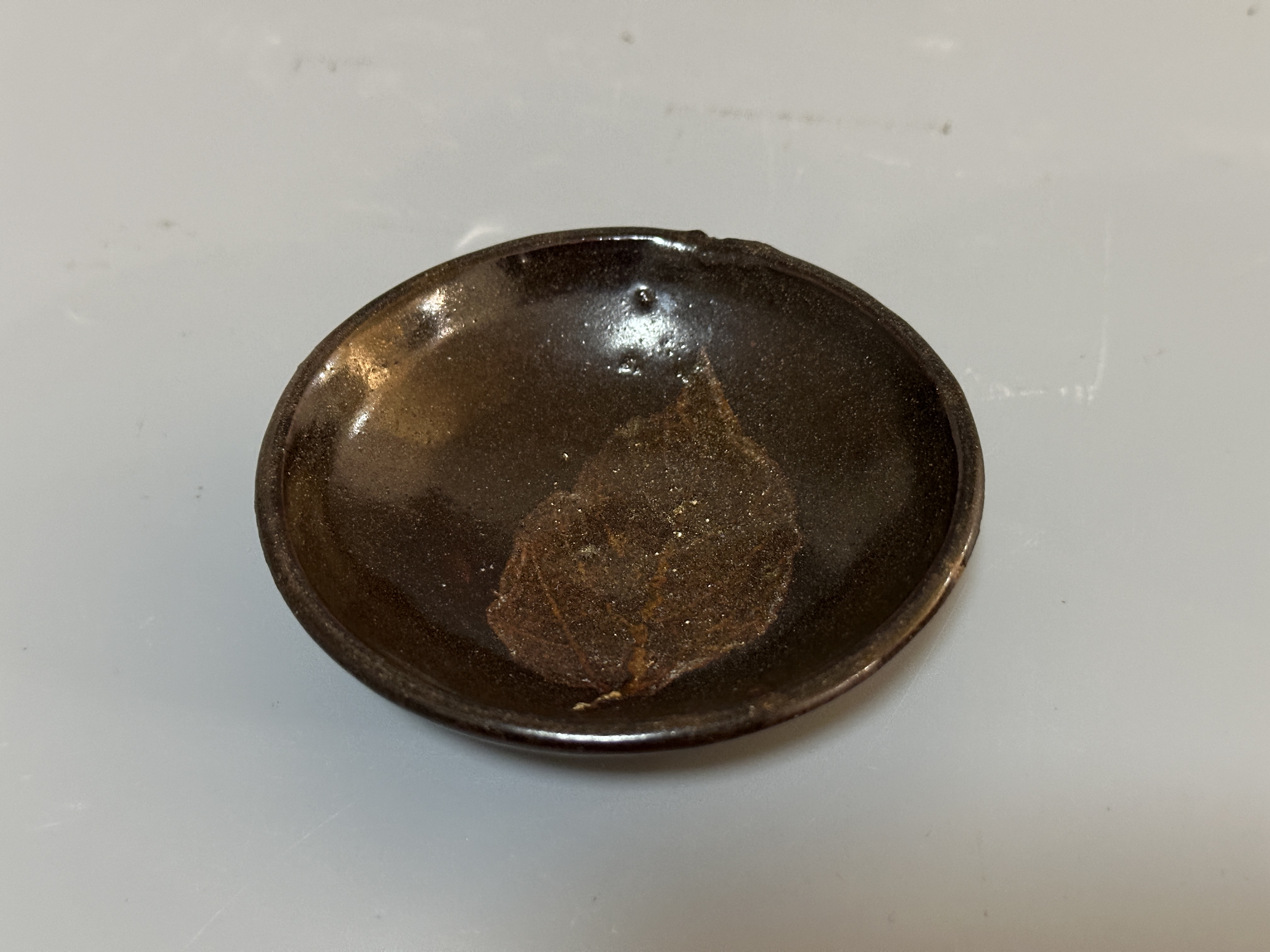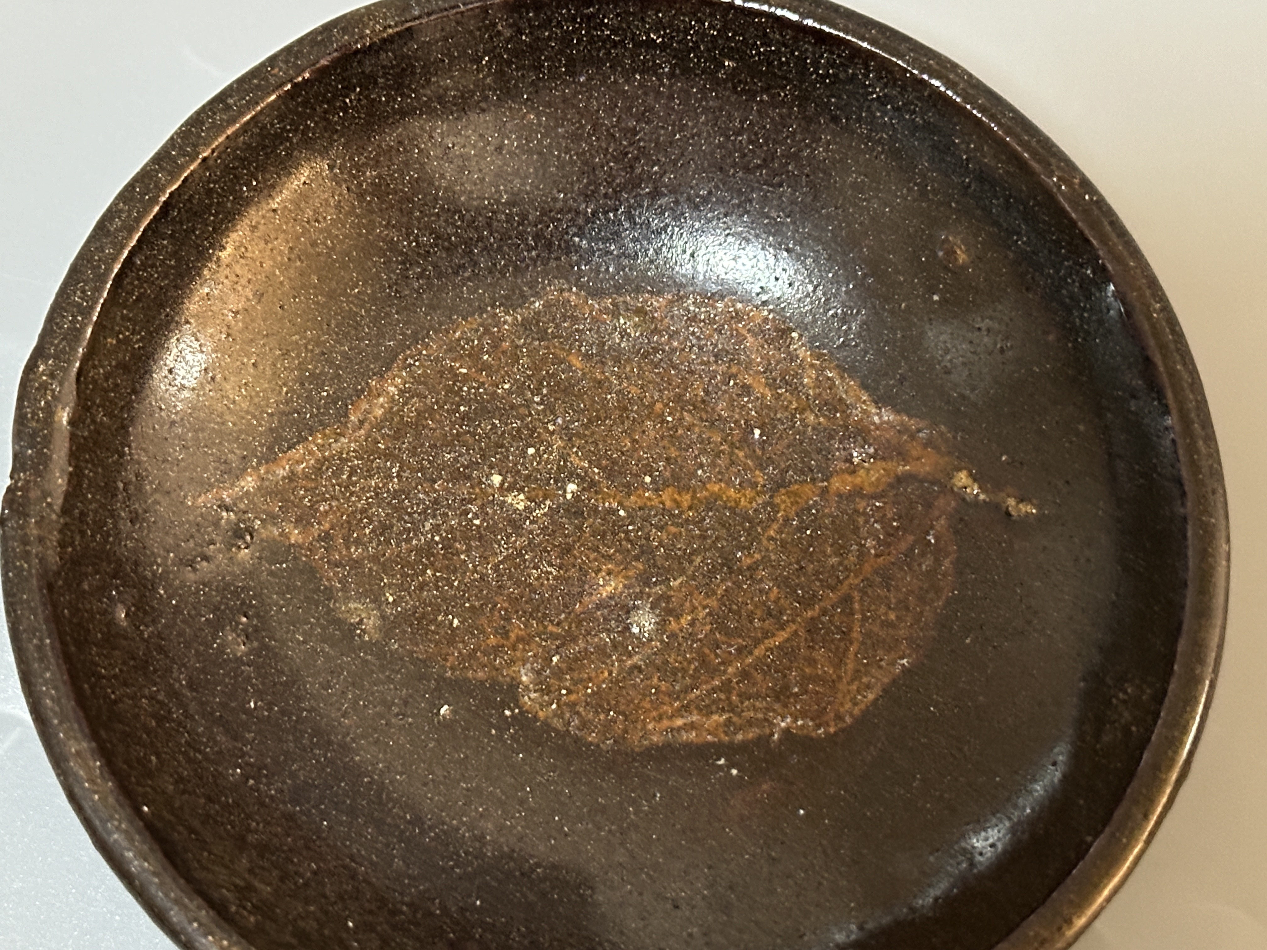 此盞為宋代吉州窯經典木葉天目器。盞形規整,斂口,弧腹飽滿,胎骨堅實。內外通施黑褐色釉,釉色沉靜如夜,光澤溫潤。其最精妙之處在於盞內裝飾:一片真實的桑葉經特殊工藝貼合釉麵,高溫燒製後,葉形與脈絡纖毫畢現,葉莖分明,宛如一片秋葉永恆凝駐於深邃的夜空之中,體現了天人合一的自然哲思與高超的窯火幻化技藝。