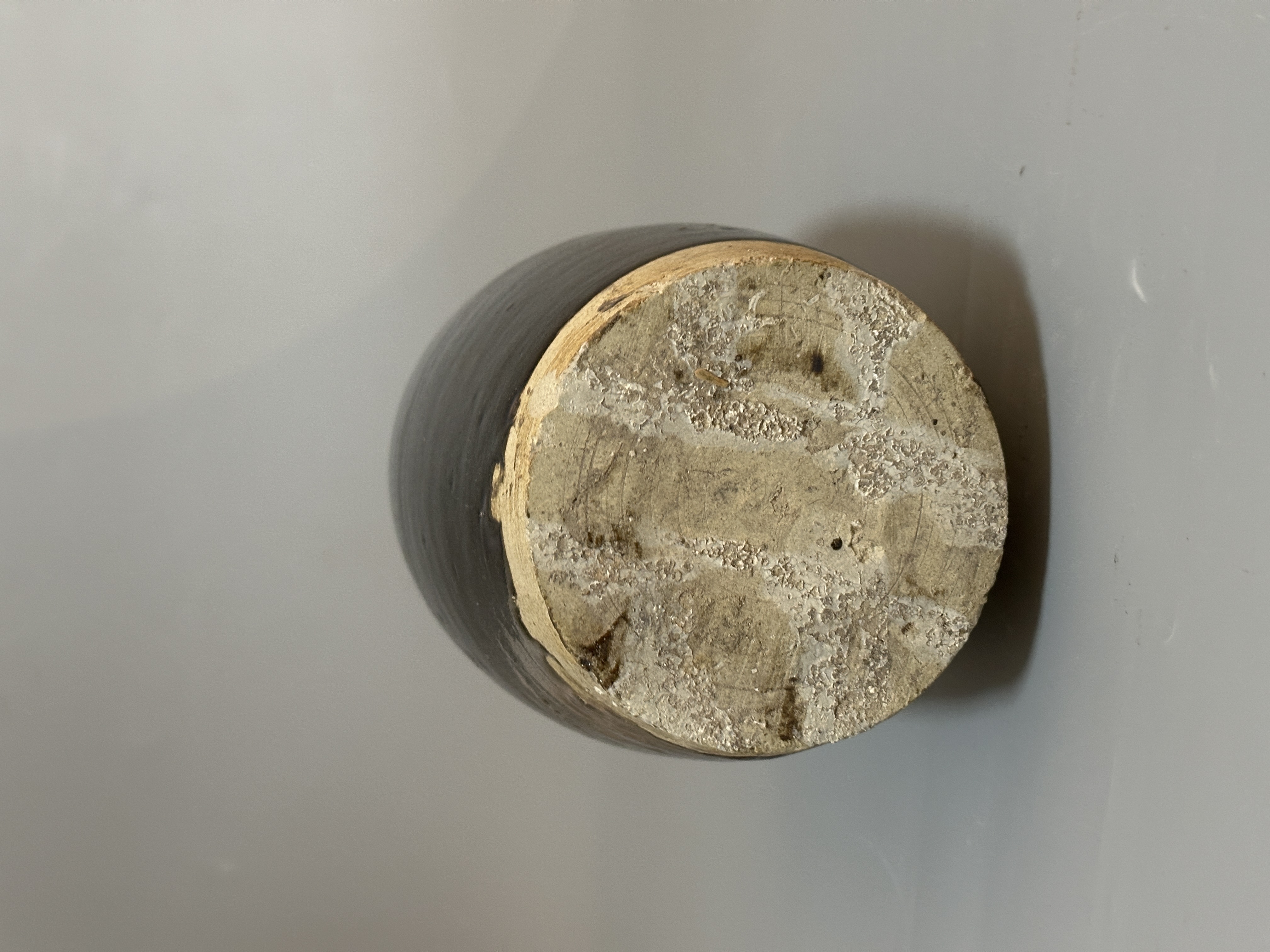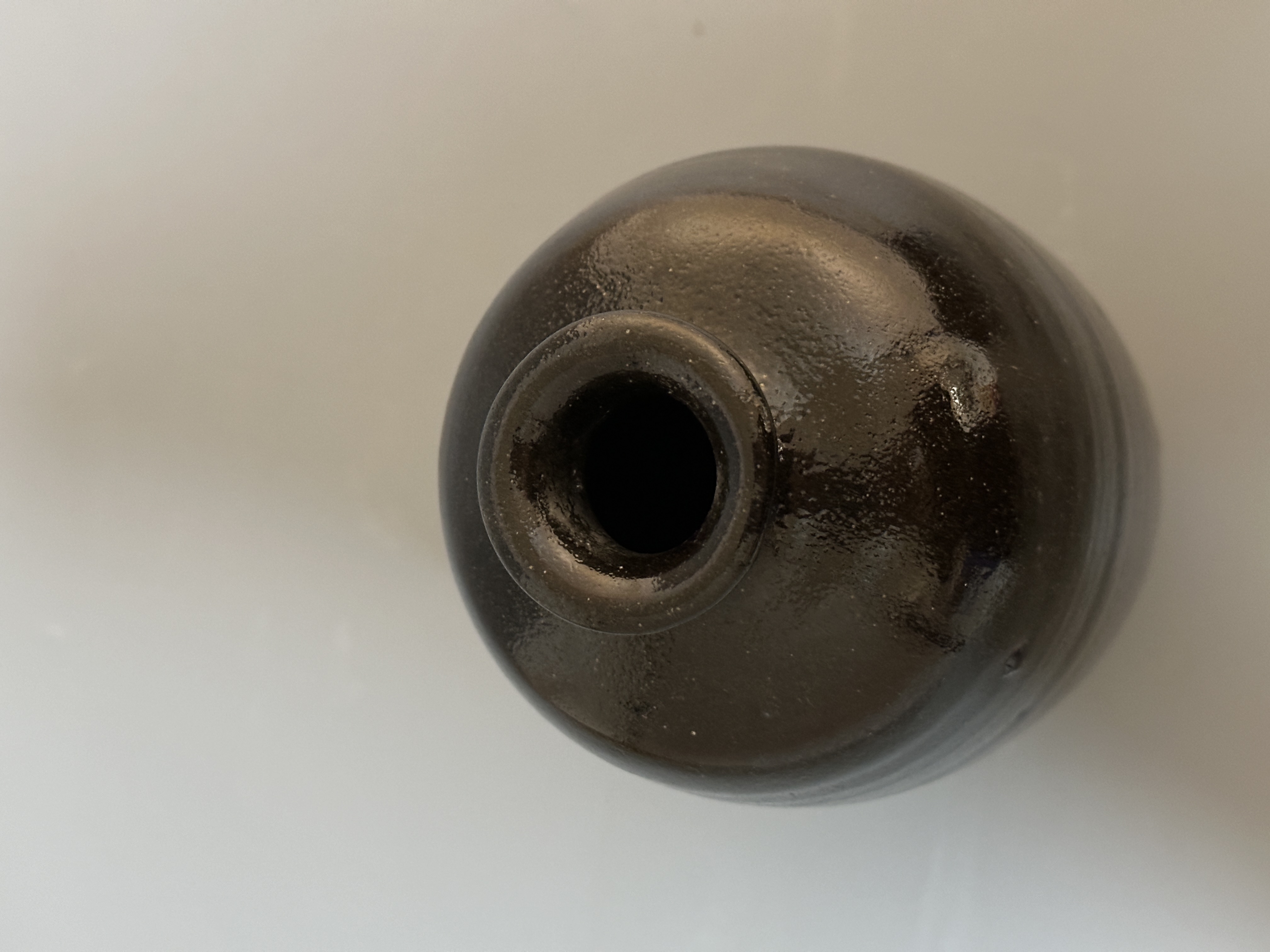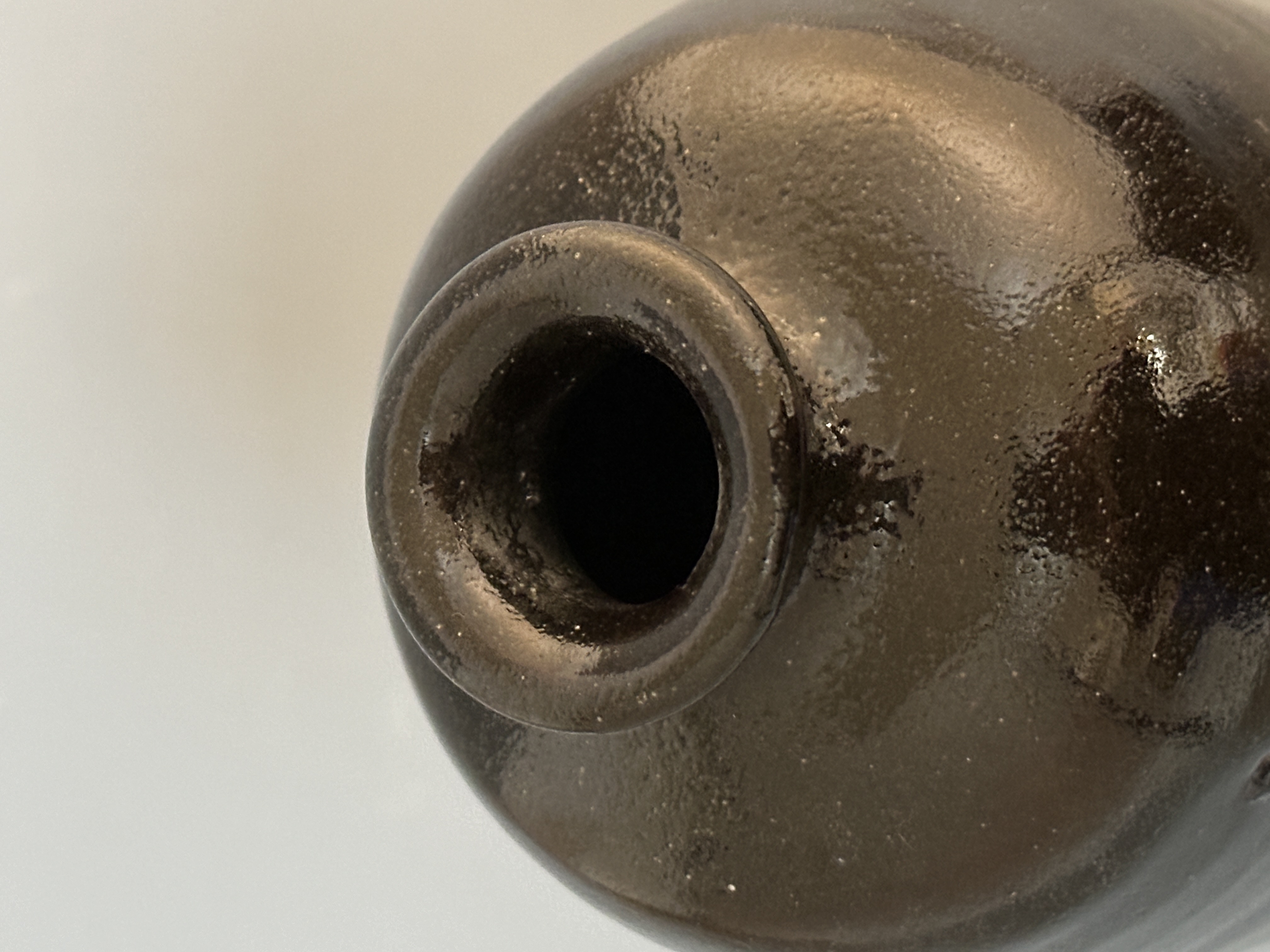 此件梅瓶造型挺拔秀頎,為經典小口梅瓶制式。唇口微撇,短頸豐肩,腹部向下漸收,線條流暢而富有張力,器形飽滿穩重。通體施醬釉,釉色勻淨深沉,呈赭褐色,釉麪肥潤,光澤柔和內斂,展現出單色釉純淨古樸之美。足底露胎,胎質堅實,可見淘洗細膩,火石紅自然。