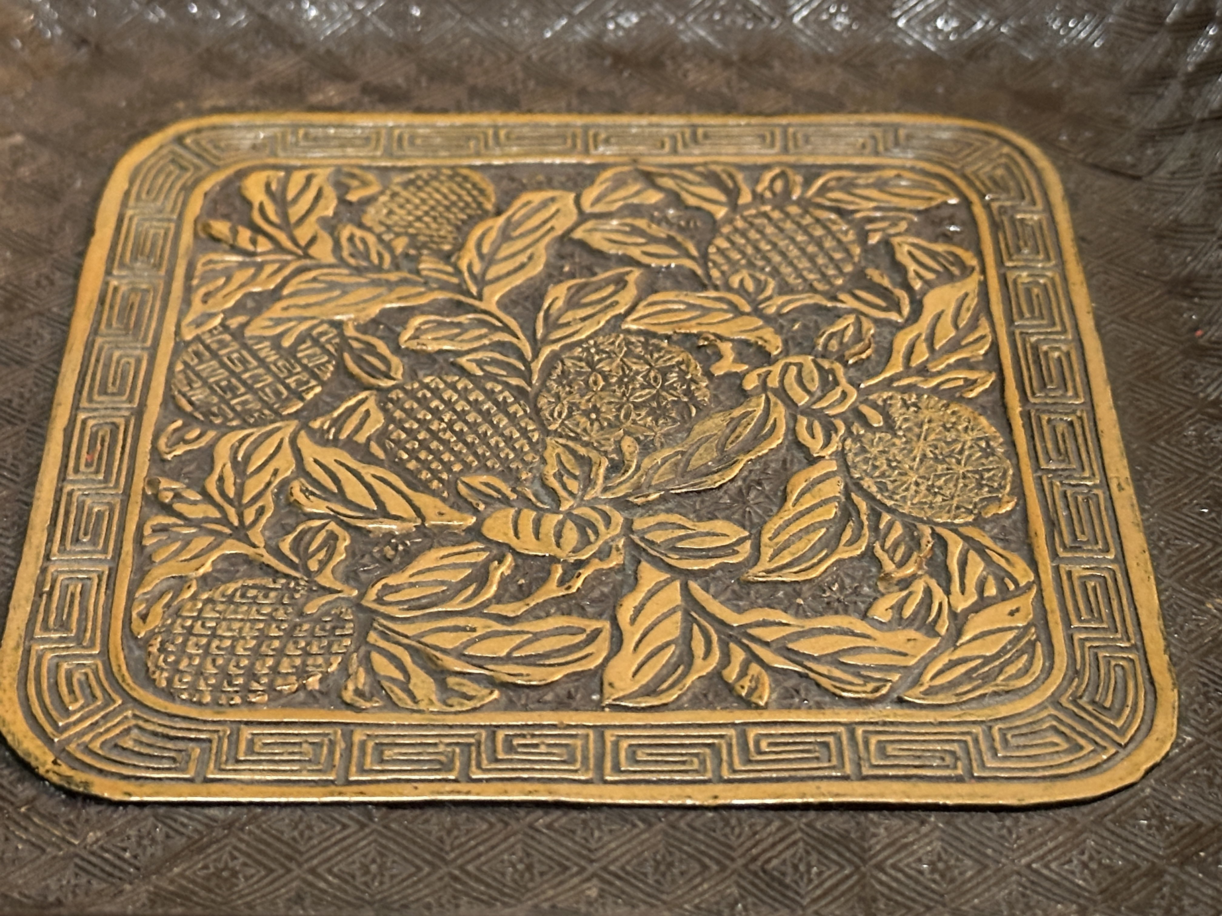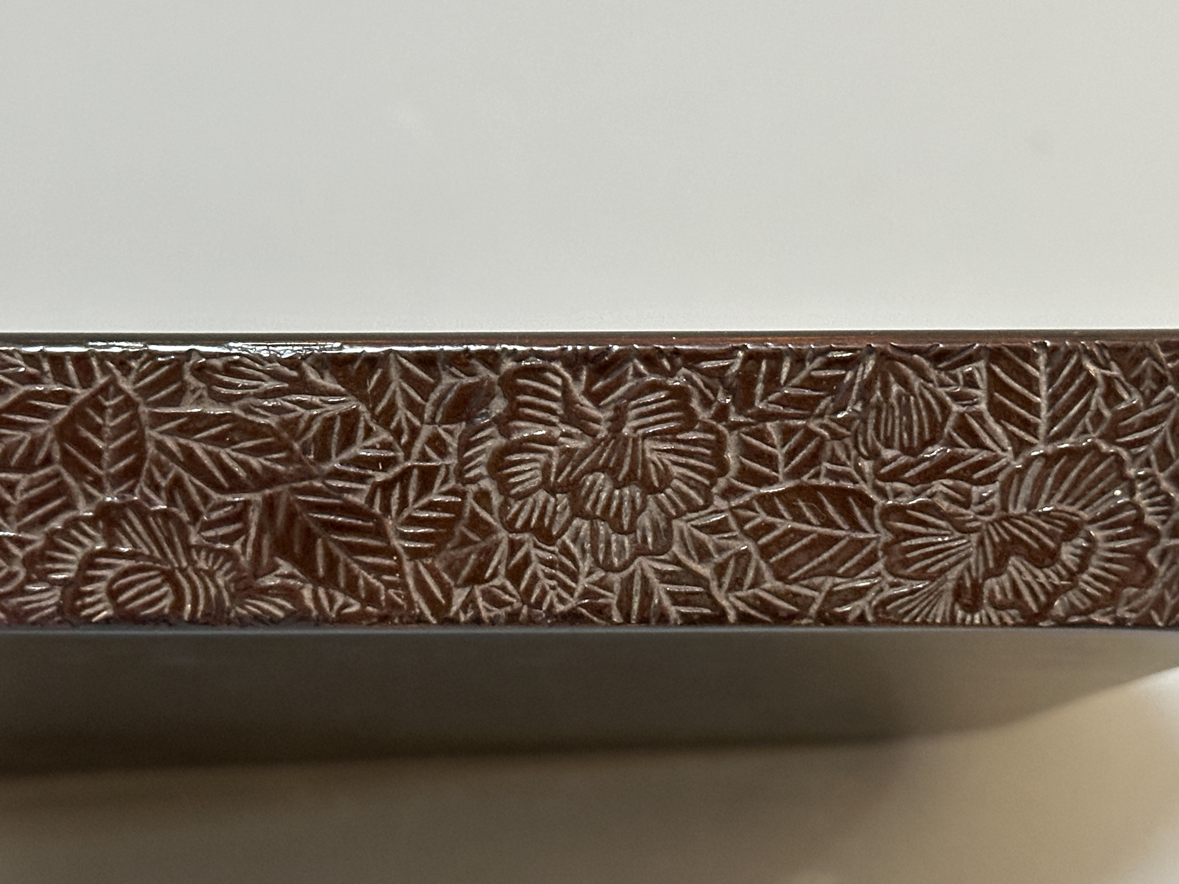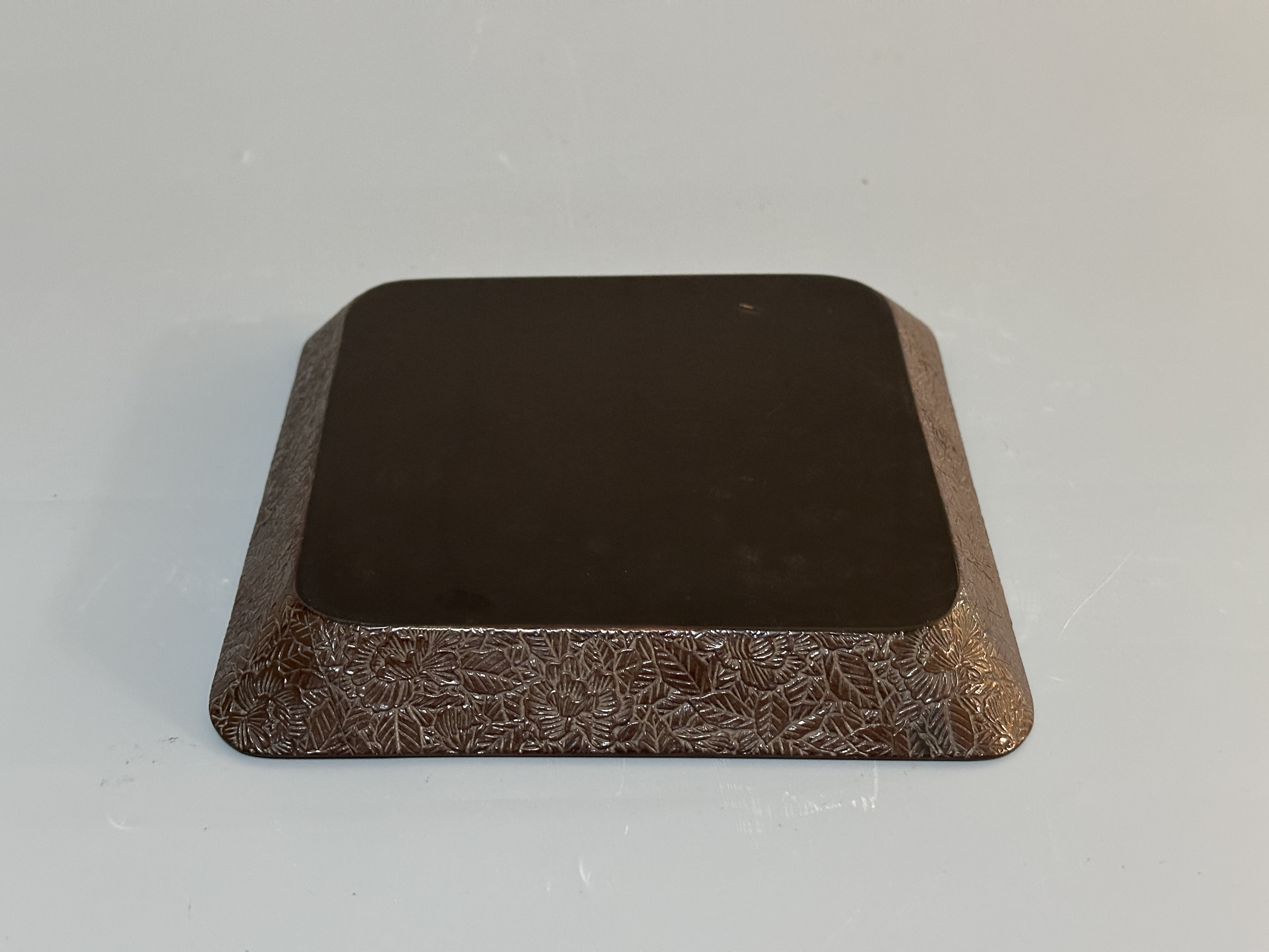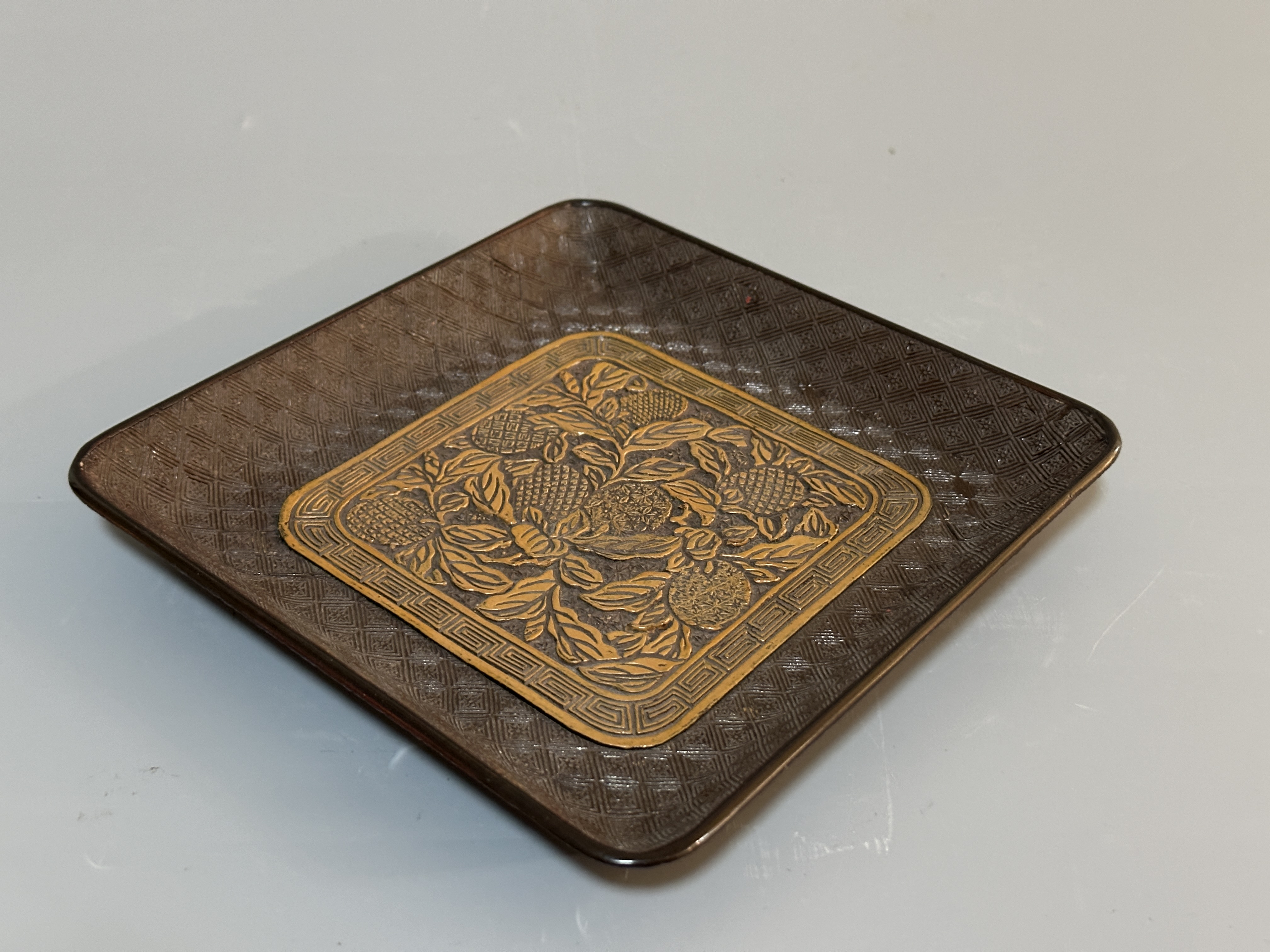 此托盤形制規整,作四方造型,轉角圓潤,線條挺拔而含蓄。通體髹深棕色大漆,漆色沉穩如墨,表面光澤溫潤,質地厚重。盤心嵌方形金色區域,以戧金或描金工藝,精繪纏枝花卉紋樣,枝葉婉轉靈動,花朵飽滿豐妍,邊緣飾以工緻的回紋。