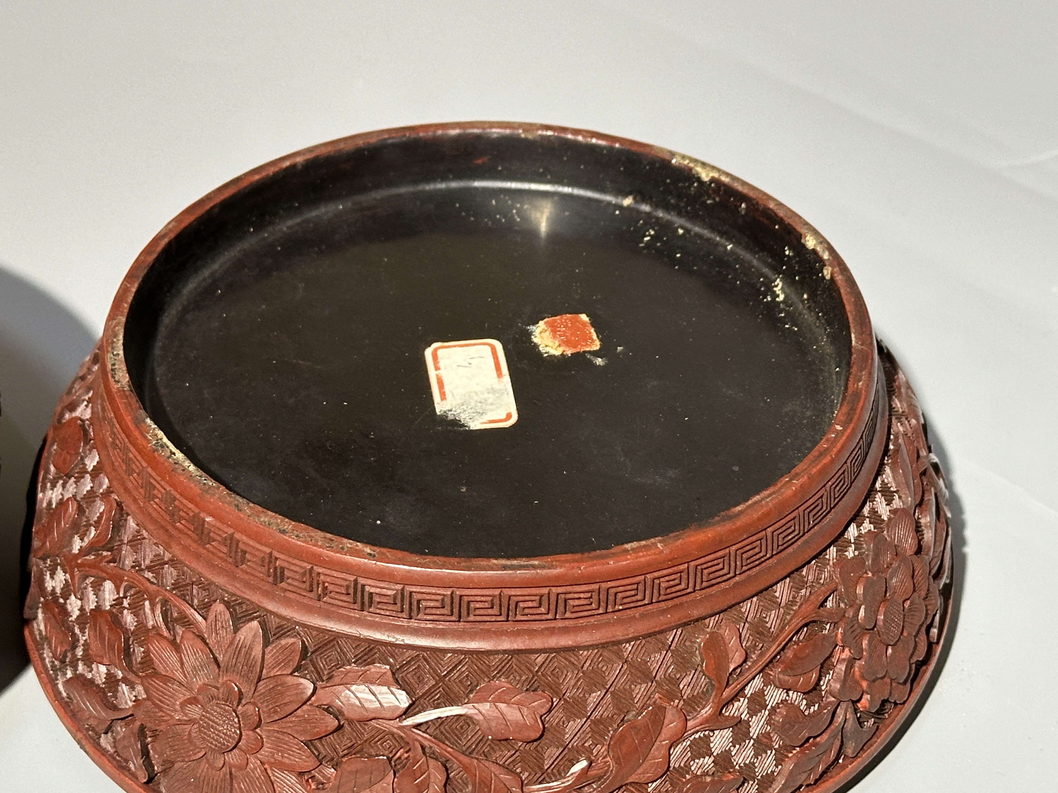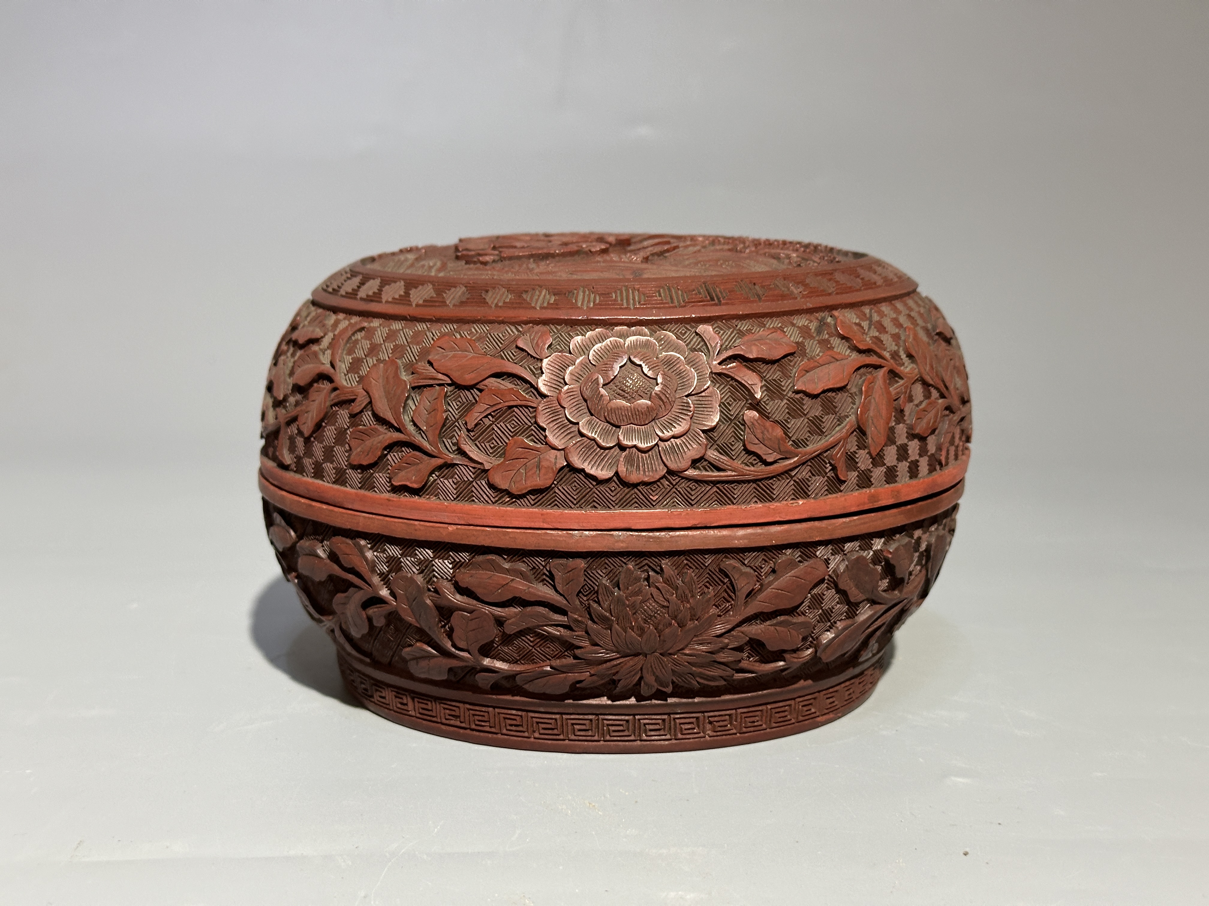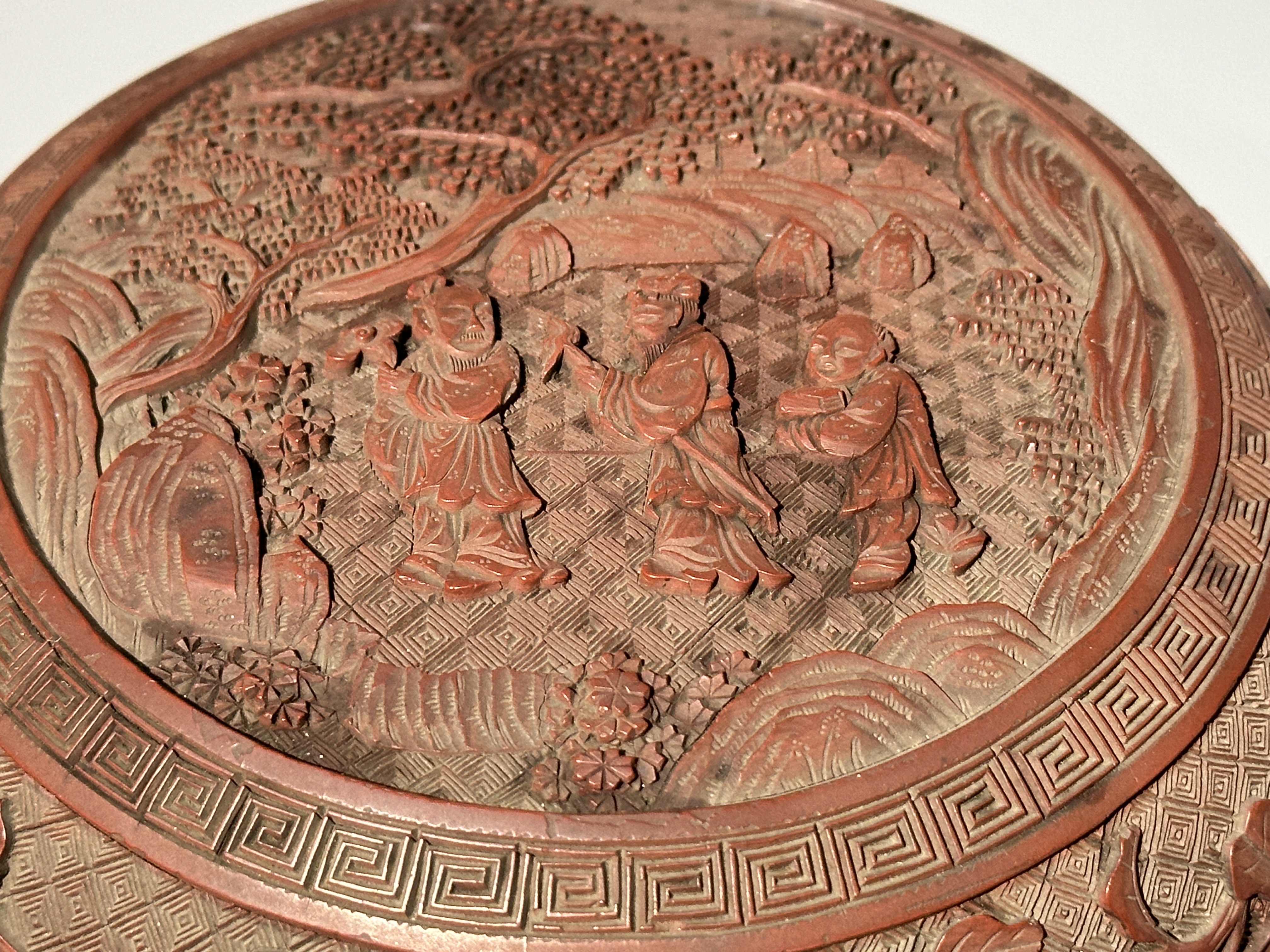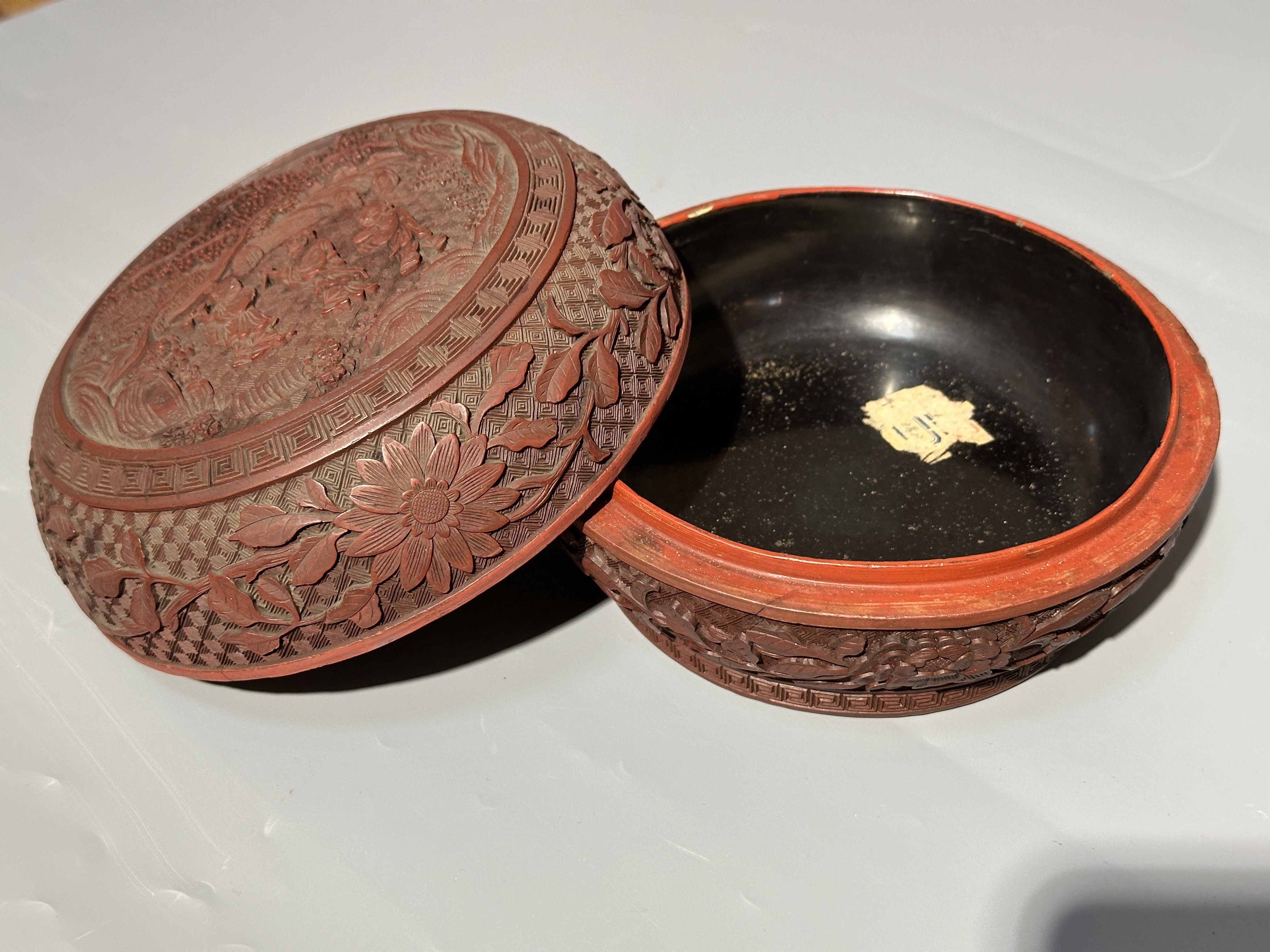 本品為清代剔紅佳器,扁圓形制,圈足規整。通體髹朱漆,漆層肥厚。盒身、盒腹以細錦紋為底,蓋壁浮雕纏枝菊紋,花瓣層疊舒展。蓋面開光內雕人物,表情豐富,襯以山石,整器雕工深峻,藏鋒圓潤,花卉、人物皆生動有致,為文房清供或閨閣用器之精品。