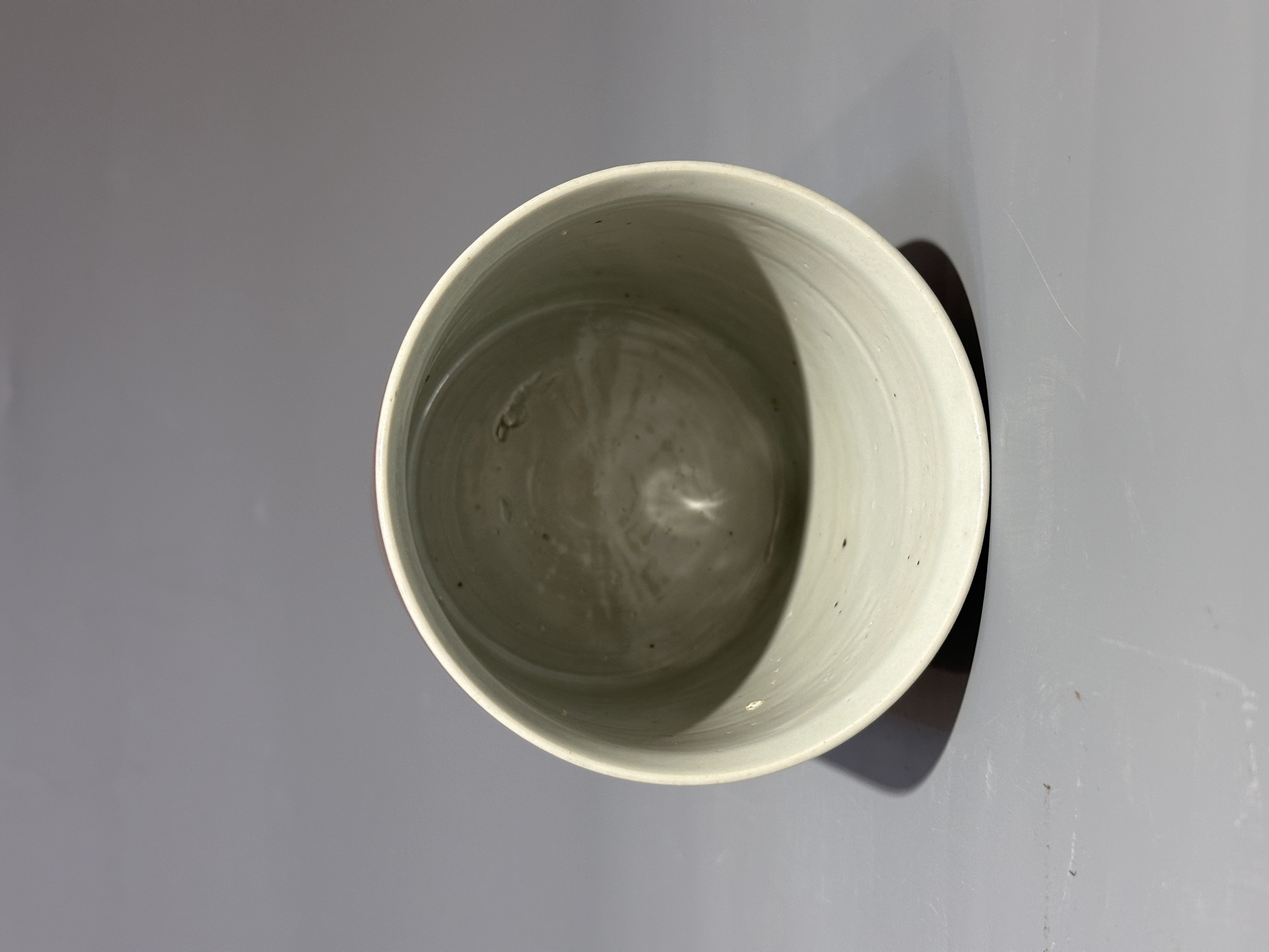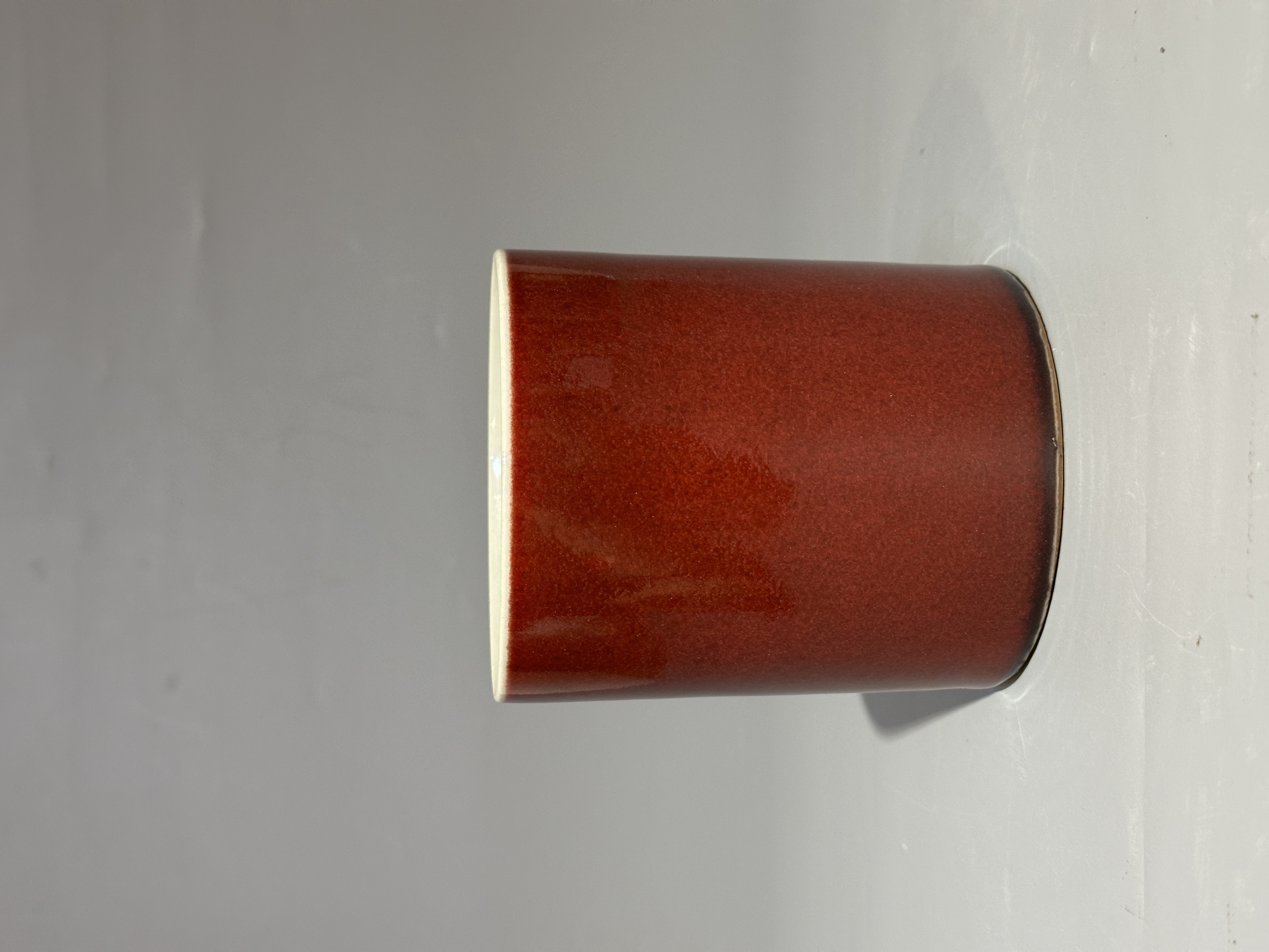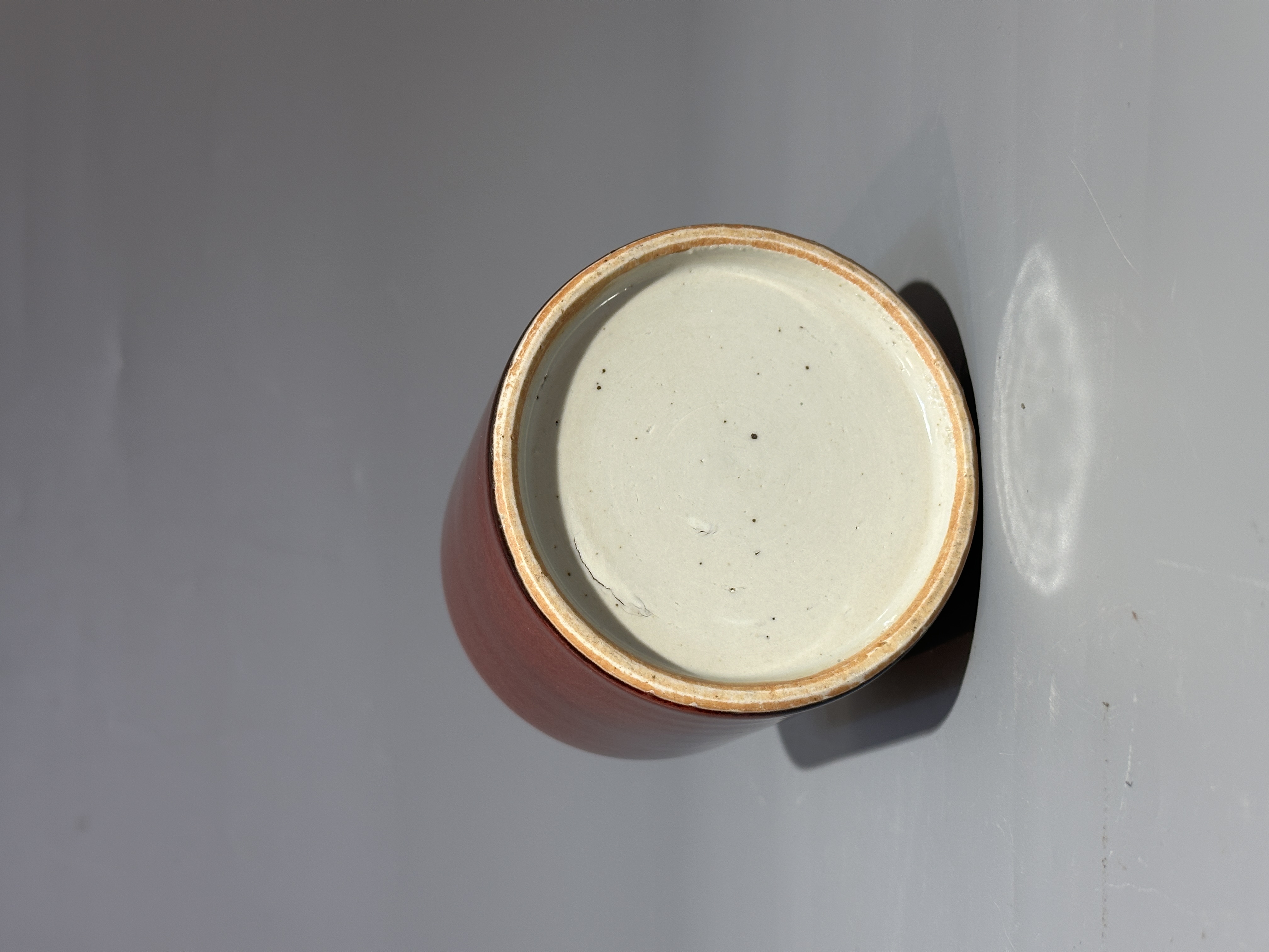 此筆筒為經典圓柱造型,形制規整,胎體勻實。外壁通施礬紅釉,釉色濃郁沉穩,紅中透褐,釉麵勻淨光潔,色澤統一中蘊有深淺自然的細微過渡,寶光內斂。口沿處露出一線細白的胎骨,與深沉的紅色形成巧妙對比,更顯工藝講究。底足處理工整,露胎處可見胎質細膩。整器不事雕琢,全以古樸的造型與醇正的釉色取勝,置於案頭,沉穩大氣,是晚清文房用具的實用佳品。