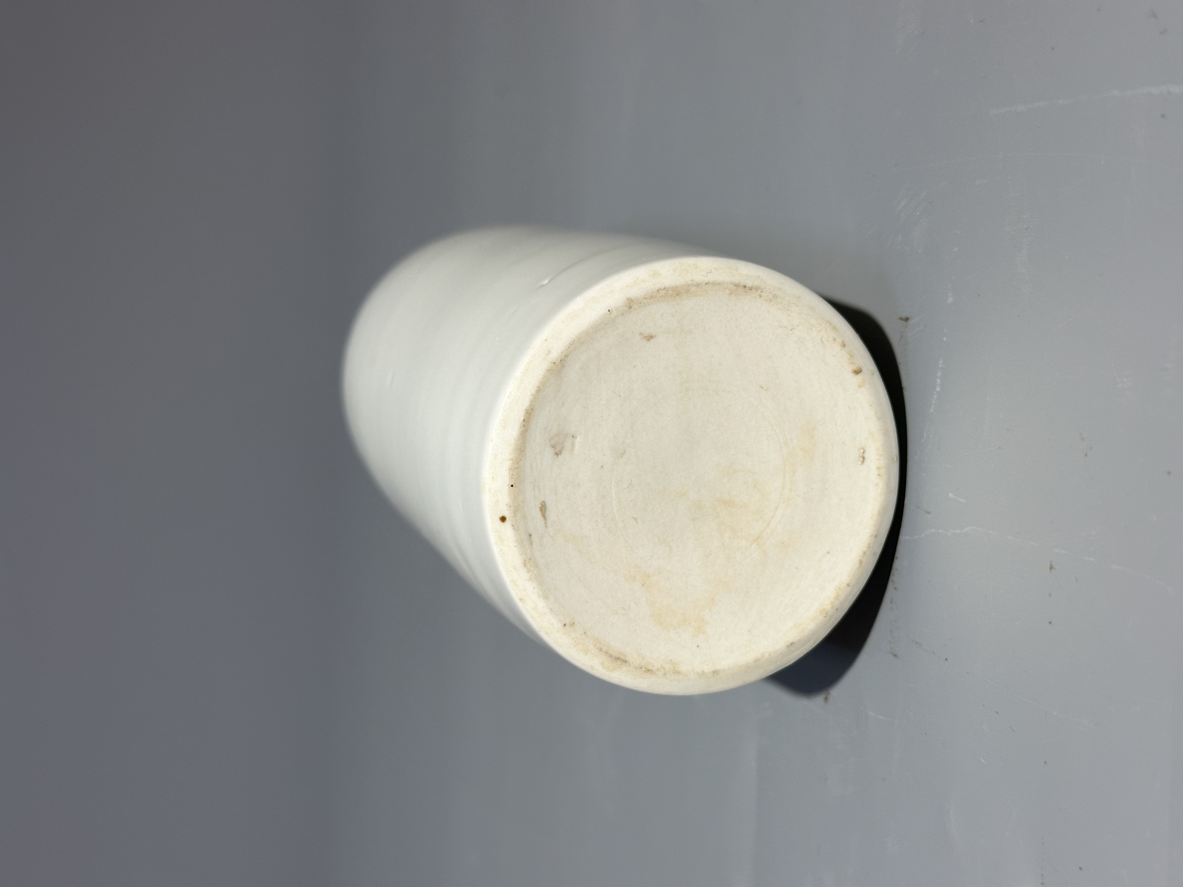 此件玉壺春瓶造型雋秀典雅,為經典制式。瓶身線條流暢飽滿,自腹部柔緩收束,至頸部外撇,勾勒出勻停秀美的輪廓。通體施白釉,釉質瑩潤如玉,釉色純淨如脂,於素白中透出含蓄的溫潤光澤。器身光素無紋,全然以造型的張力與釉色的質感取勝,體現了“大道至簡”的審美哲思。