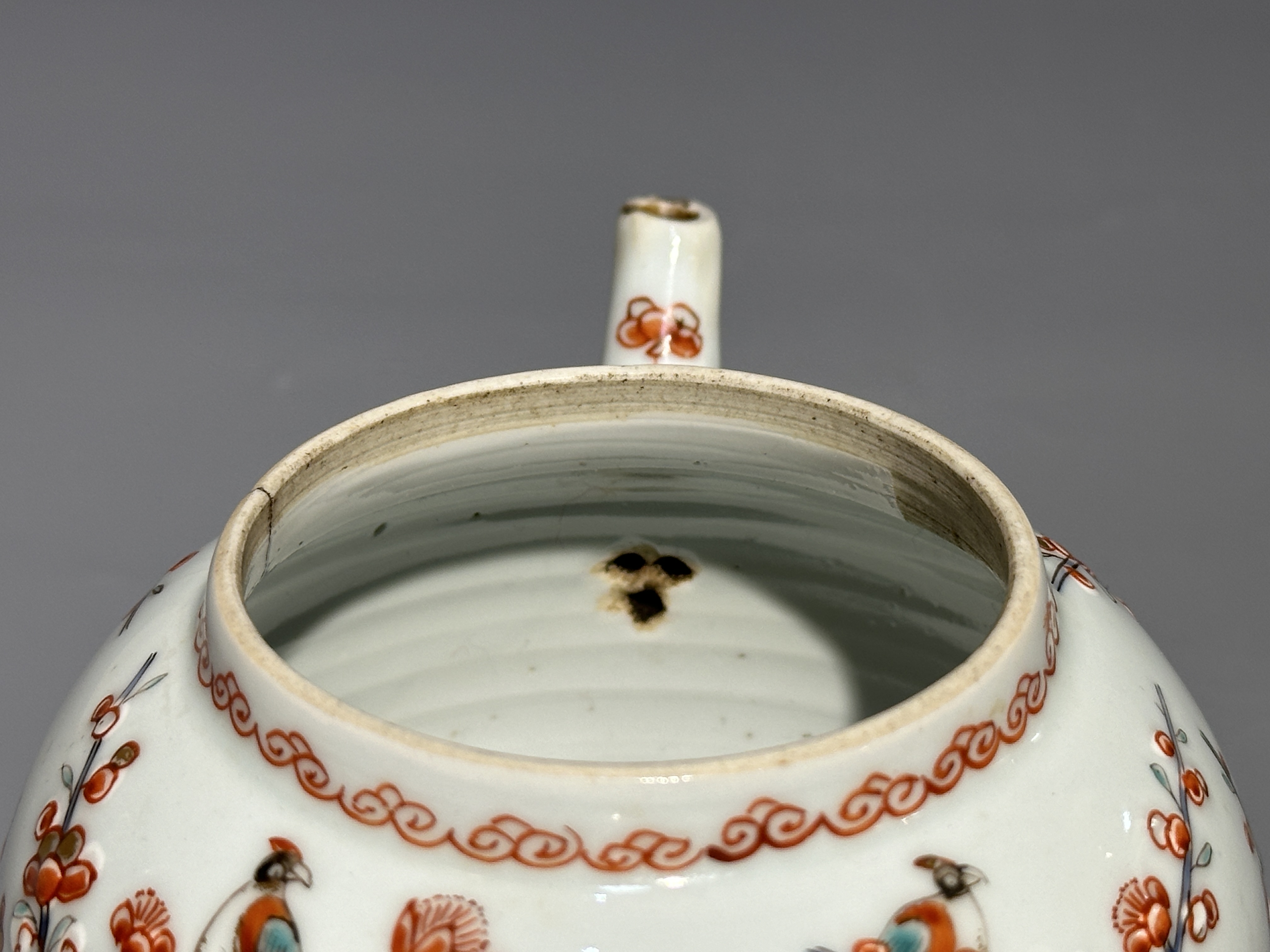 此件清康熙五彩描金茶壺,器形飽滿端莊,為康熙朝茶具之精品。壺身以瑩潤白釉為地,其上以礬紅、青綠、嬌黃、紫黑等諸彩繪就纏枝花卉紋樣,筆觸精細,設色明麗,枝葉翻轉自然,頗具文人畫意。所繪紋飾部分更以真金勾勒點綴,金彩璀璨,與五彩相互輝映,盡顯華貴雍容之氣。壺流與執曲線條流暢,與圓融壺體銜接自然,蓋鈕小巧精緻,整體制作工藝精湛,儲存狀態良好。