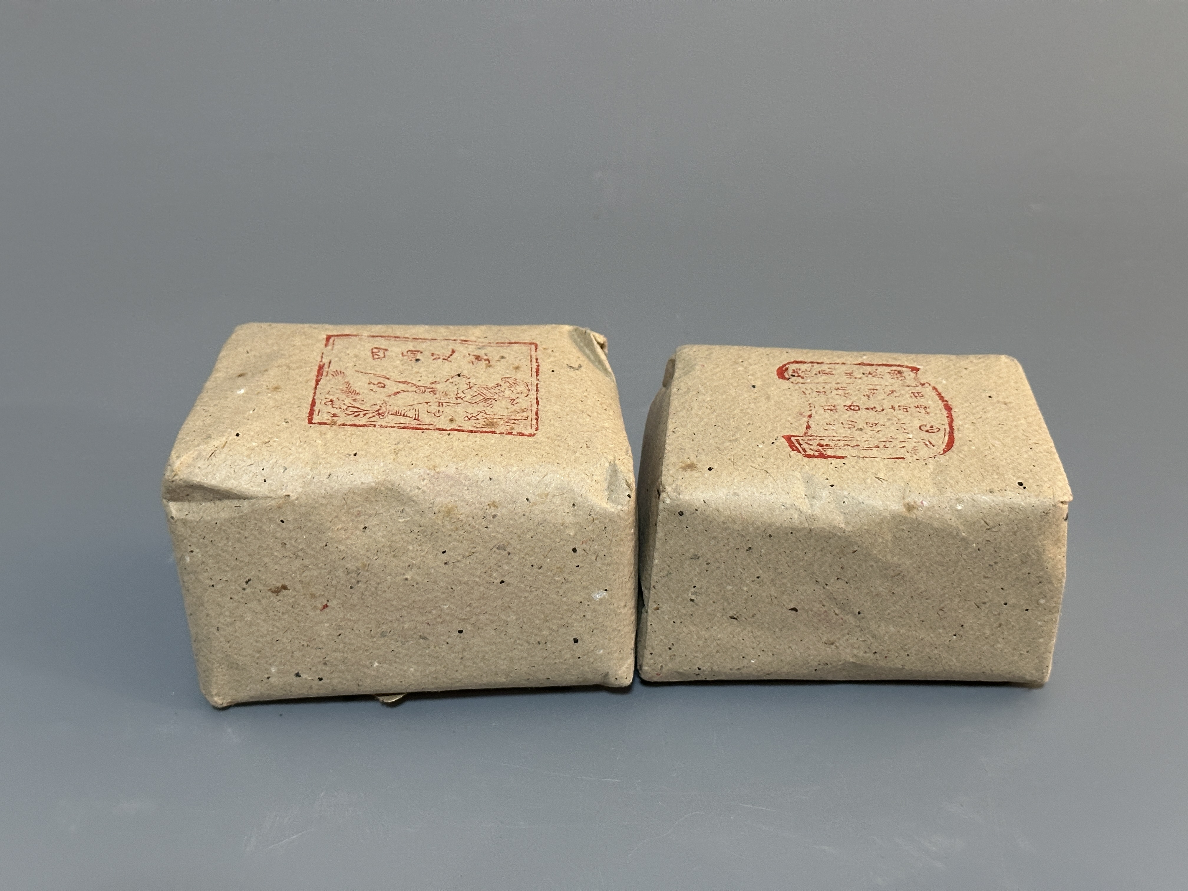 此為兩包老字號“提芳茶莊”的原裝茶葉,儲存狀態極為難得。外包裝採用傳統厚實牛皮紙,紙面色澤溫潤,紋理自然,時代特徵明顯。每包茶葉正面及頂部均以清晰有力的紅色木刻印章,蓋印“提芳茶莊”商號名及“自磨香片”茶品名,字型古樸雅緻,硃砂印泥色澤沉穩。兩包並置,形制統一,包裝原整未拆,內部茶葉充實,為當時商號零售包裝的真實縮影。