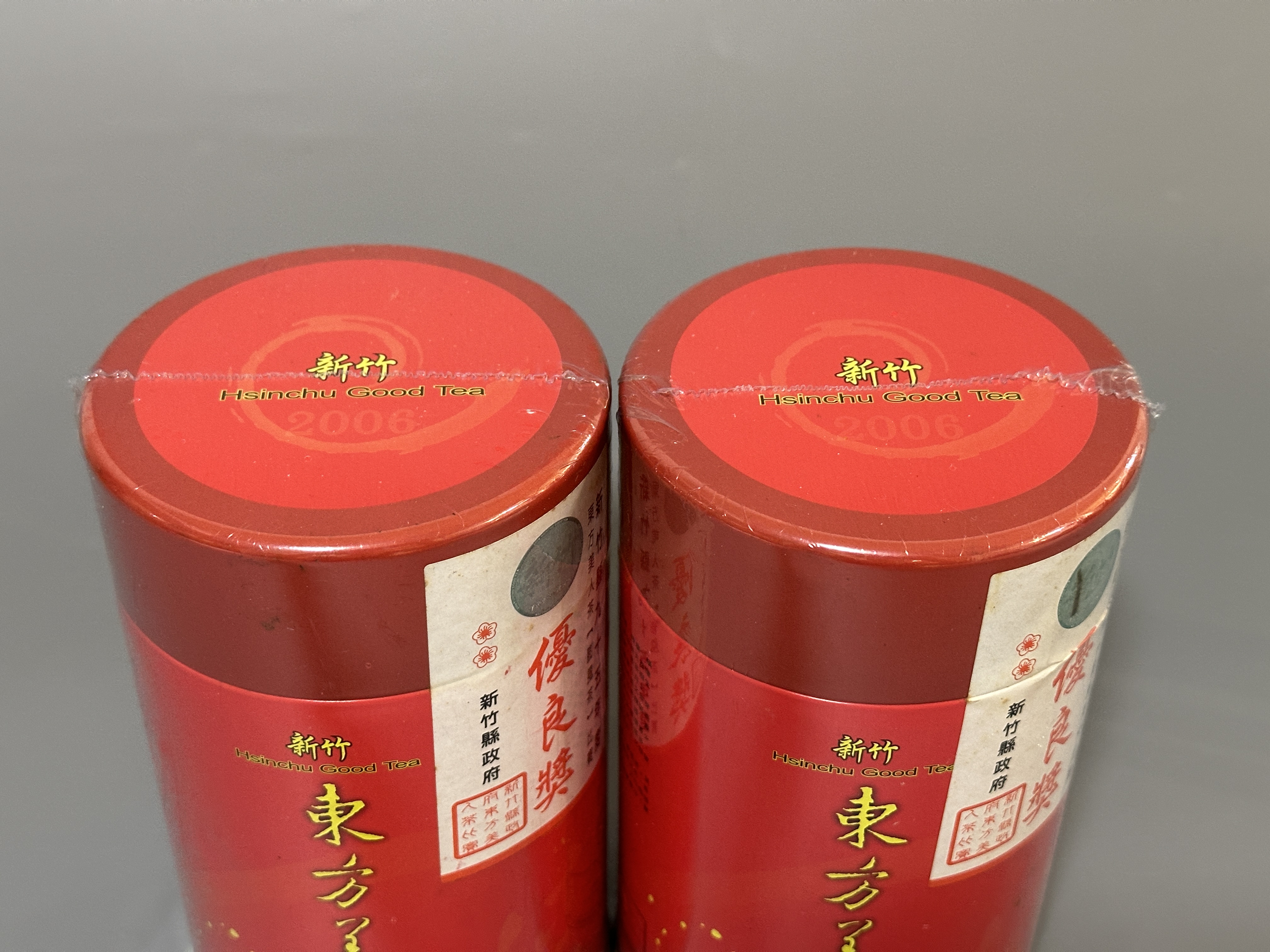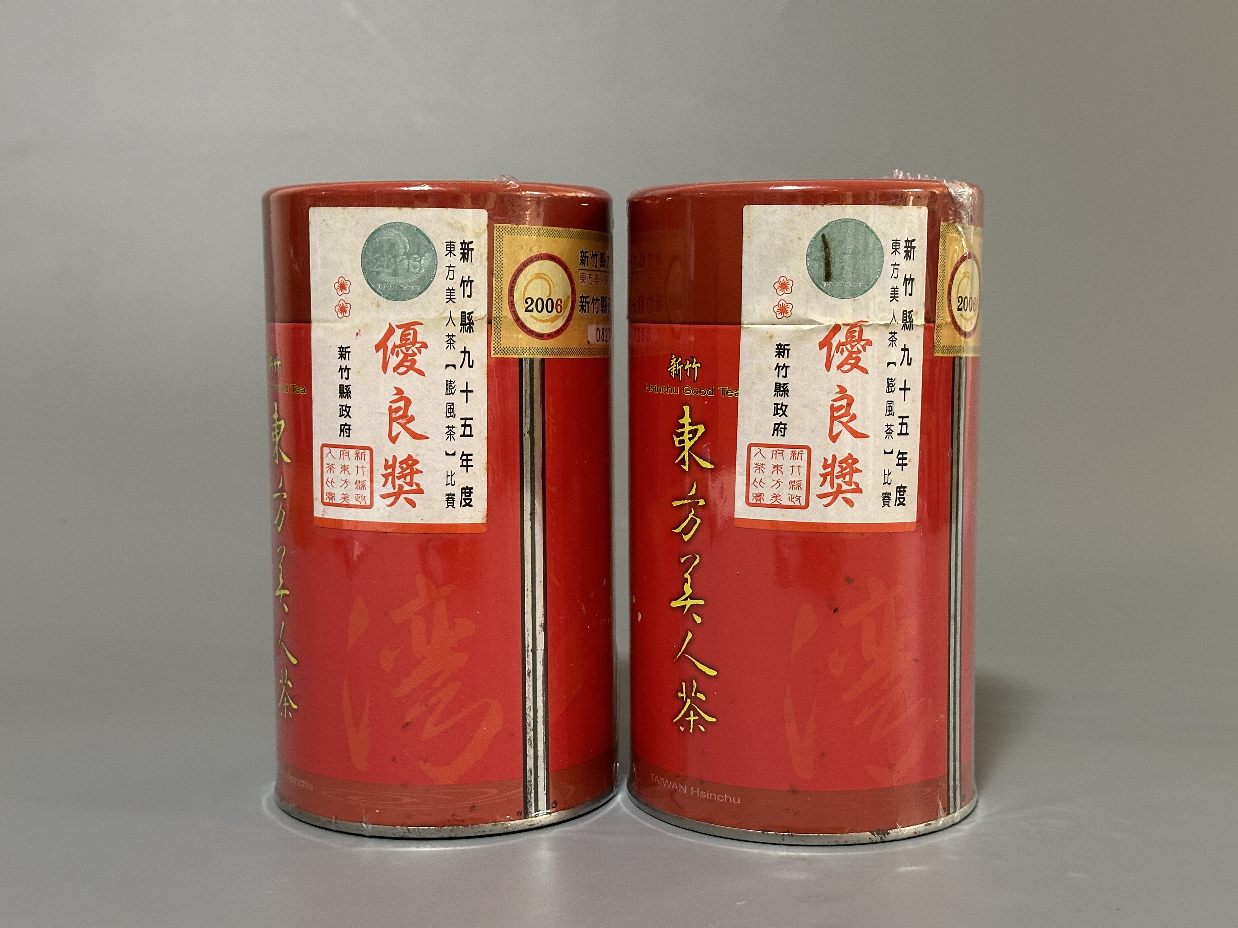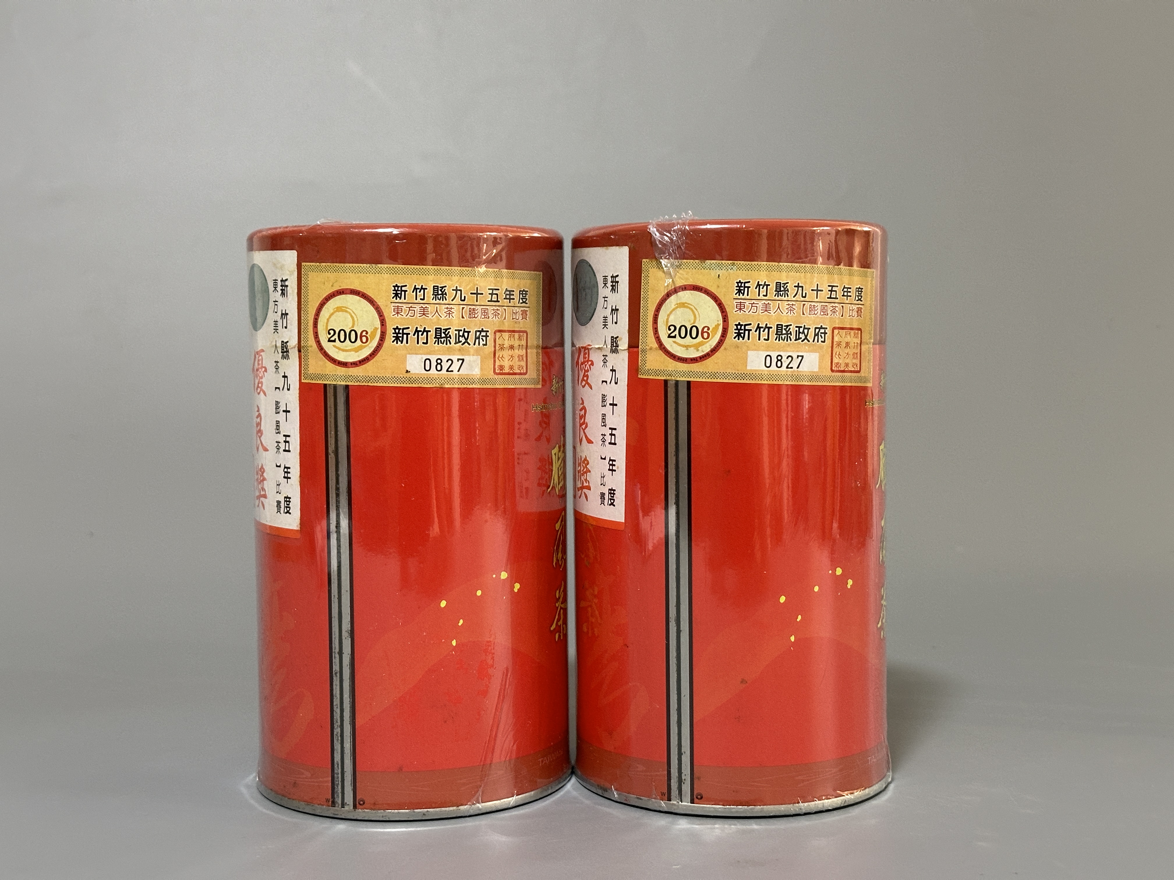 本拍品為當年賽事獲獎茶,二罐一組原裝保存。民國 95 年(西元 2006 年)新竹縣政府主辦「膨風茶」評比賽得獎茶品,紅罐正身標註「優良獎」,並鈐「新竹縣政府東方美人茶比賽」印信,頂部貼 2006 年官方驗證標籤,品相完好。