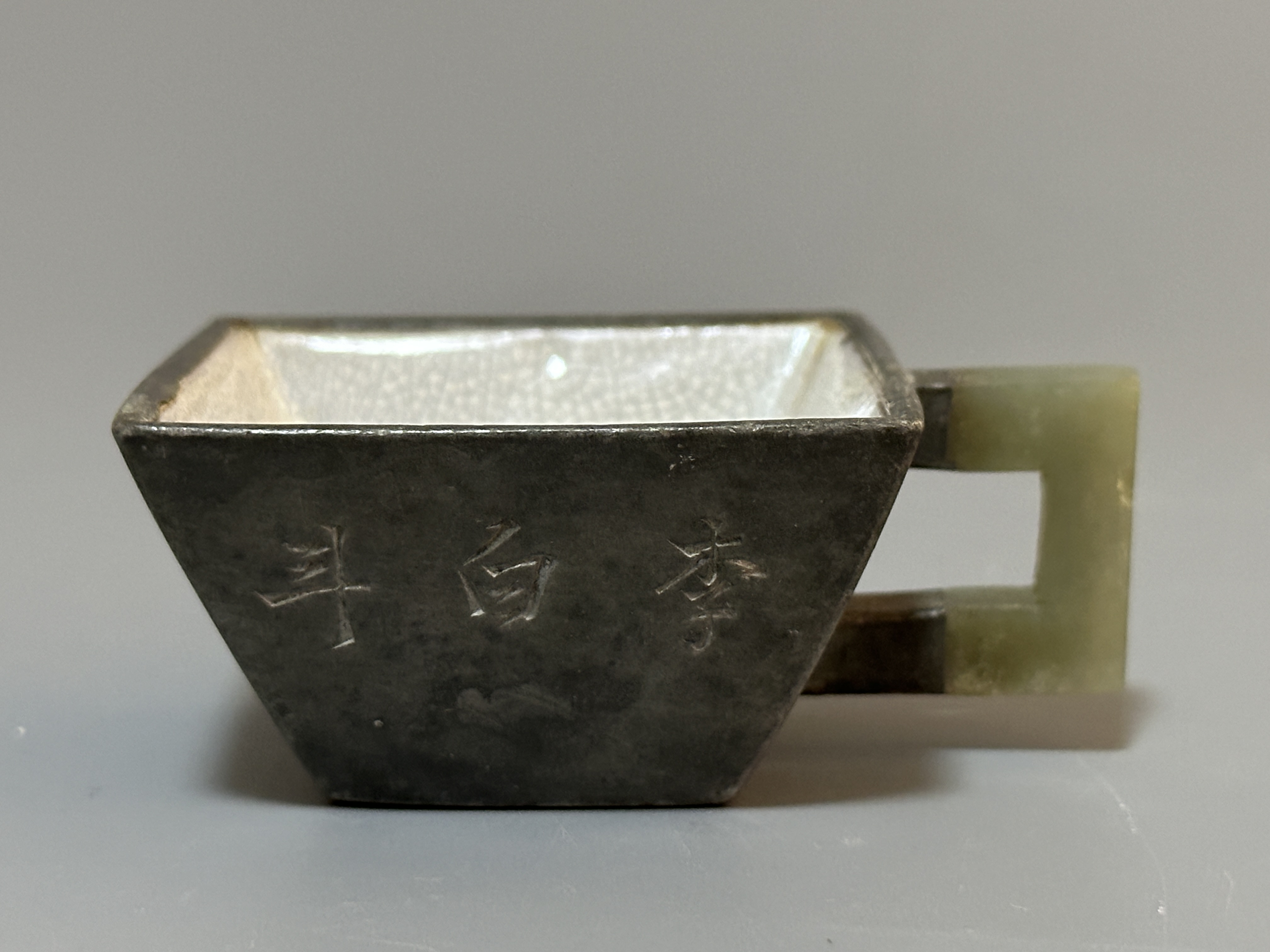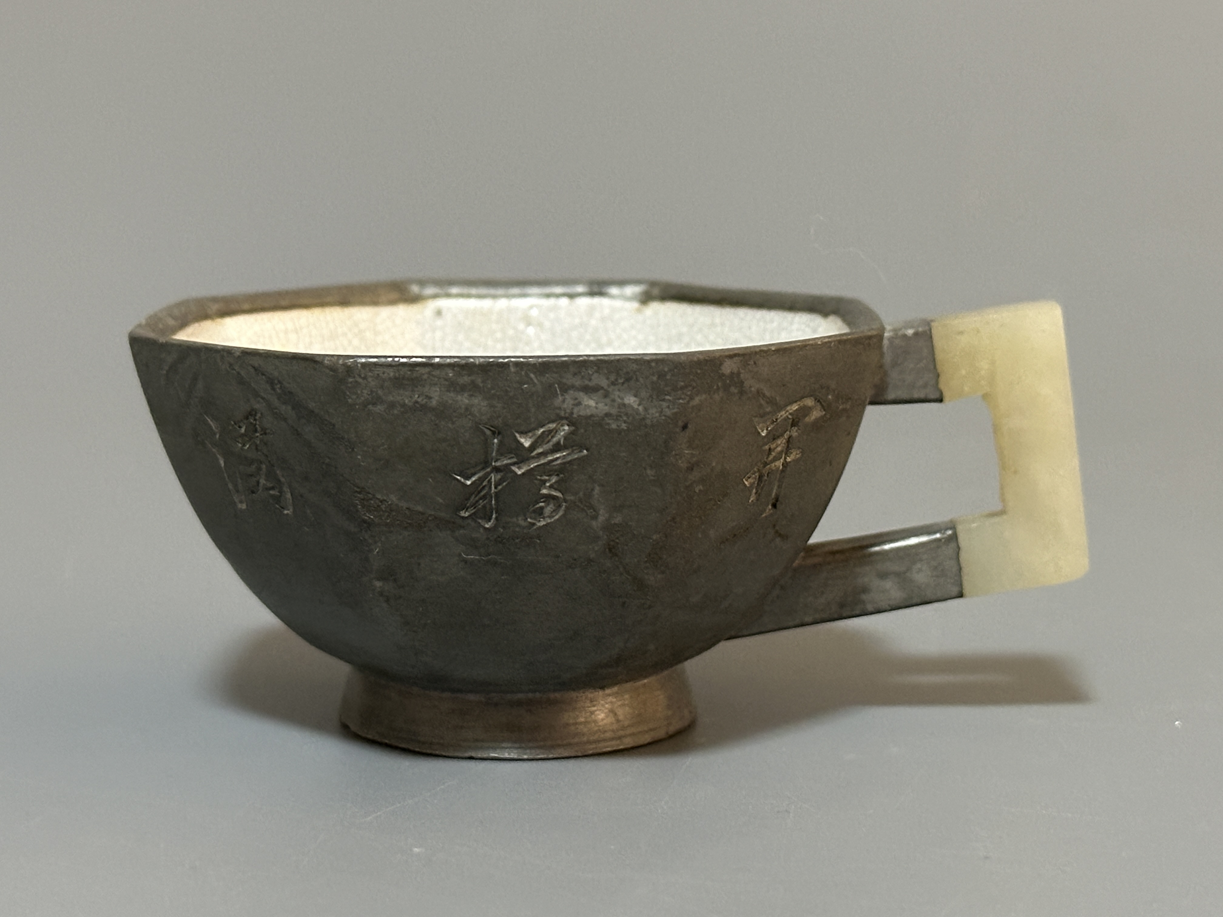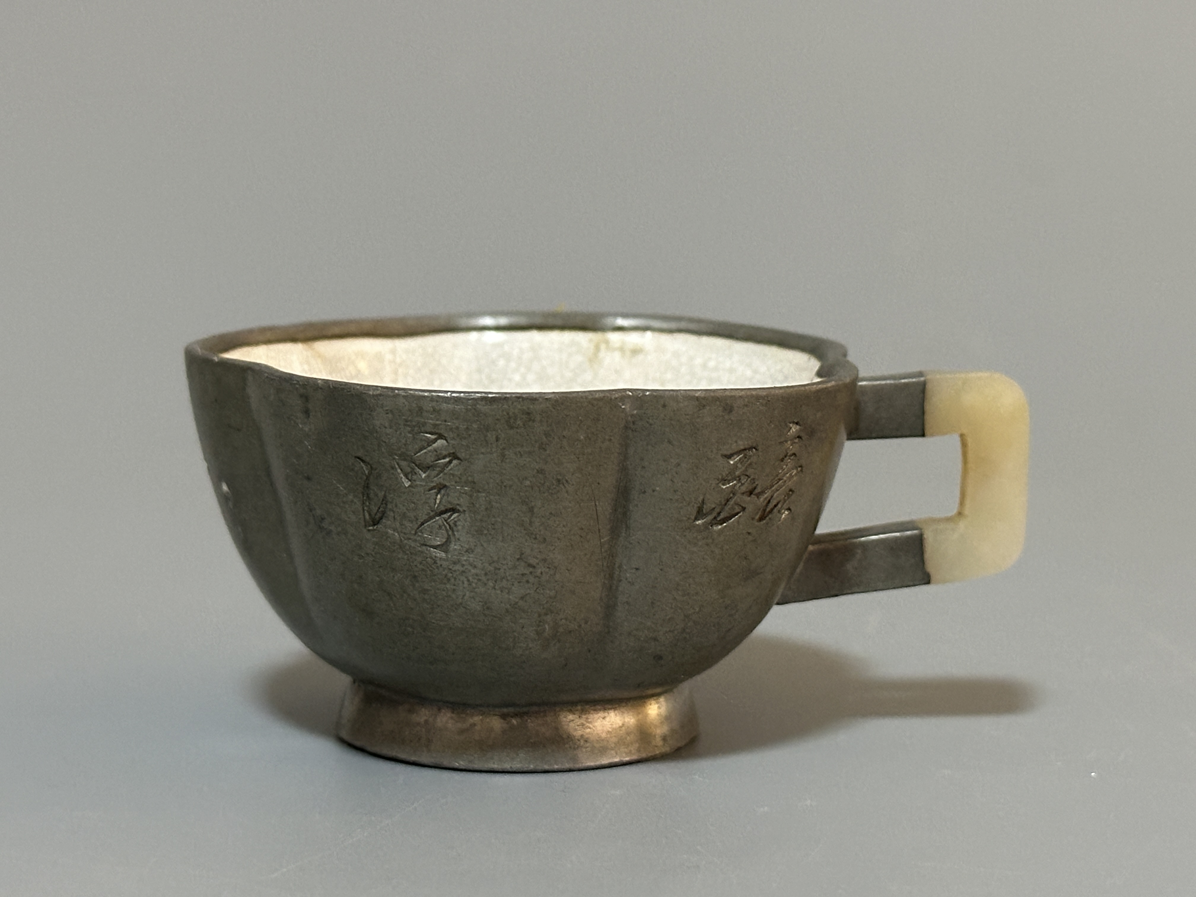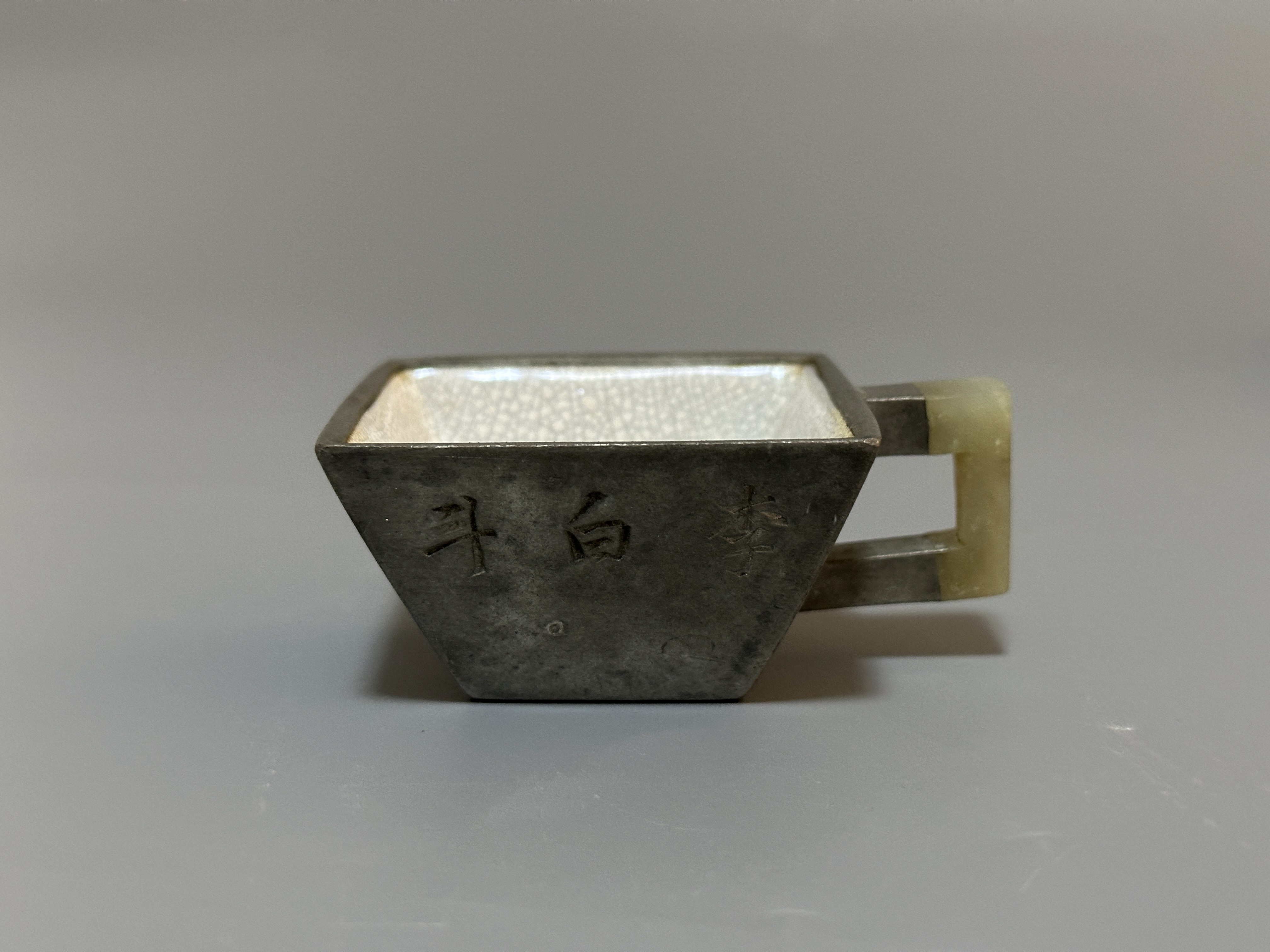 范章恩:清乾隆製壺高手,以扁身壺為主。錫質胎體,器形分方、葵口諸式,質潤溫雅。內壁施開片釉,肌理細密古樸。器身刻字,十只器型、工藝呼應,或為文宴同用之具,保存完好,兼具實用與文人情趣。