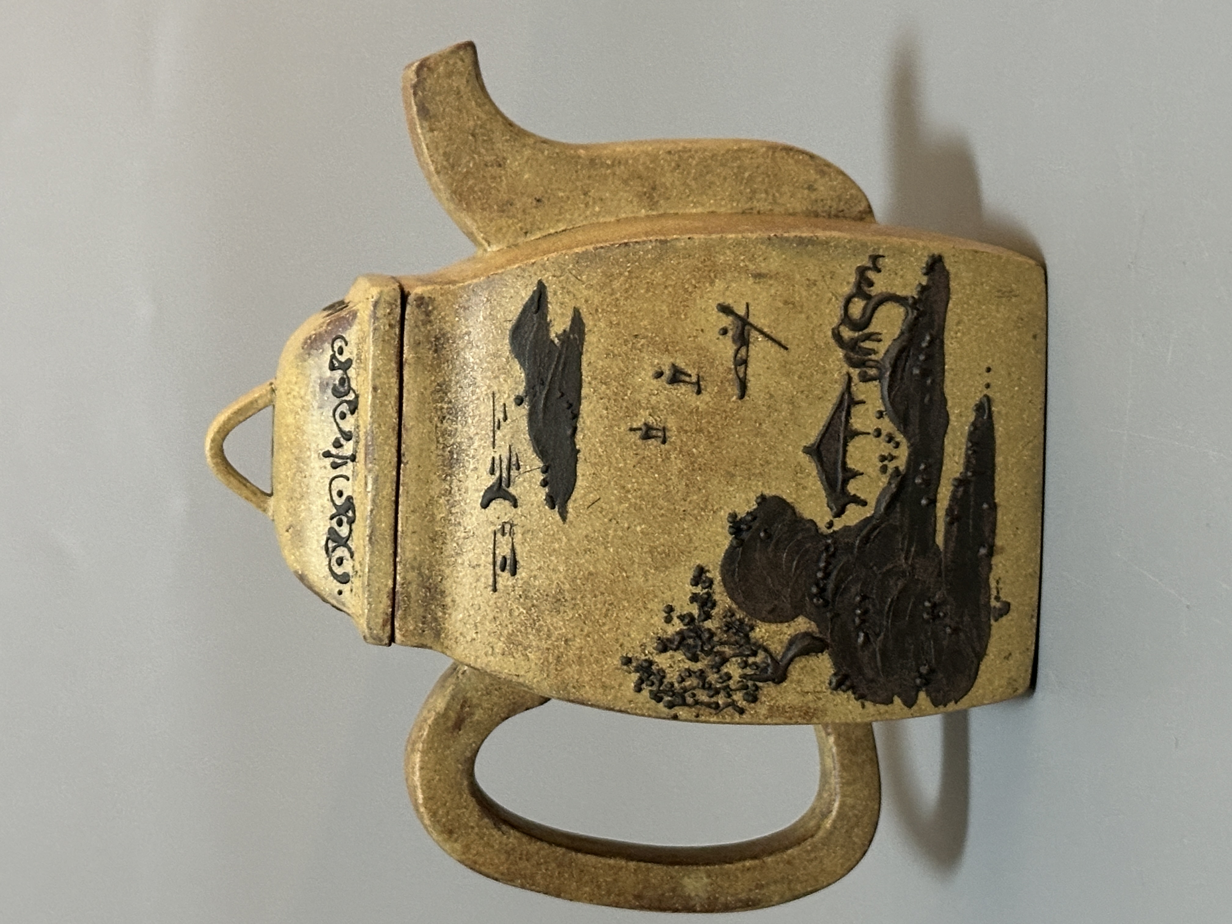 段泥花瓶作扁壺式高身,束頸、溜肩,器形修長而穩健,下承小長方形圈足,重心安定。 瓶腹一面以墨彩刻畫溪畔仕女,披襟負籃而行,旁有勁竹疏林,線條勁挺,富書畫意境。 上方題識行草,配以鈐印,形成「詩、書、畫、印」合一之文人式裝飾。段泥壺壺體作方折轉角,短流高把,蓋作橋鈕,整體輪廓簡練而具方正之勢。 器身正面以陰刻篆書銘文為飾,字勢挺拔,與花瓶之題詩相互呼應,顯示同一審美系統下的文人茶器風格。 段泥色澤溫潤泛黃,表面略帶窯斑,增添古雅氣息。