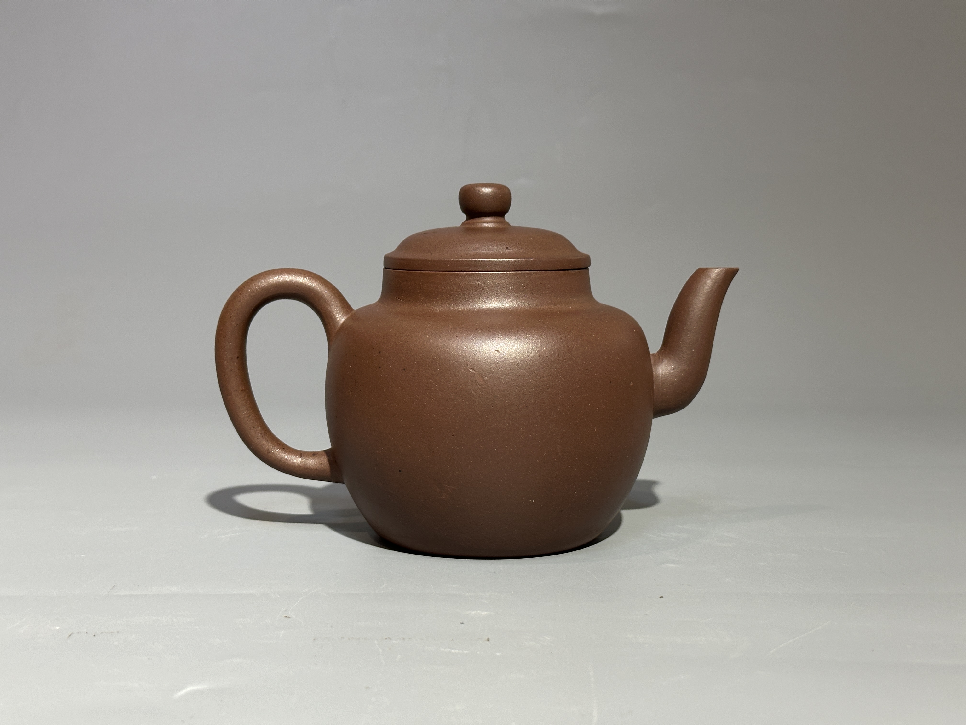 此壺為清初紫砂佳作,取經典蓮子壺式,壺身圓潤飽滿,線條自鈕至底一氣呵成,氣韻貫通。泥料選用上乘紫泥,經歲月溫養,呈深栗色澤,寶光內蘊。短彎流與環形把比例勻停,舒展有力。