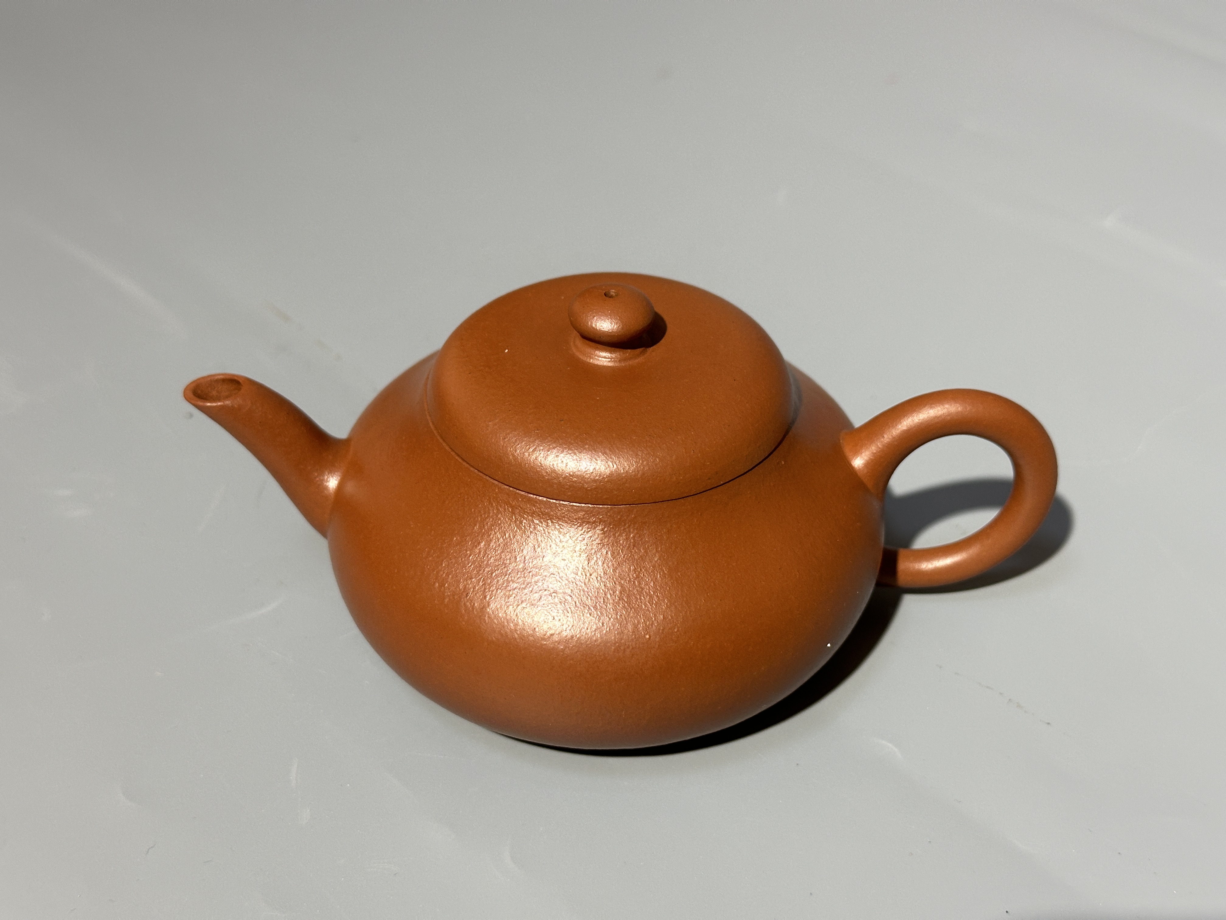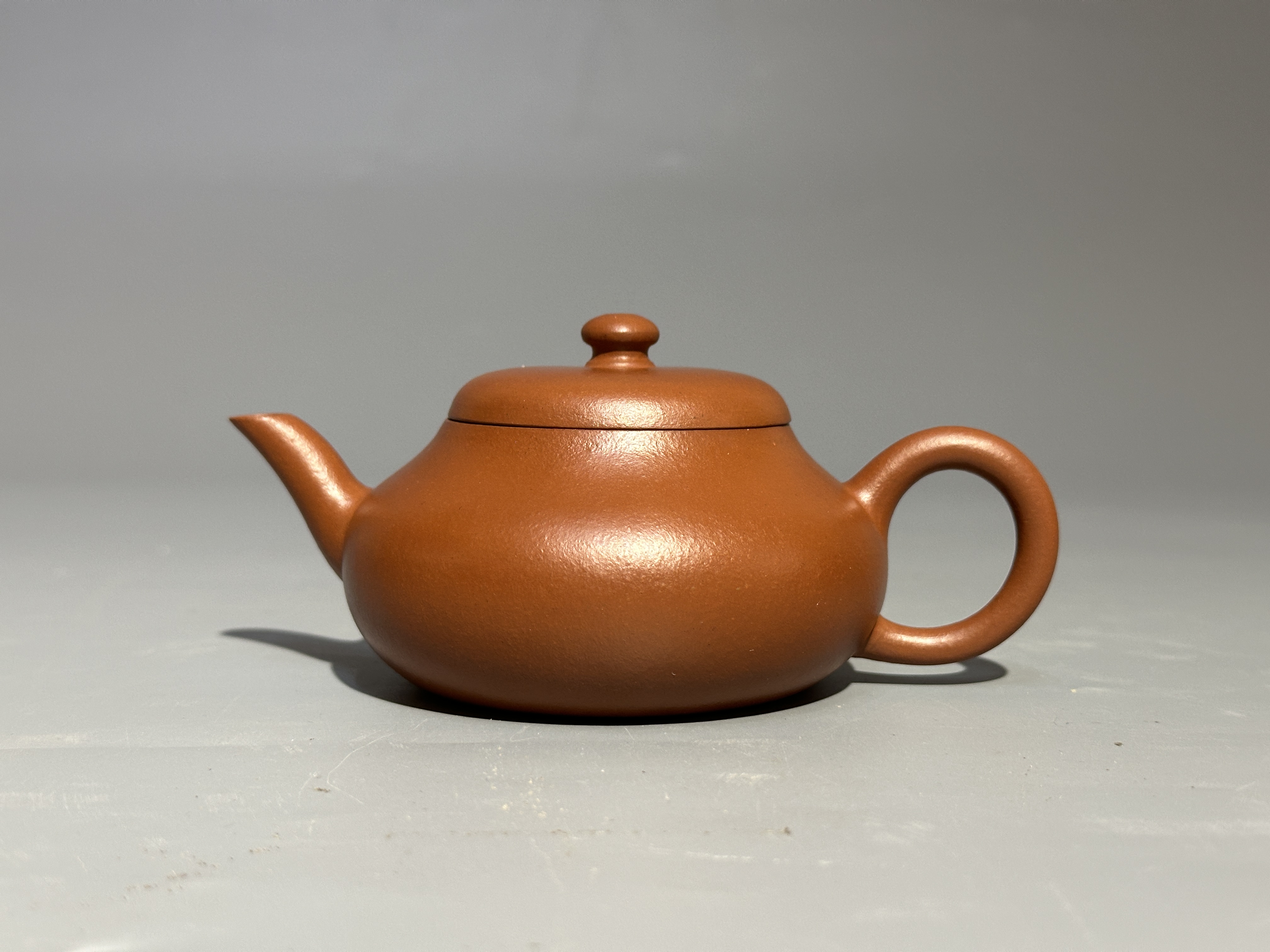此壺承君德式經典形制,肌理細膩如緞。整器無飾而雅,線條簡淨含蓄,兼具 “君子之德” 的溫敦氣質與茶器實用之妙。