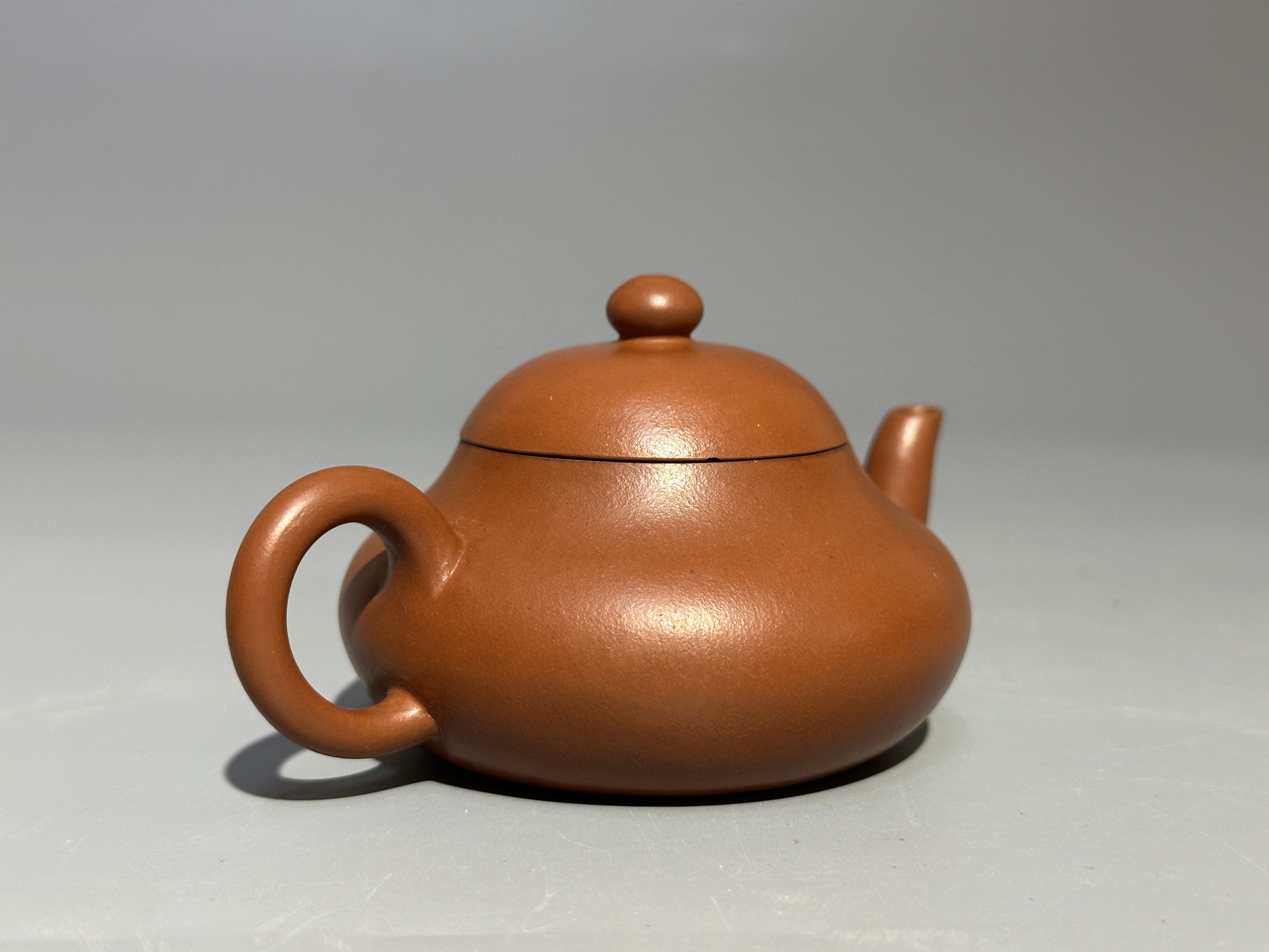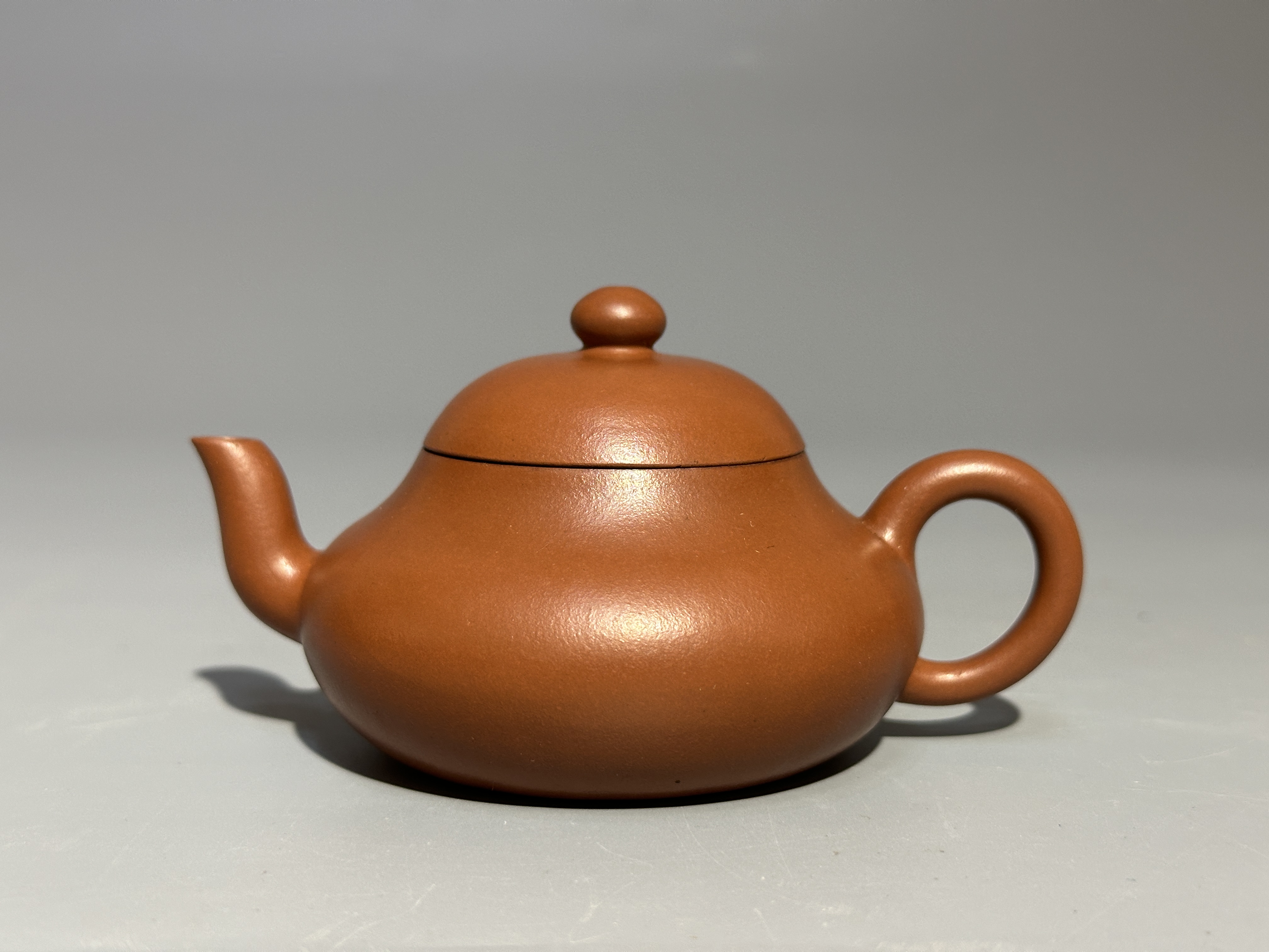 君德式為紫砂經典器型,此壺泥色暖棕瑩潤,器身呈矮梨形,豐腹斂底,氣韻圓融。為當代紫砂小品佳制。
