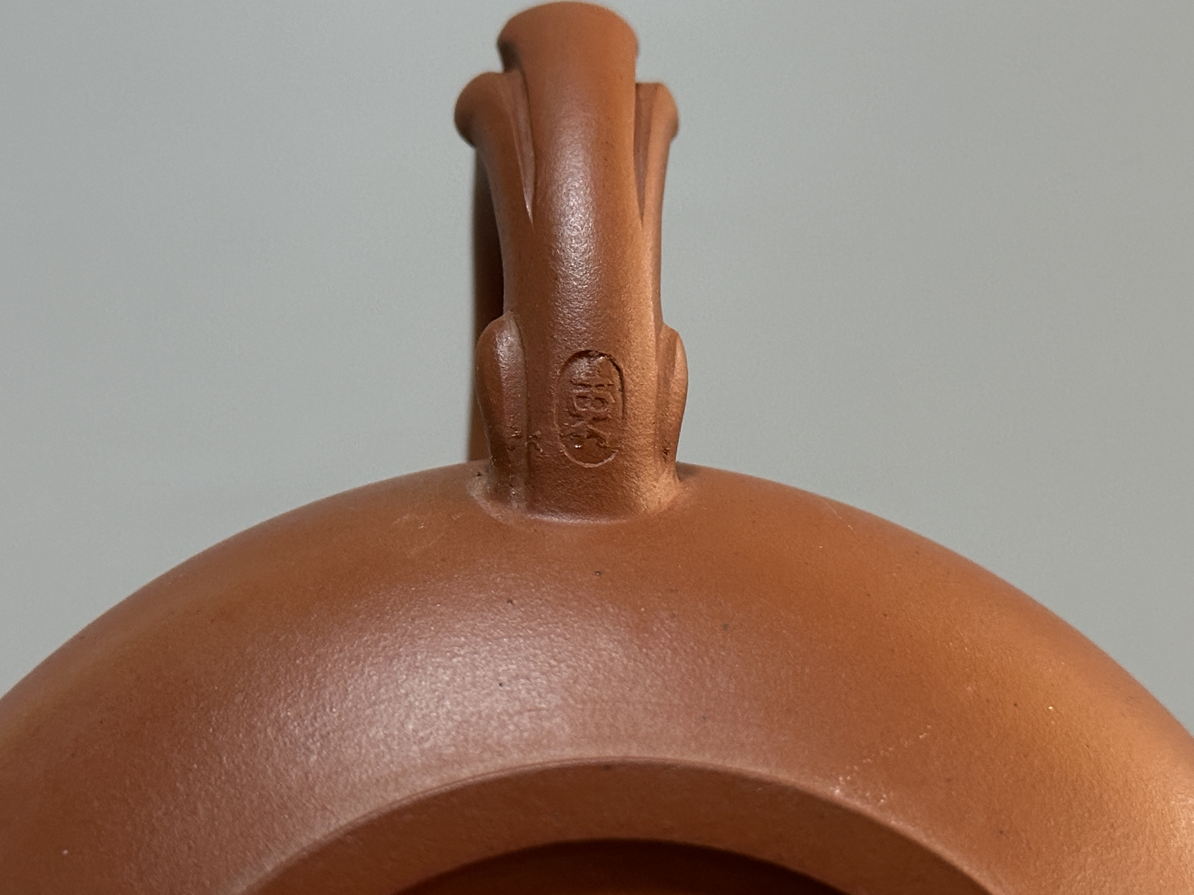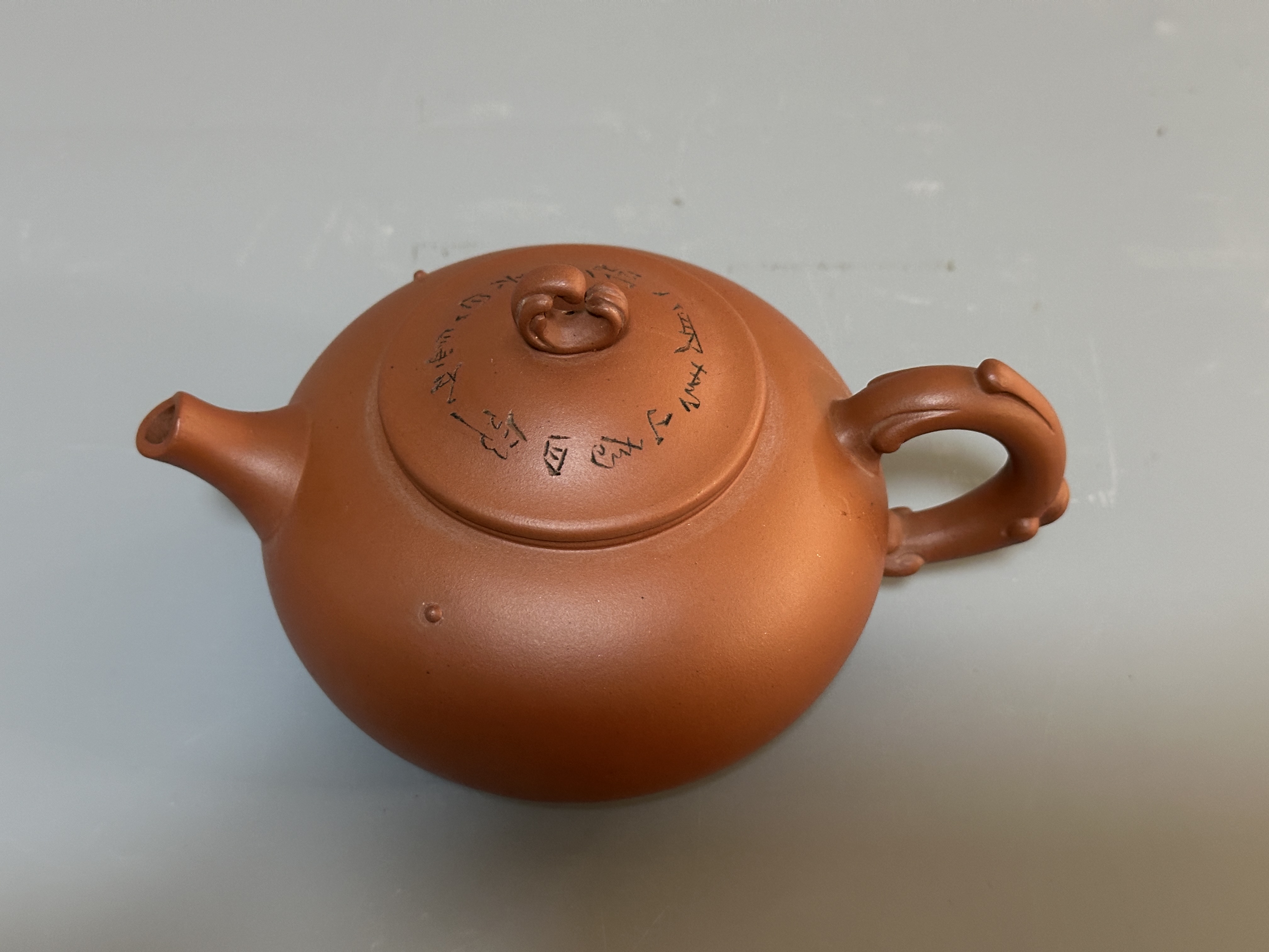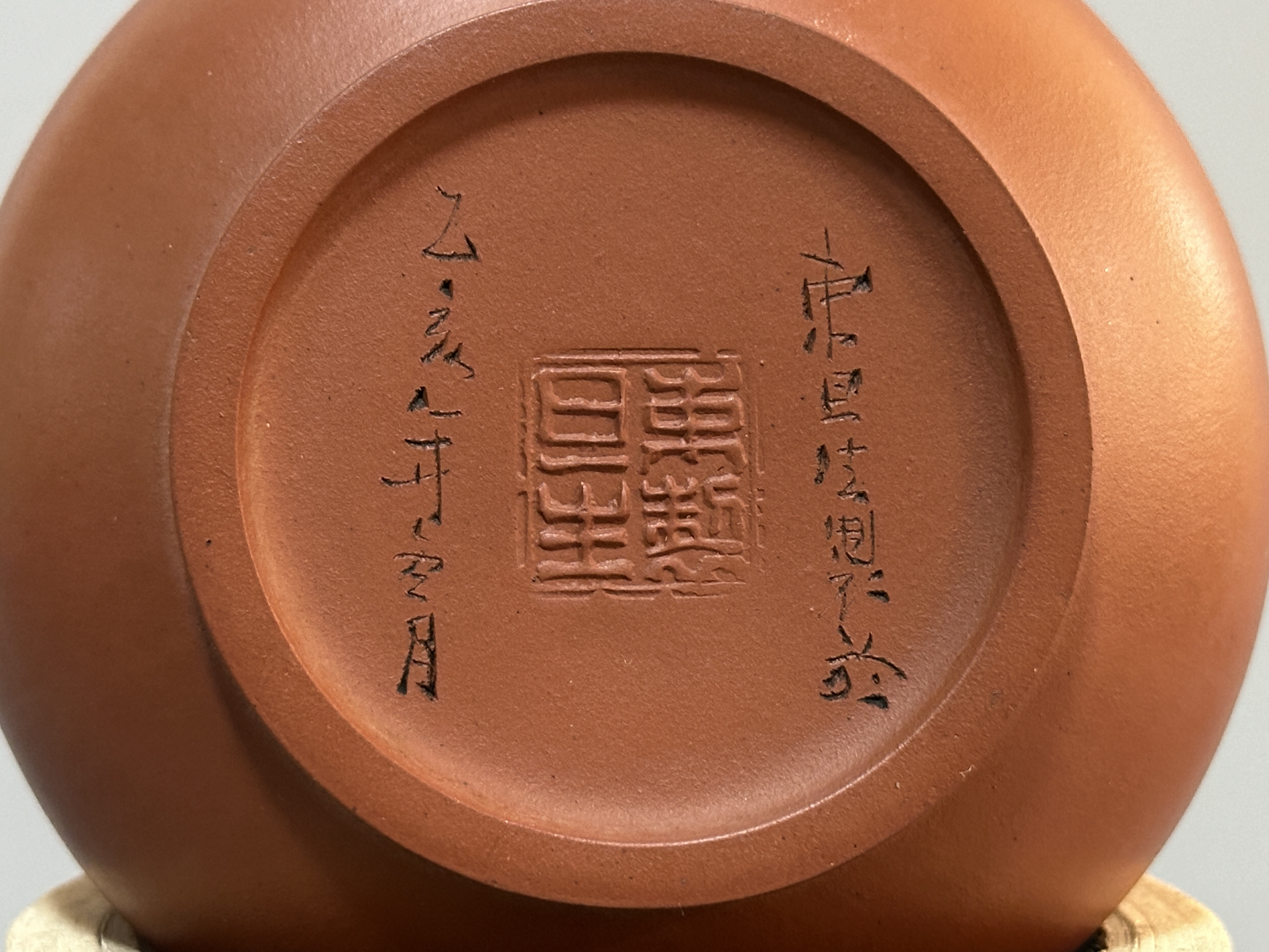 束旦生,1944年生於江蘇宜興。研究員級高級工藝美術師、江蘇省工藝美術名人、江蘇省陶瓷藝術名人、中國工藝美術協會會員、江蘇省工藝美術協會會員、江蘇省陶瓷協會會員、中國宜興紫砂文化藝術研究專委會委員。此壺色澤暖潤如赤金,器型圓渾飽滿,壺鈕作如意雲紋,耳形飛把暗合古意;蓋面以雙刀細刻書銘,筆法雋秀,刀工清勁。束旦生承任淦庭一脈,兼擅制壺與陶刻,此器工料相濟,文氣盎然,是其文人紫砂風格的典型代表。