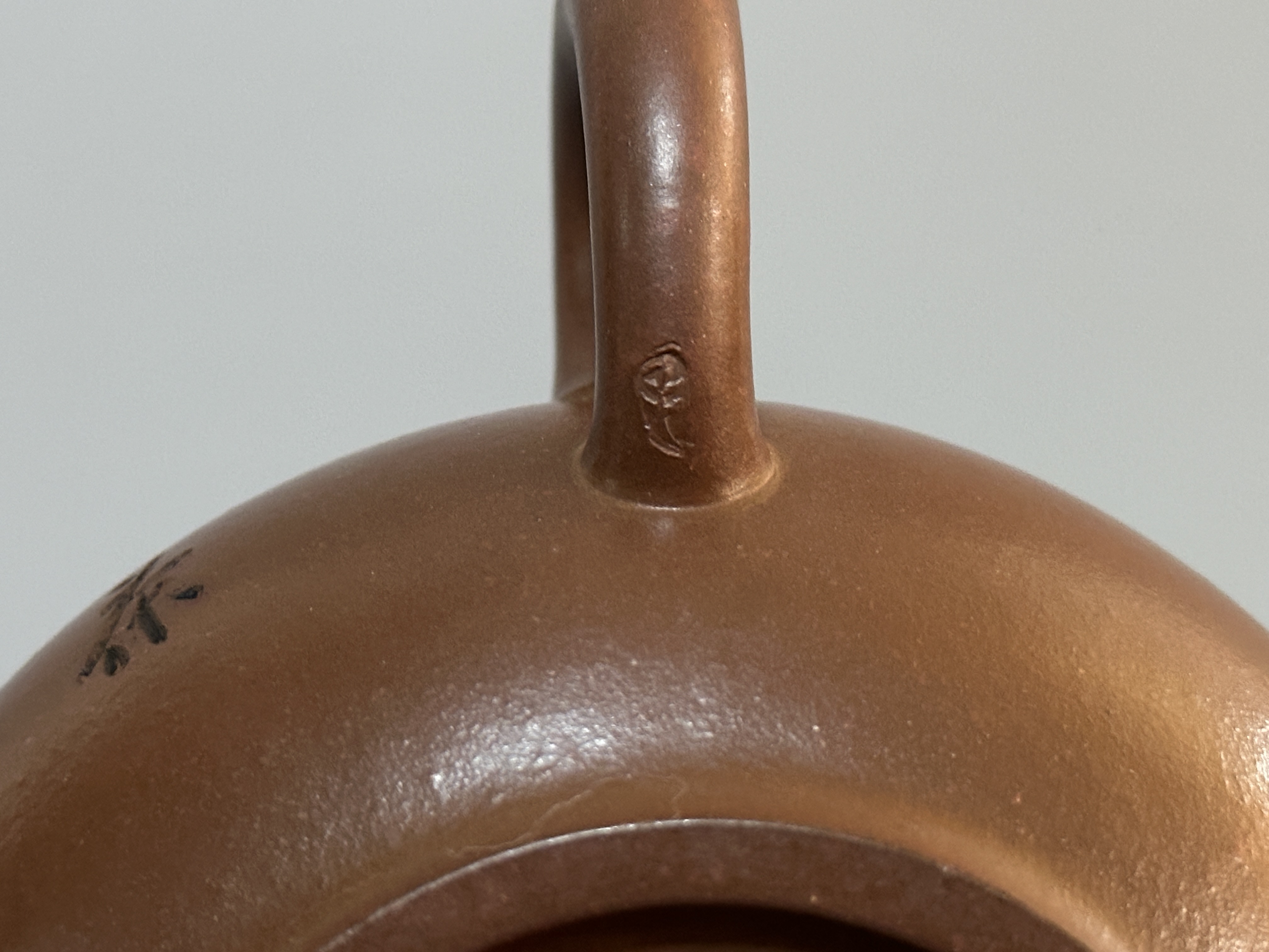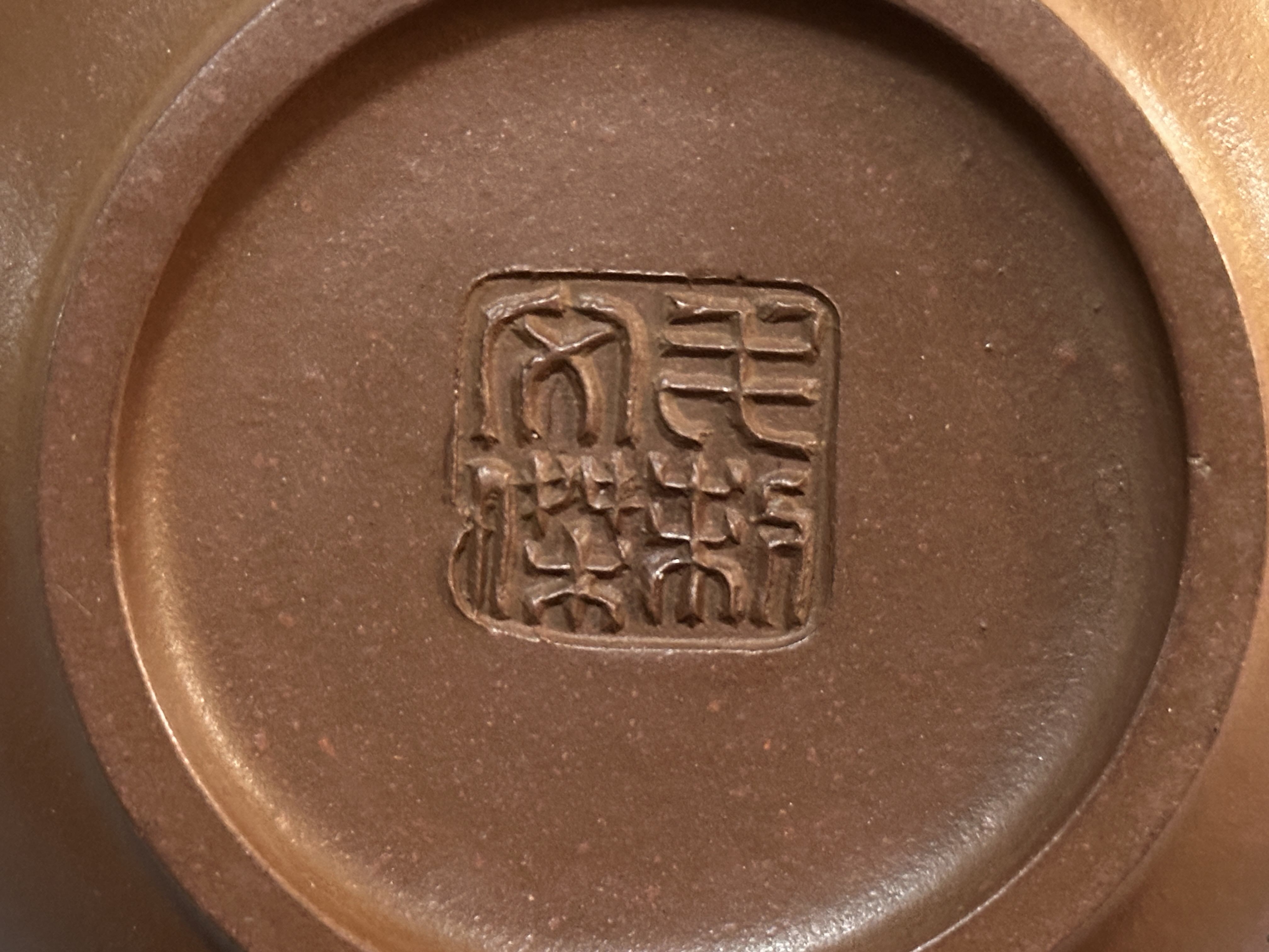 毛文傑,1968年生於中國陶都宜興陶藝世家。1983年進入江蘇省宜興紫砂工藝廠,隨父親毛國強(江蘇省工藝美術大師)學習陶刻裝飾,後師從吳群祥、季益順研習紫砂造型藝術。1988年赴中央工藝美術學院進修,期間拜壺藝泰斗顧景舟為師,並考入紫砂研究所。現為正高級工藝美術師。此壺為正高級工藝美術師毛文傑手制,其父中國陶瓷藝術大師毛國強親為題銘。壺取扁腹形制,泥色溫潤古雅,線條圓融挺括,口蓋嚴絲合縫,是毛氏父子紫砂壺的合璧之作。
