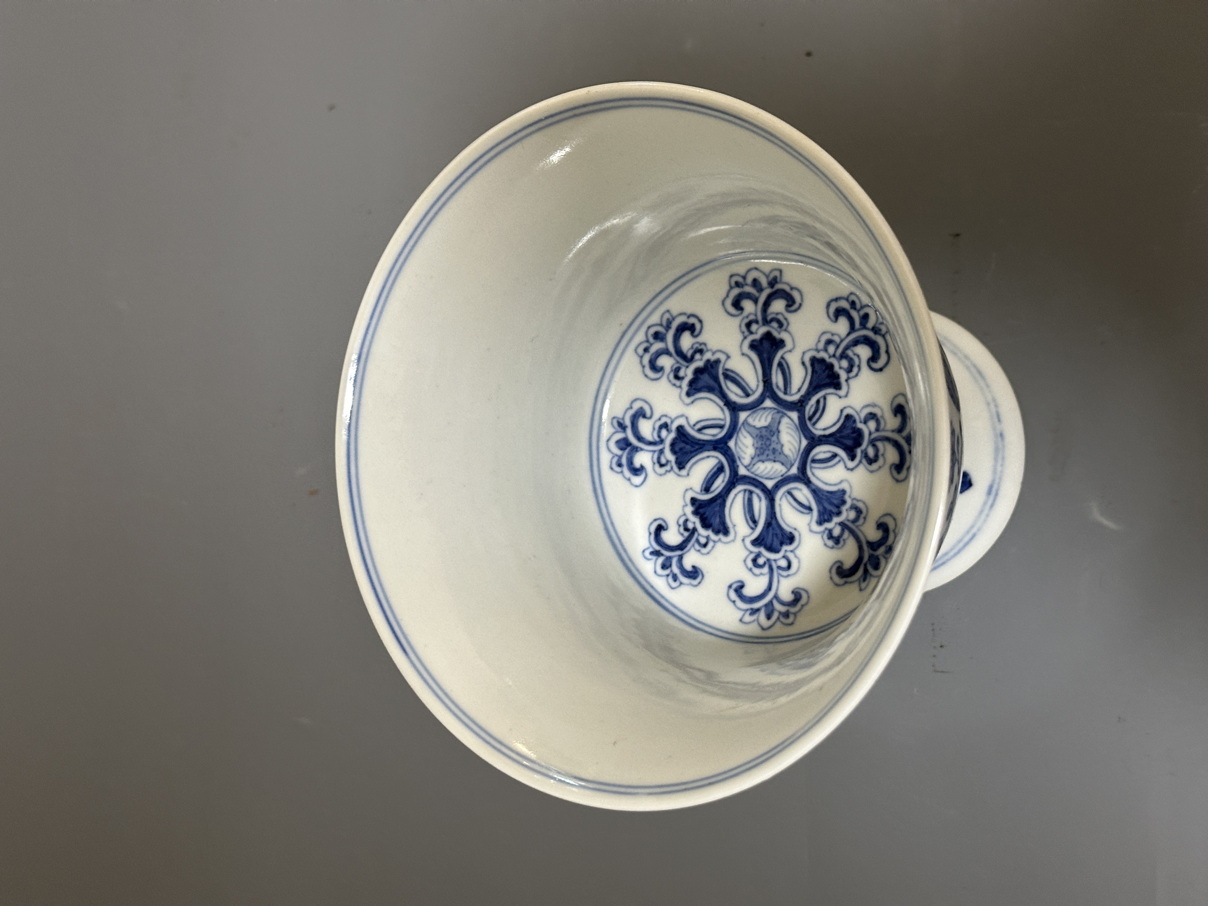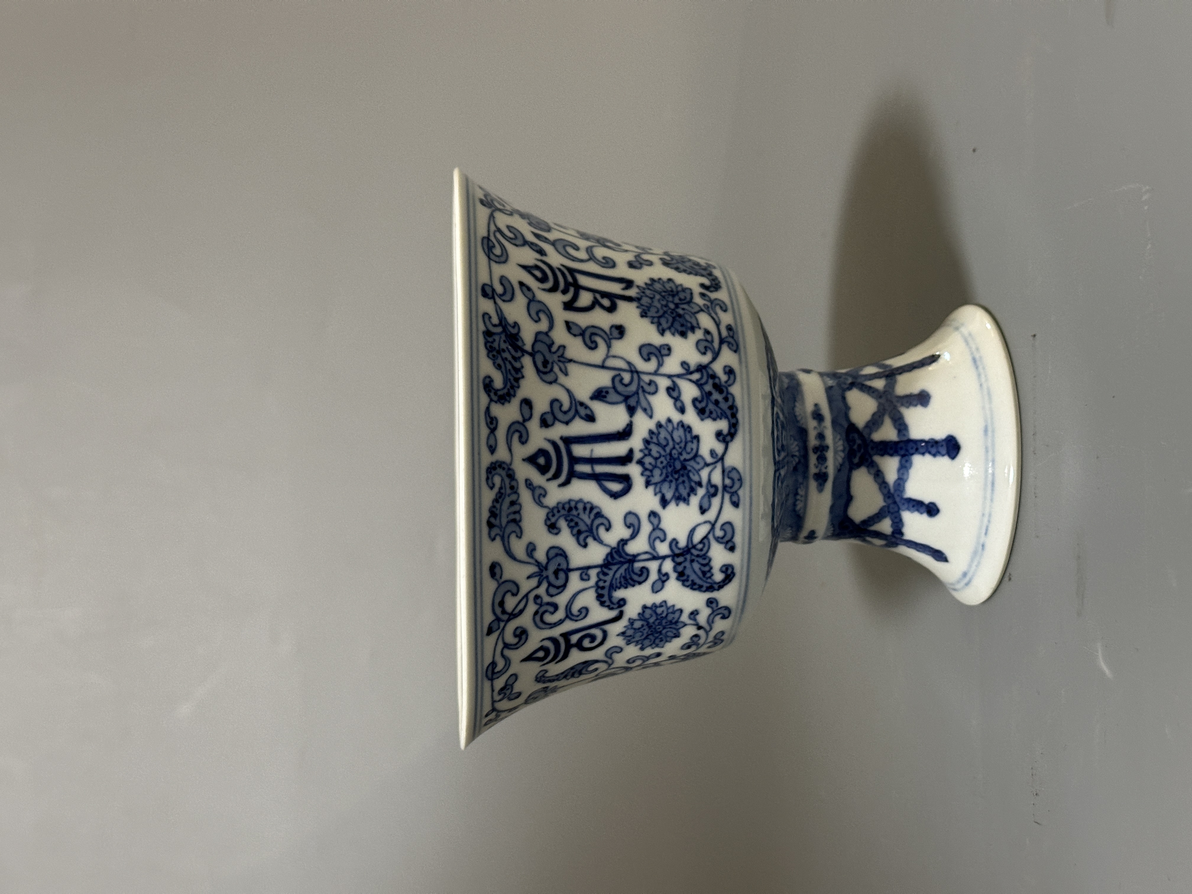 本品為道光禦窯仿宣窯制式,造型雋雅,高足挺拔,器型規整。外壁以青花繪纏枝蓮紋,蓮瓣豐腴飽滿,間飾梵文箴言。內壁底心繪團花如意紋。足脛處飾瓔珞紋,底落 “大清道光年制”書橫款。