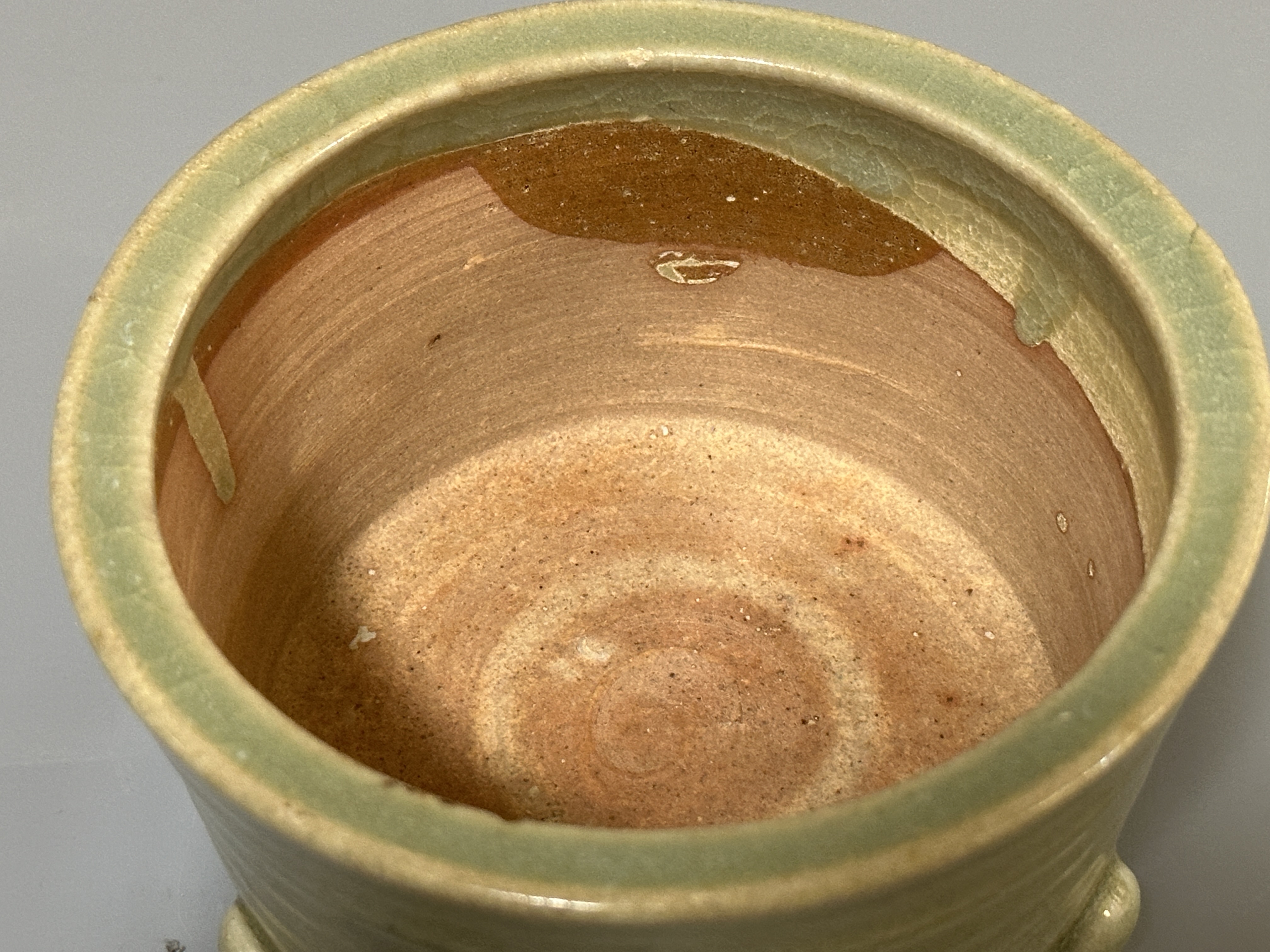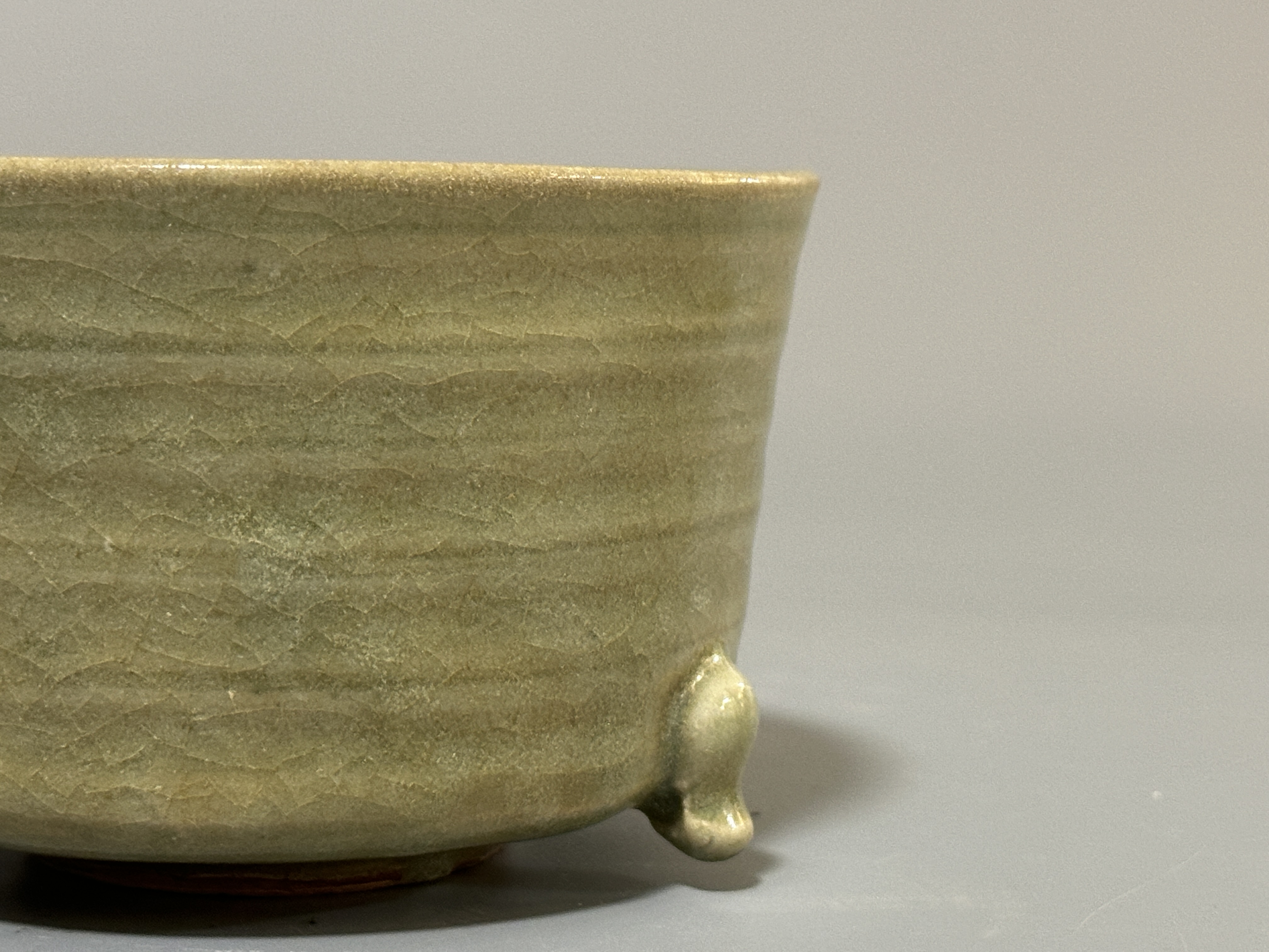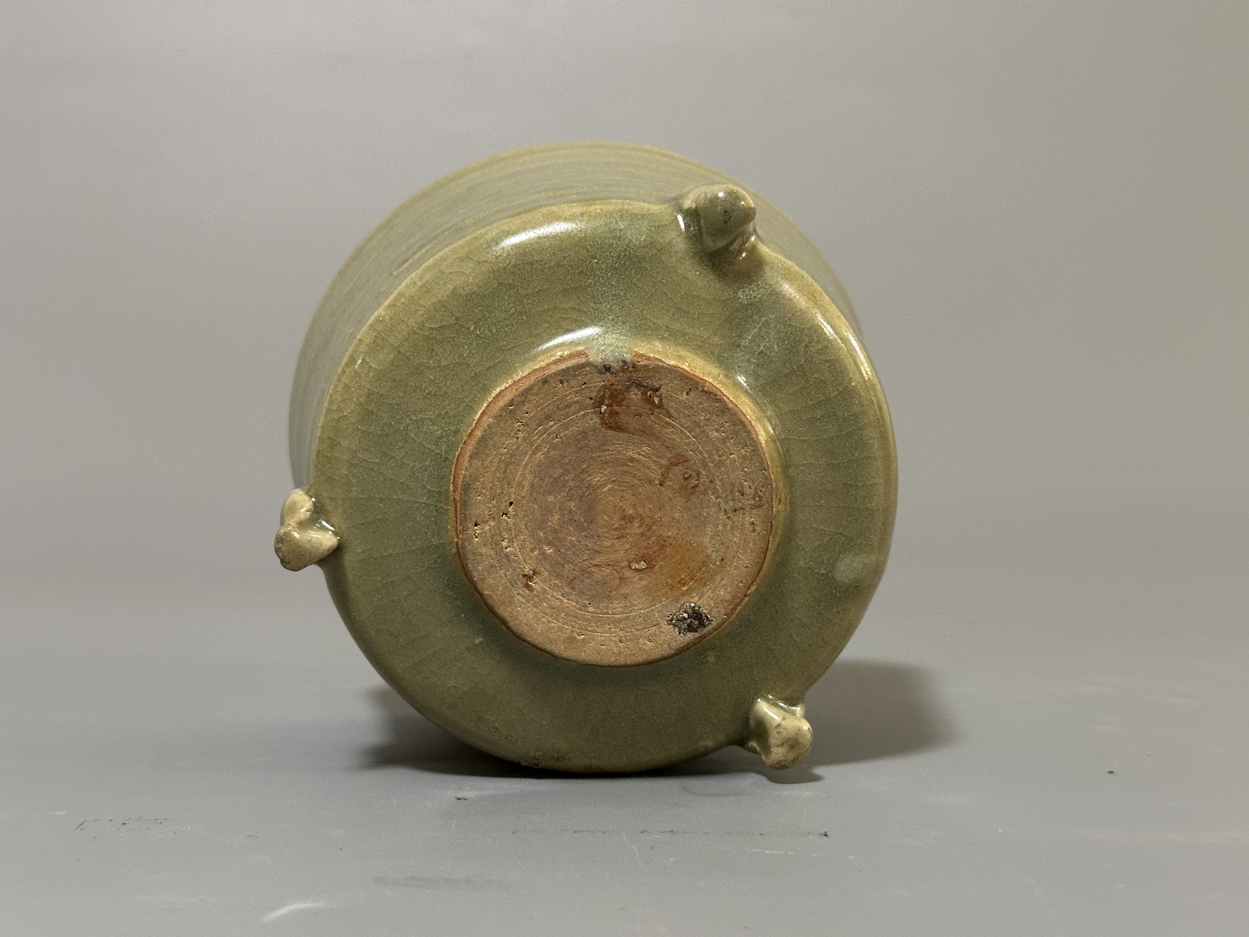 仿商周銅奩之制,作直口折沿、筒形深腹,腹壁飾數道弦紋,簡潔古雅,為元代龍泉窯經典器型;下承三矮足,造型飽滿敦實。通身施青釉,釉色呈溫潤冬青色,釉面開片細密自然,積釉處色濃如碧,露胎處可見火石紅。
