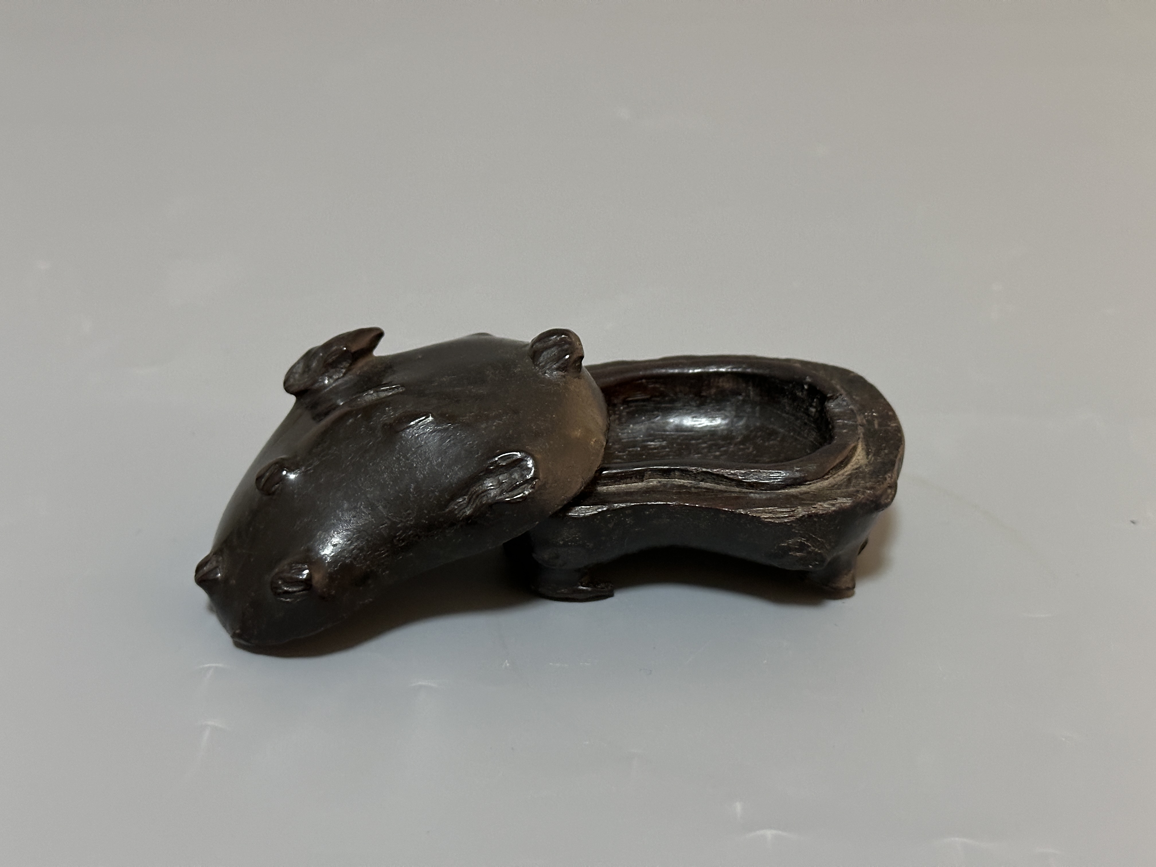 此器取紫檀為材,器表光潤瑩亮,包漿醇厚古雅。盒身與蓋均作透雕梅花紋:虯枝盤曲舒展,花瓣飽滿靈動,孔洞疏朗有致,雕工圓熟,兼具實用與賞玩價值,為案頭清供妙品。此香盒取紫檀根瘤整挖而成,隨形賦意,妙契天然。器足亦借根瘤自然凸起為形,古意盎然。