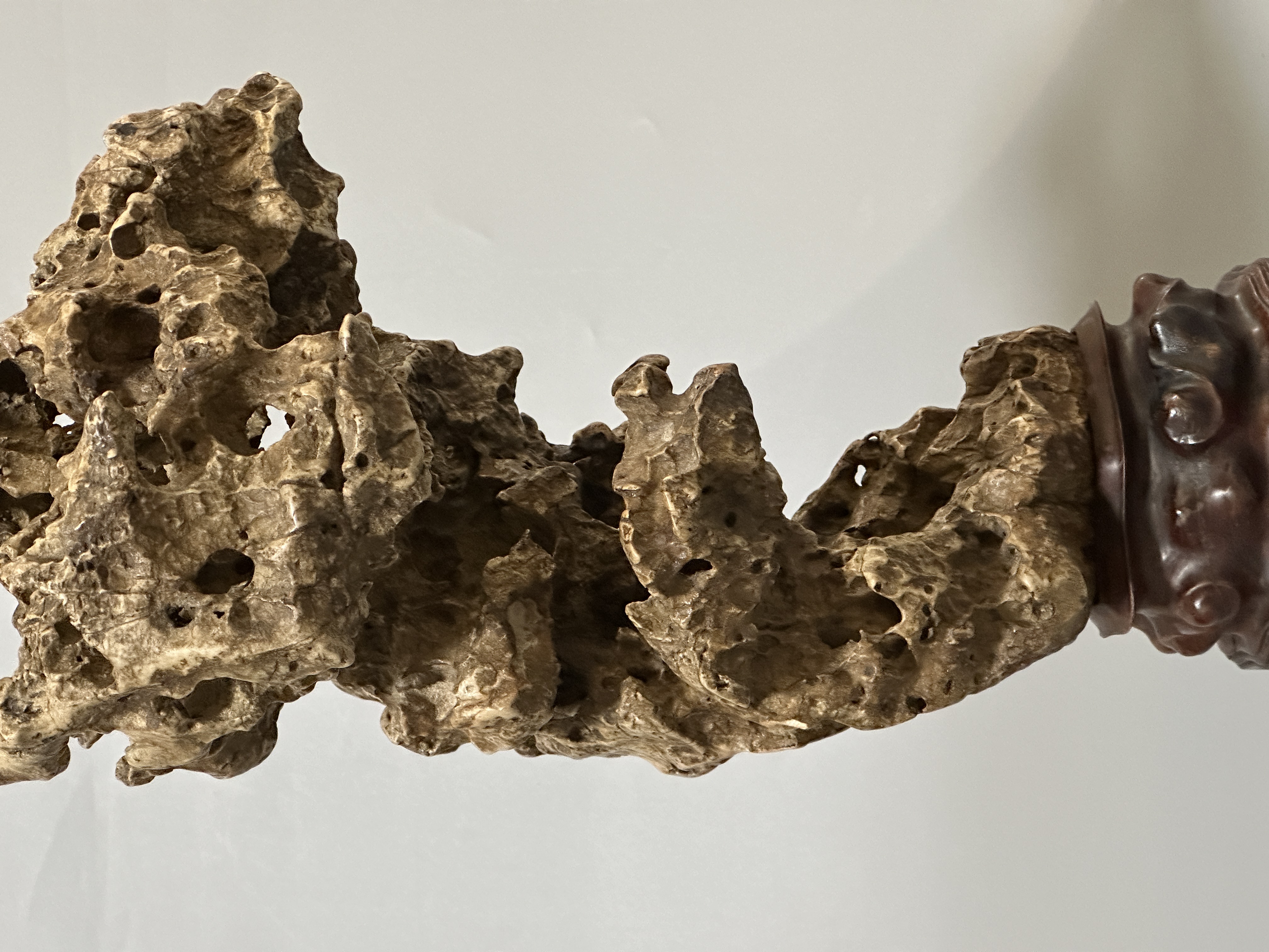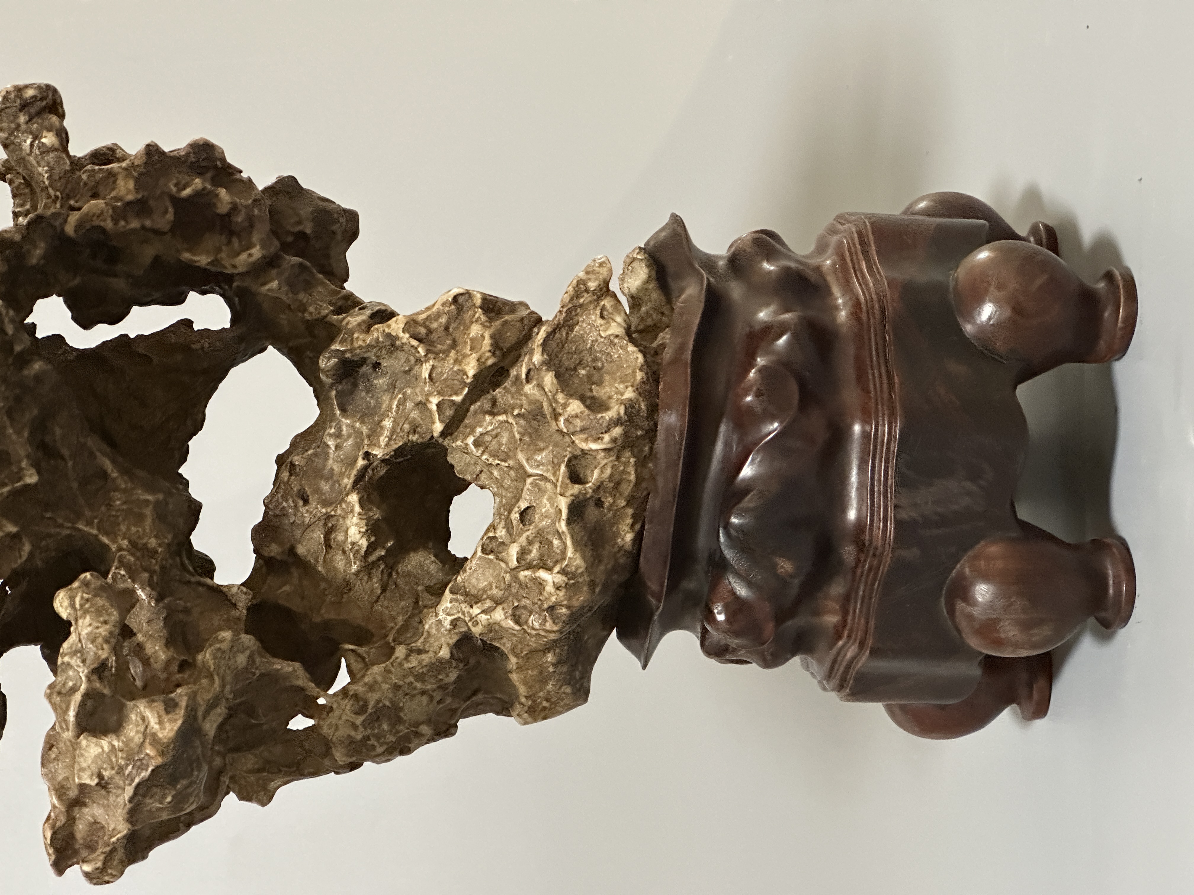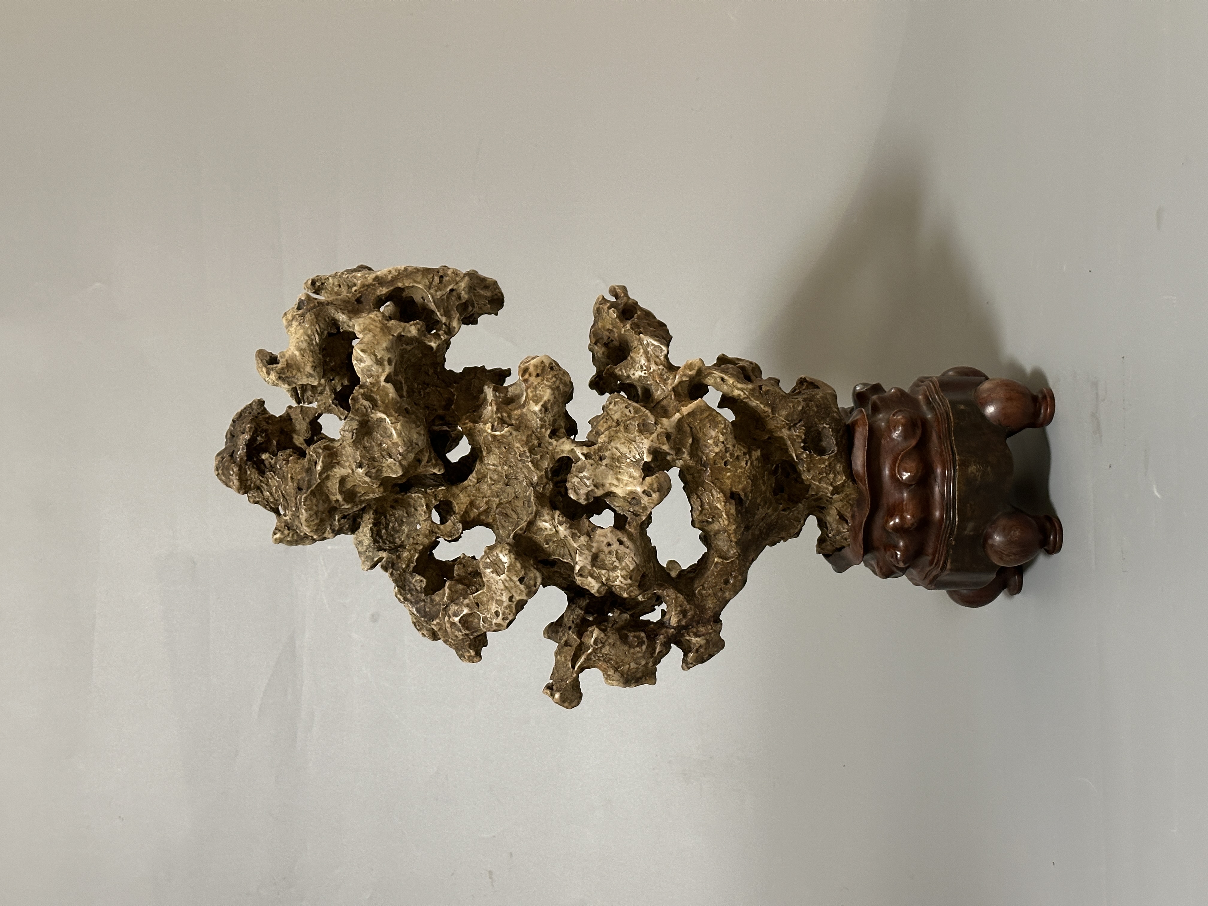 石身纖秀靈動,肌理褶皺層疊,孔洞交錯貫通,虛實相生間盡顯空靈之趣,集 “瘦、皺、漏、透” 之美於一身。配作酸枝木隨形座,雕工古雅,與石體蒼潤質感相得益彰。