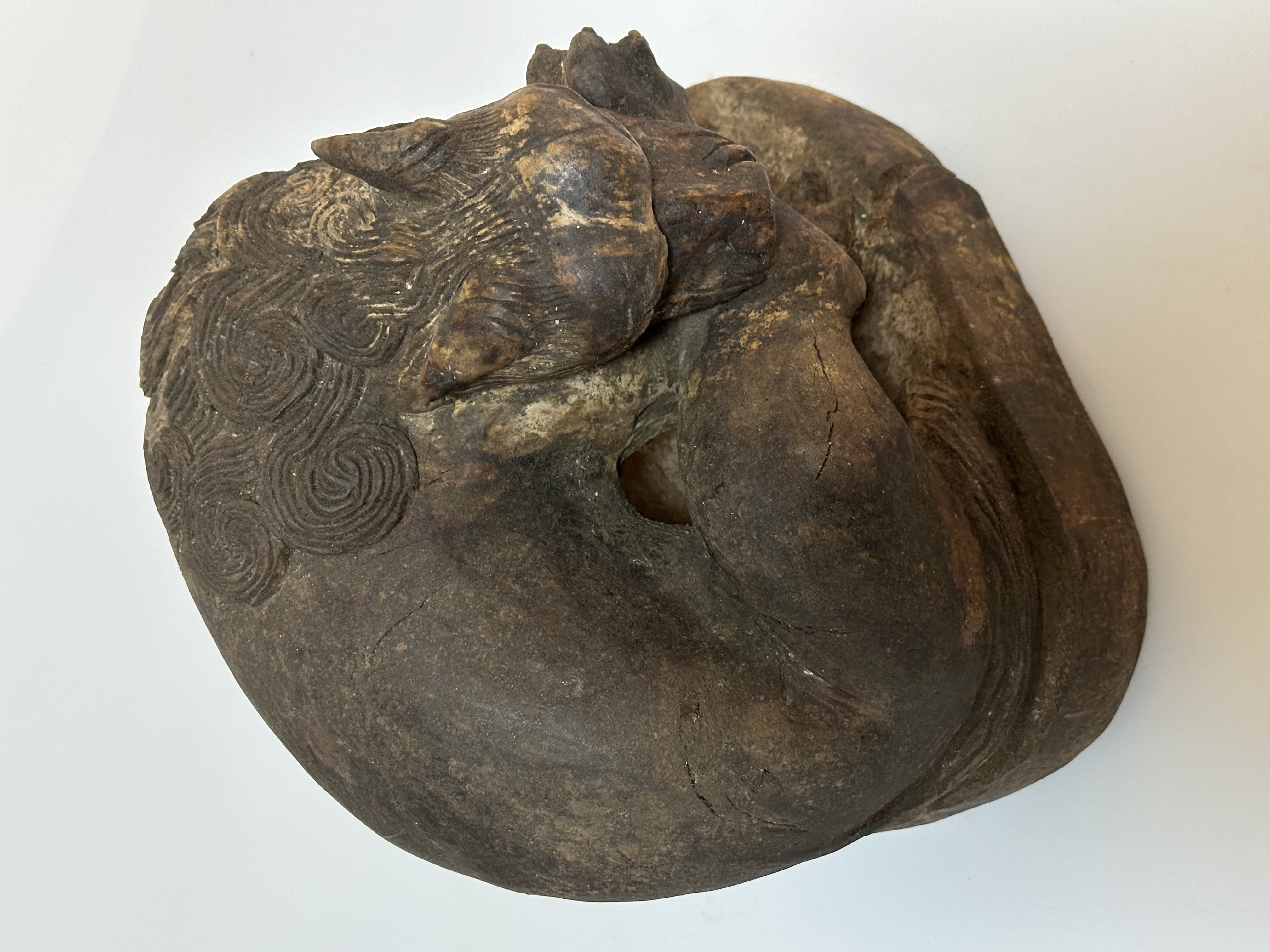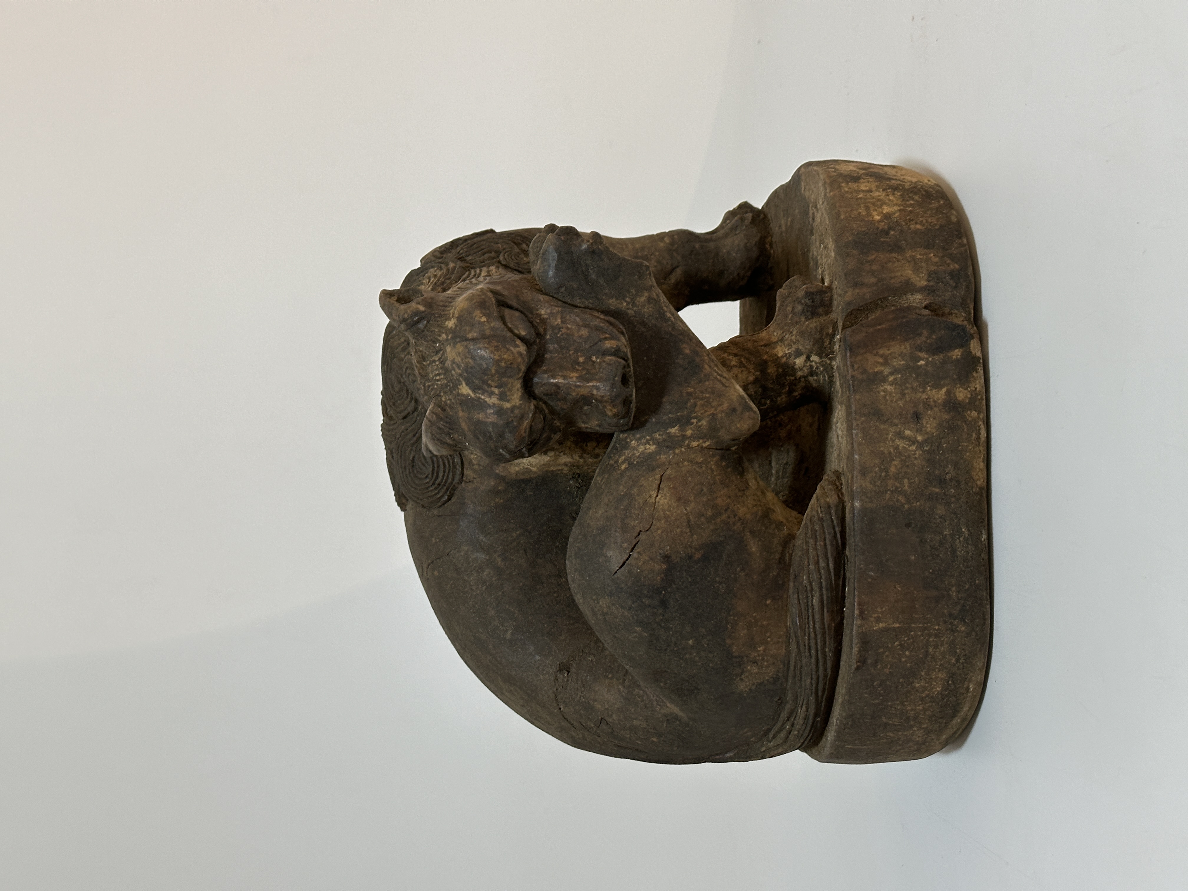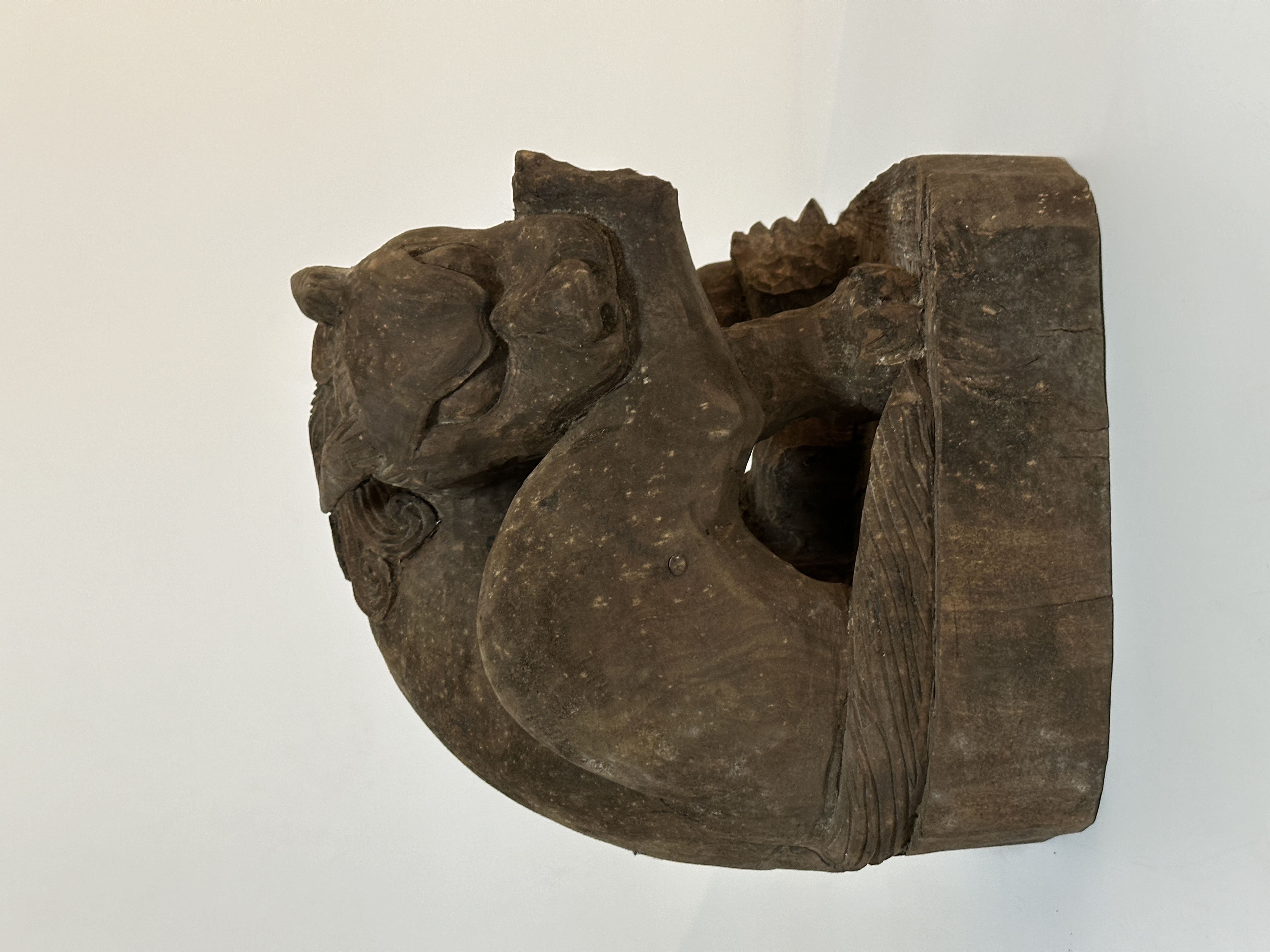 這對遼代木雕啃爪獅為一雌一雄配對,採用深色木料雕琢,呈蹲坐姿態,表面保留自然木紋與古樸包漿,體現北方遊牧民族渾厚飽滿的藝術風格。 兩獅體態壯碩,頭部微低,右前爪抬起置於口中啃咬,尾巴捲曲垂於粗糙木質基座後方,臉龐圓潤生動,眉眼怒張露齒,鬃毛蓬亂捲曲,爪牙鋒利,肌肉隆起肩背寬闊,捕捉啃爪瞬間的靈動力量。 雌獅線條較柔和,雄獅更為粗獷,無彩繪依賴陰刻圓雕與木紋光影,源自佛教護法或墓葬鎮墓獸,受西域影響寓意辟邪自潔護佑聖地,反映契丹審美與遼金木雕工藝,具有極高歷史藝術價值
