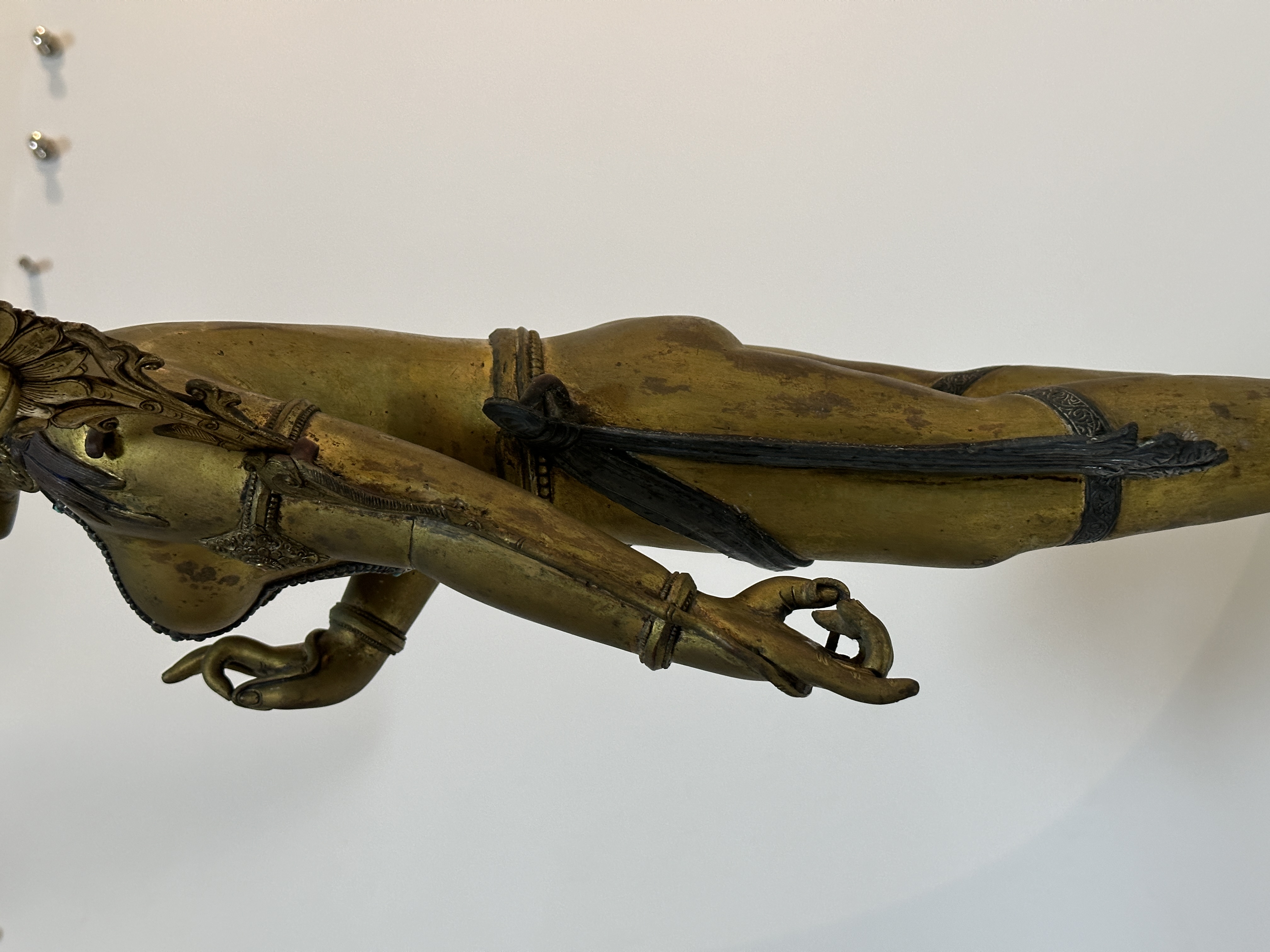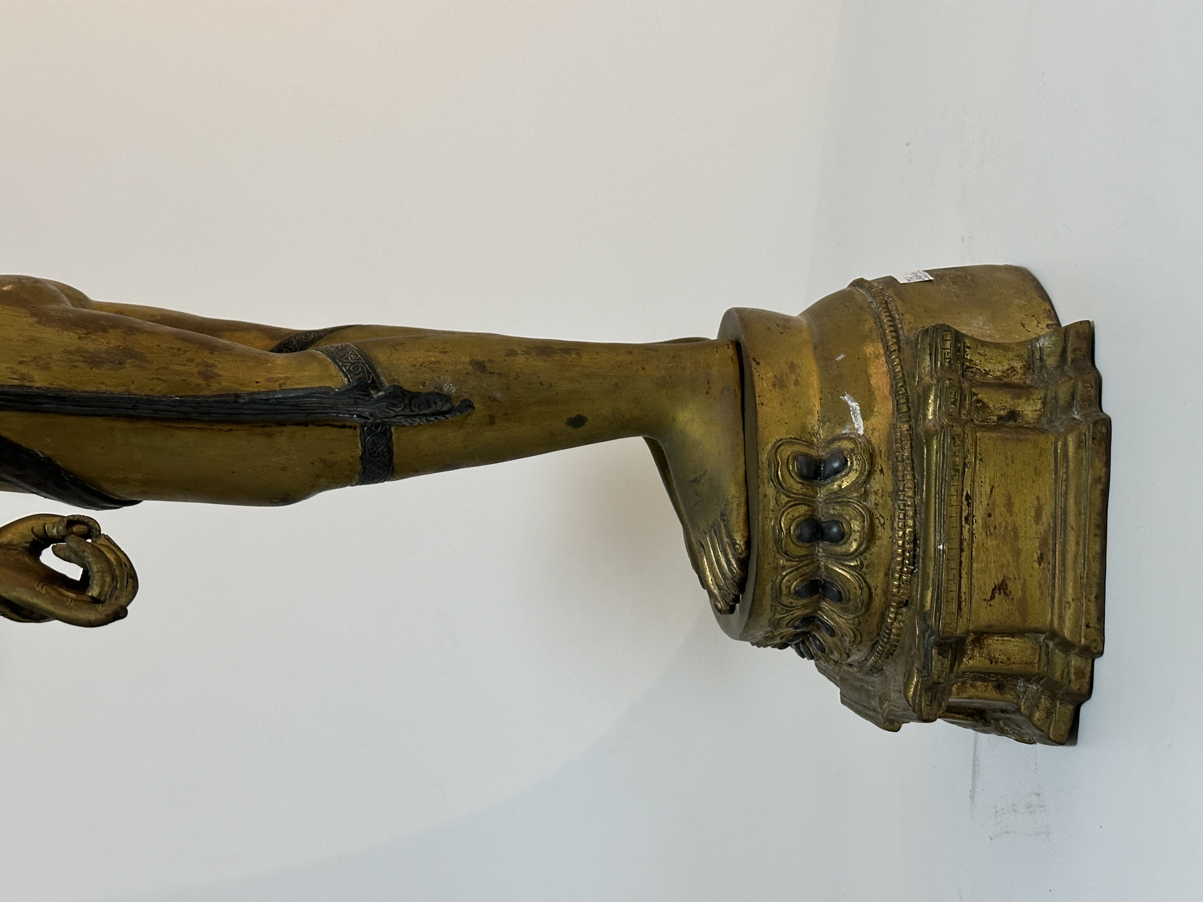 這尊立姿銅鎏金貼蓮花尊為藏傳佛教蓮花手菩薩像,呈優美S形立姿,通體鎏金工藝精湛,頭戴華麗花冠高髻頂飾摩尼寶珠,面容飽滿慈祥細眉長眼微俯視,雙臂釵插蓮花,左手下垂握枝右手當胸虛握,足踏仰覆雙層蓮花座座。銅胎厚重明亮。