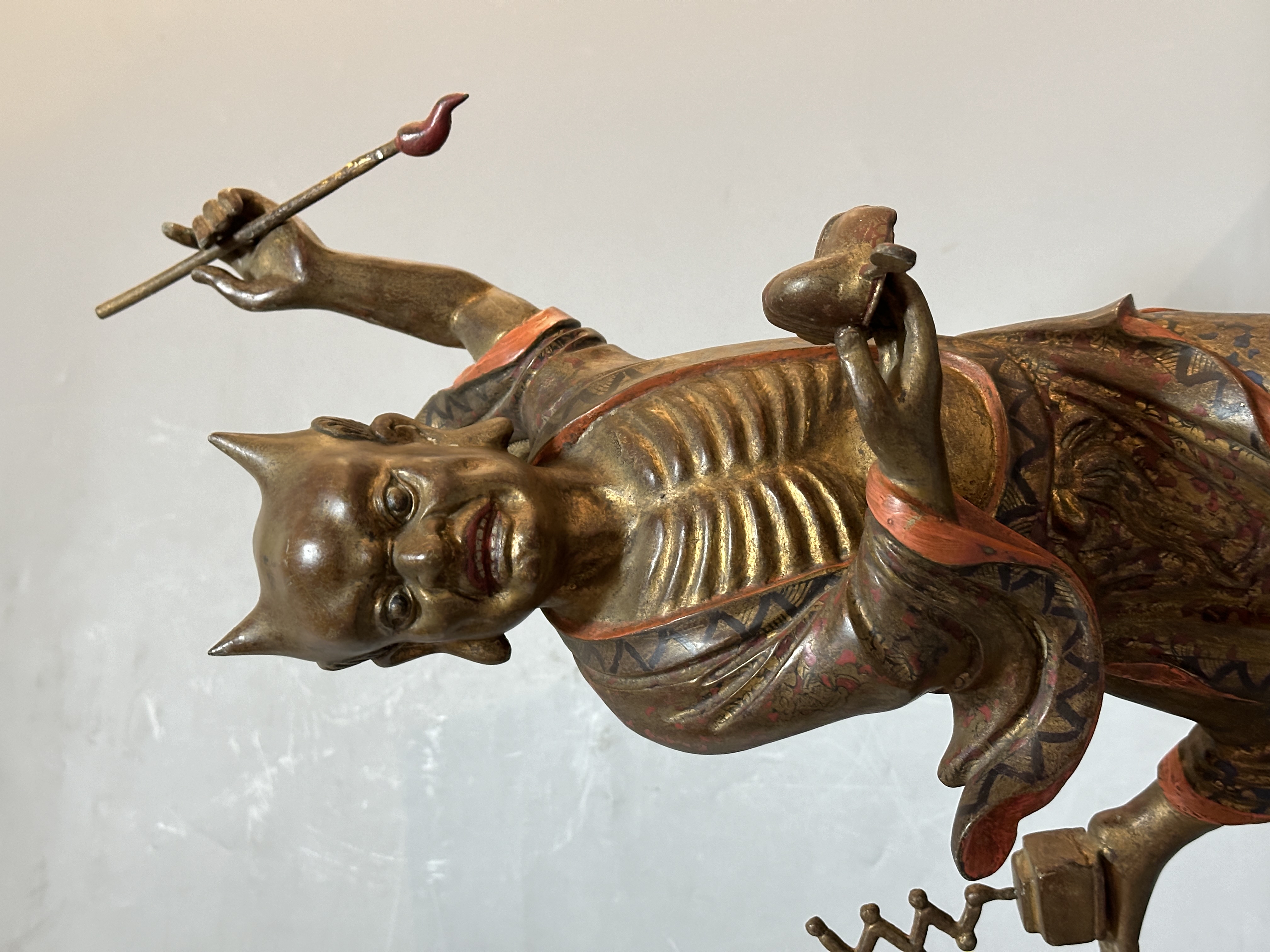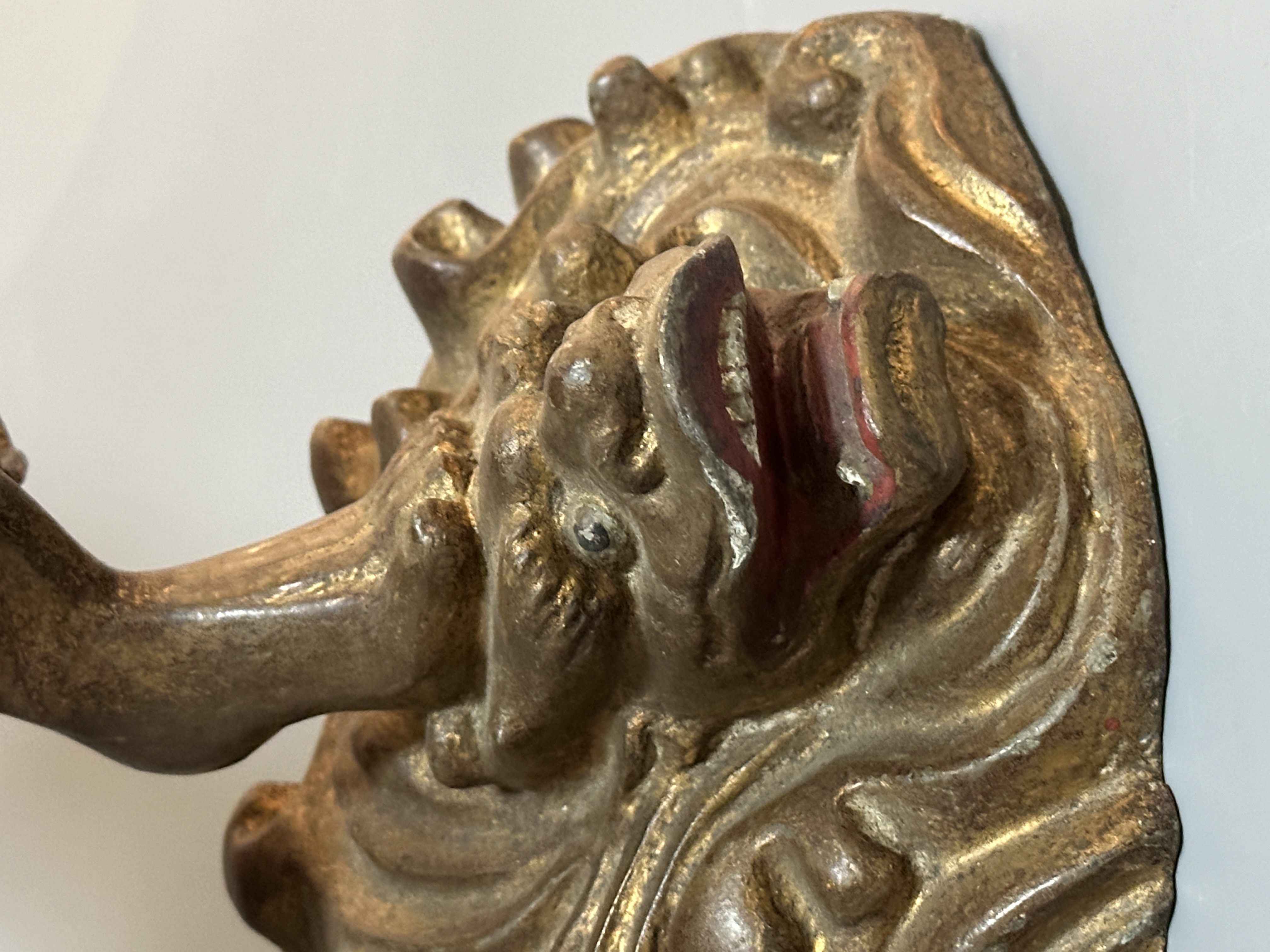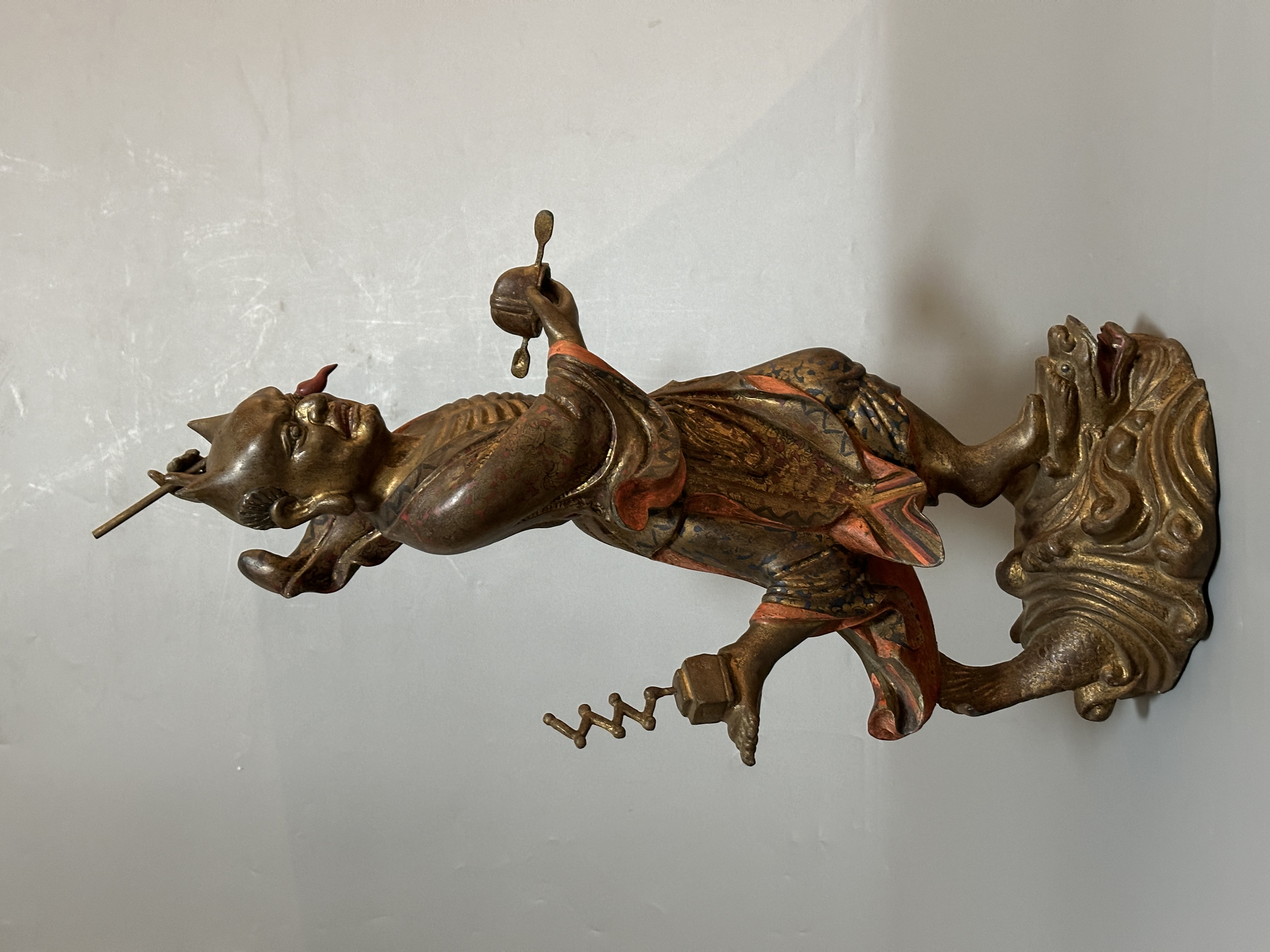 魁星作 “鬼” 形,豹首環目,雙角聳起,衣袂飄舉間顯動感。左手高執朱筆,右手托方鬥,鬥上北斗紋暗合 “踢鬥” 之意;一足踏浪間鼇首,應 “獨佔鰲頭” 之吉。造像漆金填彩,衣紋精美,雖經歲時仍見華彩。